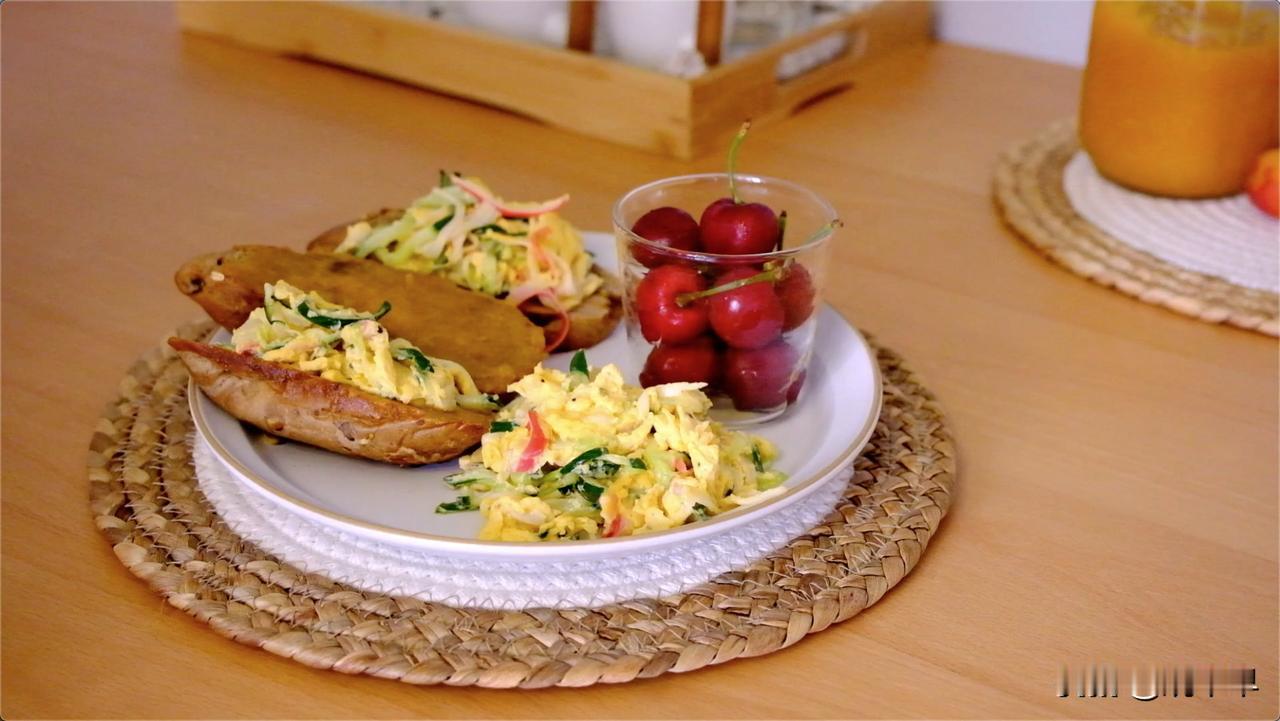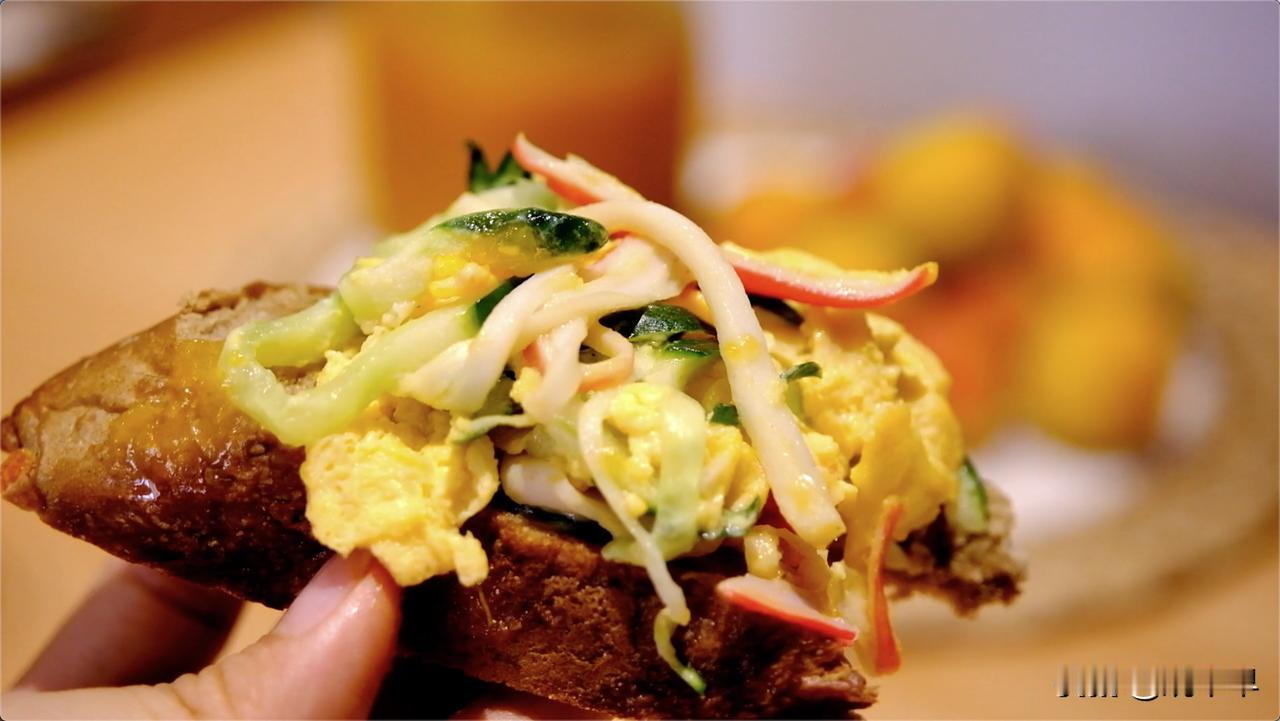 🥪做法分享🥪 1-鸡蛋里加入适量牛奶,搅拌均匀 2-加入青瓜丝、蟹柳丝、黑胡椒粉、适量盐 3-搅拌均匀后放入锅里,炒熟 4-粗粮面包切厚片,放进烤箱烤2分钟 5-把炒好的青瓜鸡蛋丝叠在粗粮面包上 一道高颜值低热量的减脂餐大功告成✌️