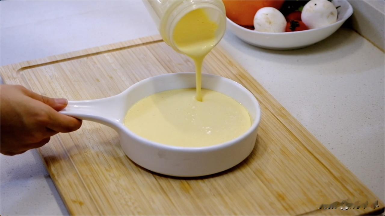 3⃣️烤盘底部刷上一点点油,把豆腐液倒进去,烤箱190度烤20分钟