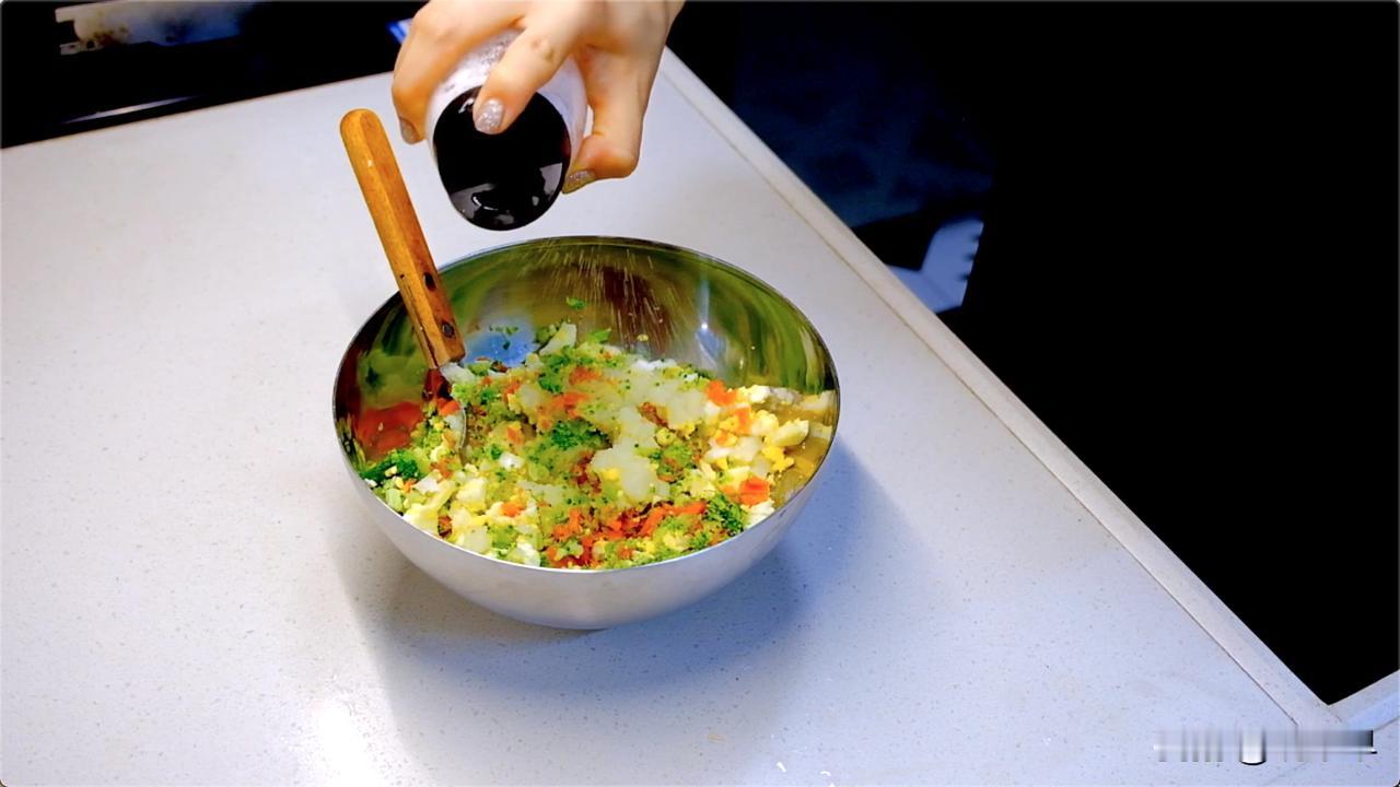 2-加入一个水煮蛋,加入盐、黑胡椒粉(也可以加入一点沙拉酱调味)