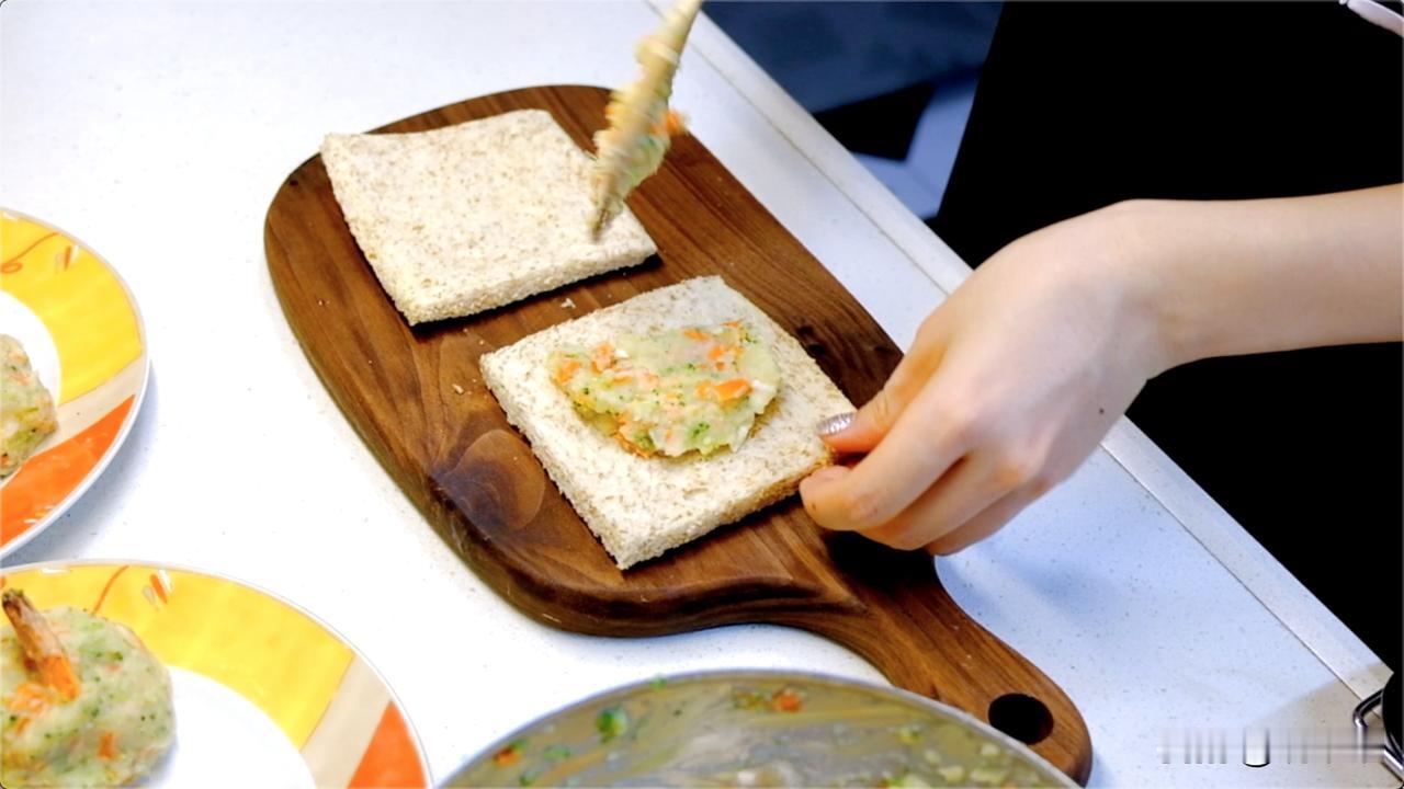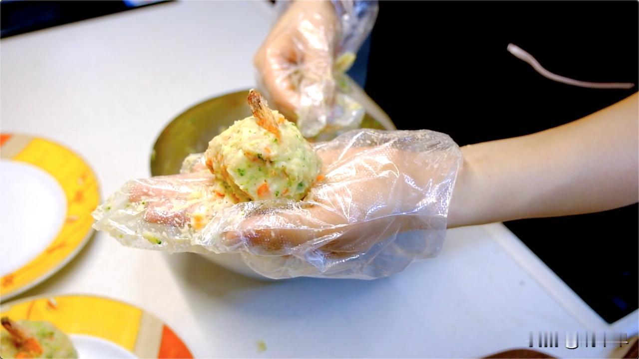 3-煎熟几个虾,虾尾朝外,用土豆泥包裹住虾的身体,捏成一个圆球状