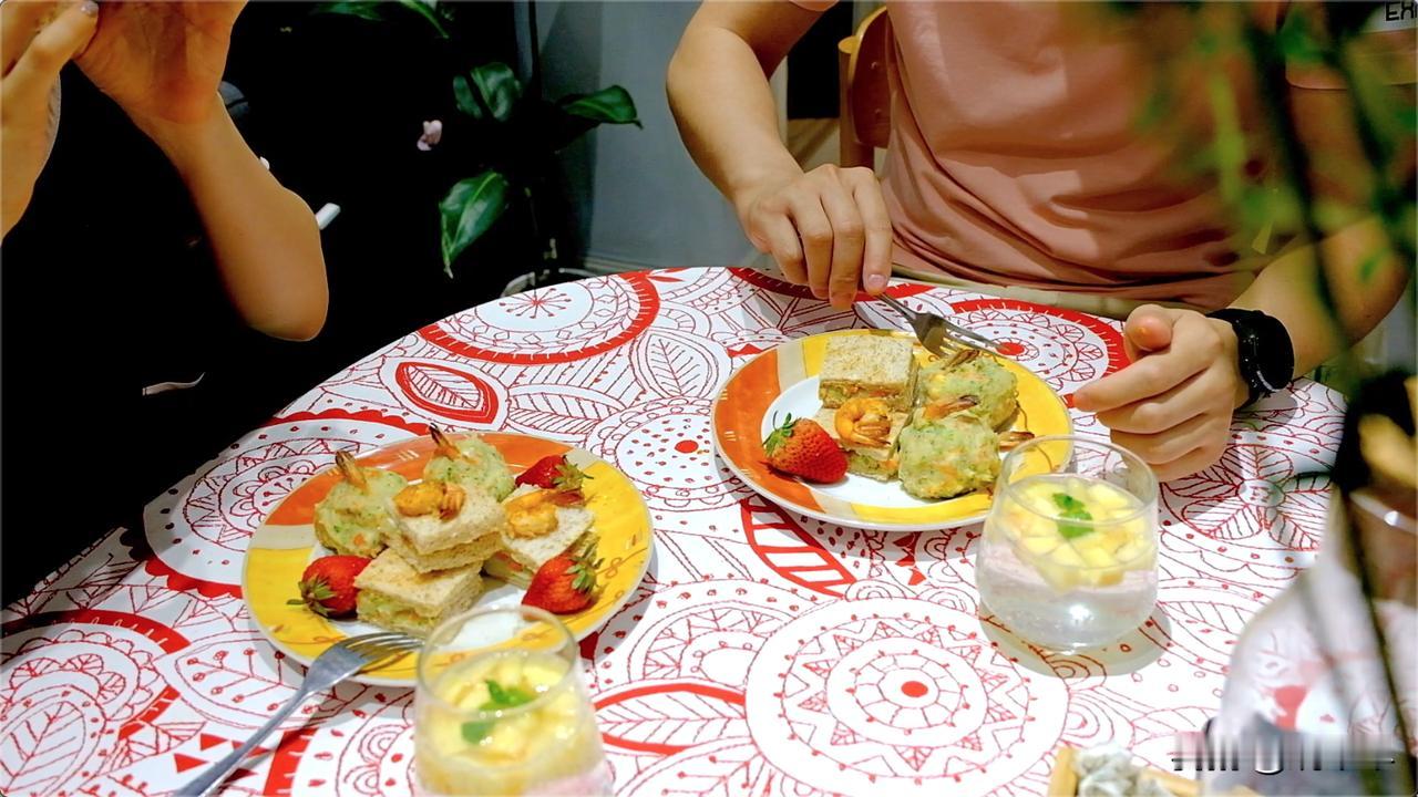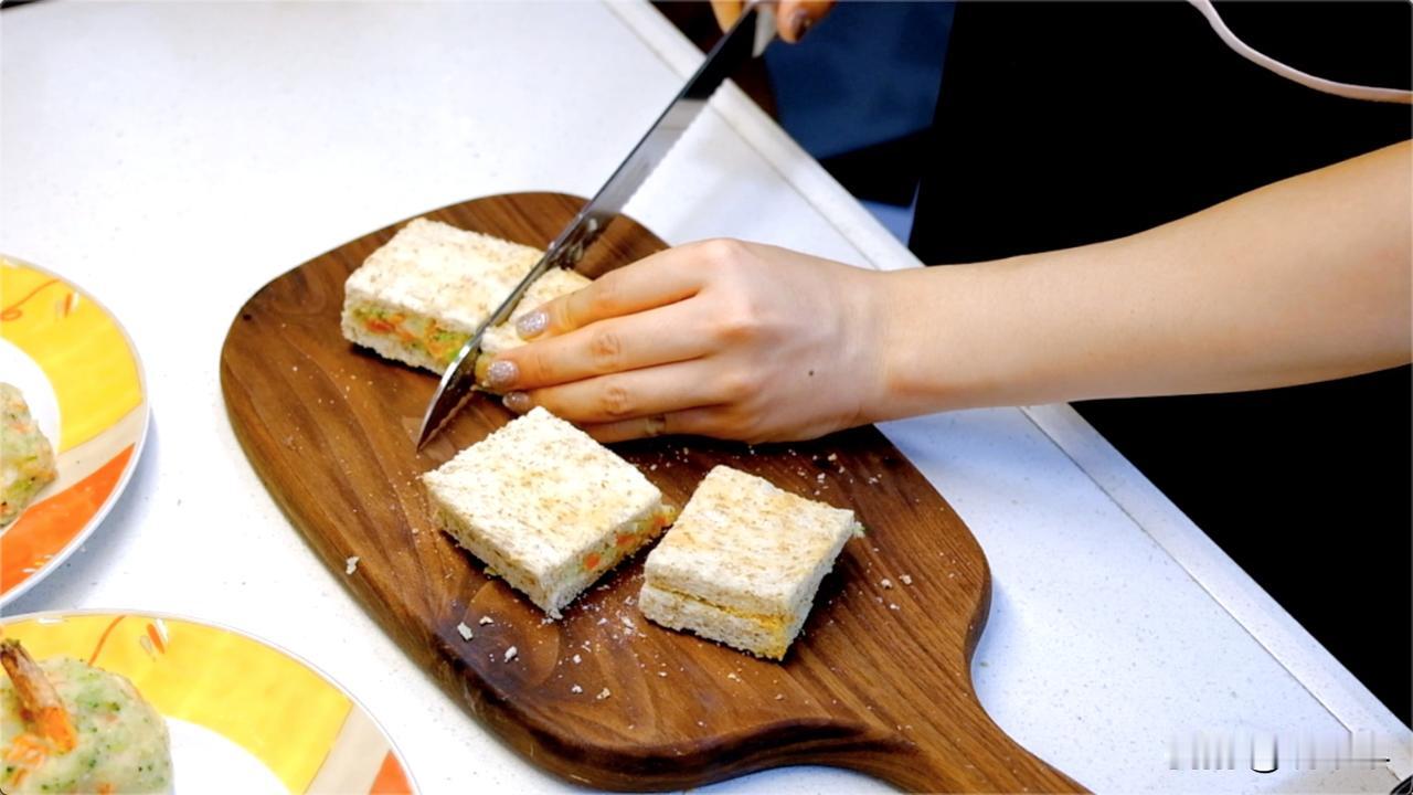 5-稍微压一下,然后用小刀把三明治切成四小块,既好看又方便入口