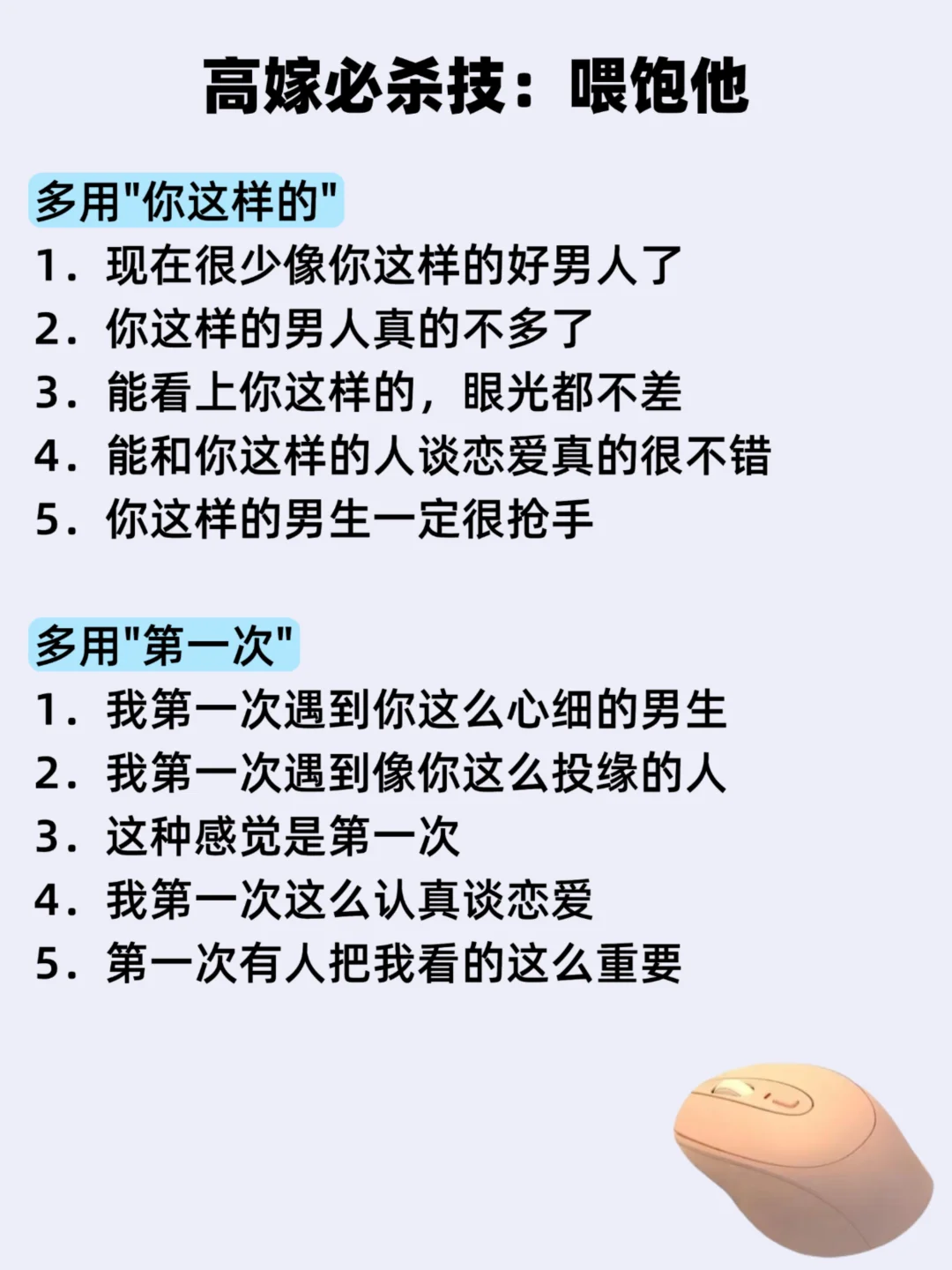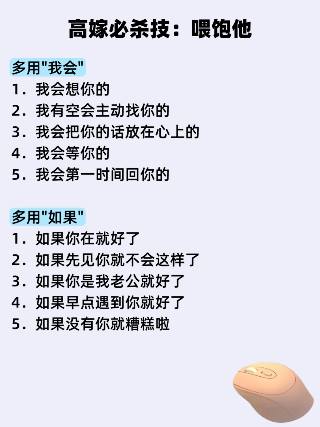 多用"我会" 1.我会想你的 2.我有空会主动找你的 3.我会把你的话放在心上的 4.我会等你的 5.我会第一时间回你的 一切痛苦,都是你不懂人性。 一切贫穷,都是你不懂商战。 一切迷茫,都是你不懂规律。 智慧的女人永远知道 学习是最值得的投资 ✅学人性,破人关 ✅学商战,破钱关 ✅学情感,破情关 ✅学智慧,破生死关 欢迎靠近我,学习更多炸裂干货!
