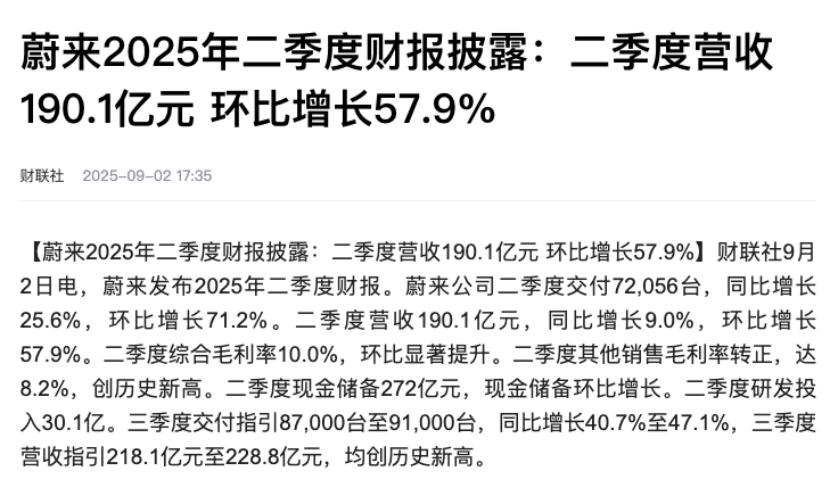 蔚来2025年二季度财报及电话会议传递出明确的盈利预期,公司CFO曲玉在电话会议中披露,四季度将力争实现盈亏平衡,核心支撑在于两款旗舰车型的毛利率表现与成本控制成效。 曲玉认为,依靠过去十年纯电技术积累、关键零部件自研及持续的采购与成本控制措施,蔚来在乐道L90与全新ES8等旗舰车型上实现了“产品竞争力与成本优化”的双重突破。基于此,公司设定四季度目标:乐道L90与全新ES8毛利率达到20%,整车毛利率实现16%-17%,以此推动公司达成盈亏平衡目标。 这一盈利目标的设定并非空谈,二季度公司已展现出显著的成本优化成果。李斌在电话会上提到,通过基于基本经营单元机制的全面降本增效,二季度经营亏损环比收窄超30%,同时整车毛利率保持稳健,其他业务毛利率实现显著突破,为后续盈利提升构建了坚实基础。 从产品节奏来看,四季度乐道L90与全新ES8将实现完整季度交付,两款车型的市场热度为毛利率目标提供保障——乐道L90首月交付破万且订单超预期,全新ES8尚未交付已获媒体与用户高度认可,李斌称其“满足用户‘兴业、怡家、悦己’全场景需求”,具备较强的定价与盈利空间。