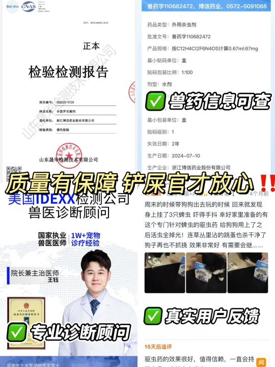 自己之前刚养狗的时候怕那便宜的狗狗用了会刺激皮肤不舒服啥的,所以就挑那种大牌温和一点的,感觉用着也放心 但是一个月加上内驱一两百 俺这种一月三四千工资的牛马打工人真的会蚌埠住的😭😭 现在做足功课之后追求的就是一个平价养狗法 -- 其实挑驱虫这个事儿并不难,做好功课不跟风盲入就可以了 俺家小咩现在用的这个驱虫就是我精挑细选出来的,当时是看中whycat它家用的这个大牌同款非泼罗尼成分 比较温和 还不用担心狗狗不配合🫶🏻 之前小咩跑到草丛里玩,毛毛里沾的都是小跳蚤,就给它滴了一个这个外驱,第二天醒来就发现了好多掉下来的跳蚤尸体😖 又给它浑身上下检查了一遍,驱的挺干净的,而且也没出现刺激烧皮掉毛的情况 当时也有特意了解这个牌子,质量保障这一块儿自己是挺放心的,兽药认证、检测报告都是可以查到的✅ — 小咩直接用的它家一套,搭配着用还能预防着体内外十几种寄生虫,一步到位自己用着也省了不少事儿💪🏻 性价比也是绝啦!一支才10来块,对比一样成分那些五六十一支的进口大牌就要划算很多,用起来也是真的香🤭 这些都是自己的一些个人经验,有需要的可以参考一下,还没挑好的铲屎官可以先看看小咩用的这个,驱虫做好了,狗狗身上没虫精神也能好很多🤗 浙兽药广审(文)2025040301 浙兽药广审(文)2025040813