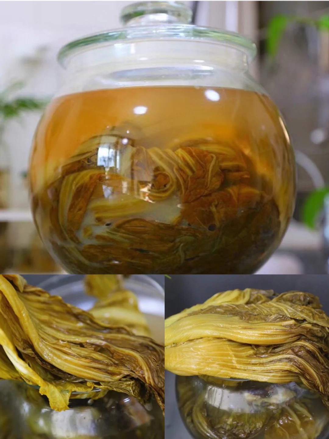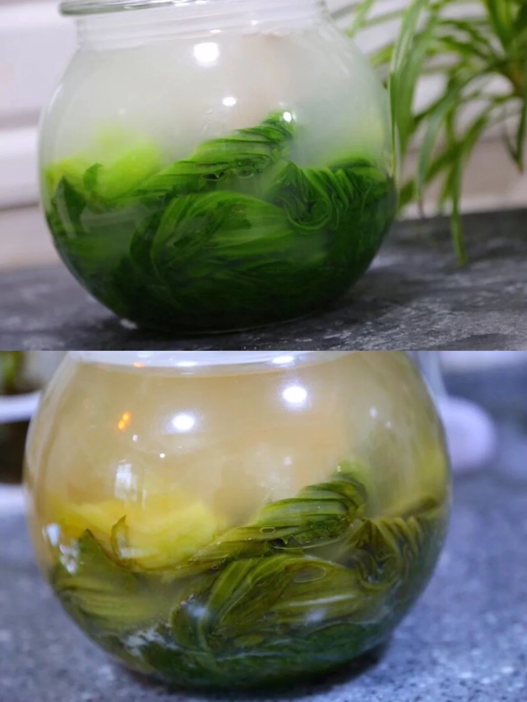 14.这是九天左右的颜色,已经完全不一样了是吧 其实一个星期左右就差不多了,我呀有事情耽误了就放在那没管,拿出来看看,超级美的颜色是不是 15.光看着就冒酸水儿啦,我咬了一点,除了酸味儿还差一点 脆度太完美,当然每个人对酸的敏感度不一样 炒菜吃足够,但是酸菜鱼的话建议还可以多放几天 今天我只用了一些,随吃随拿,剩余的继续用石头压着就行 而且这个米汤还可以做老酸汤 下次腌制的时候时间就会缩短很多哦 具体的根据实际情况来哈