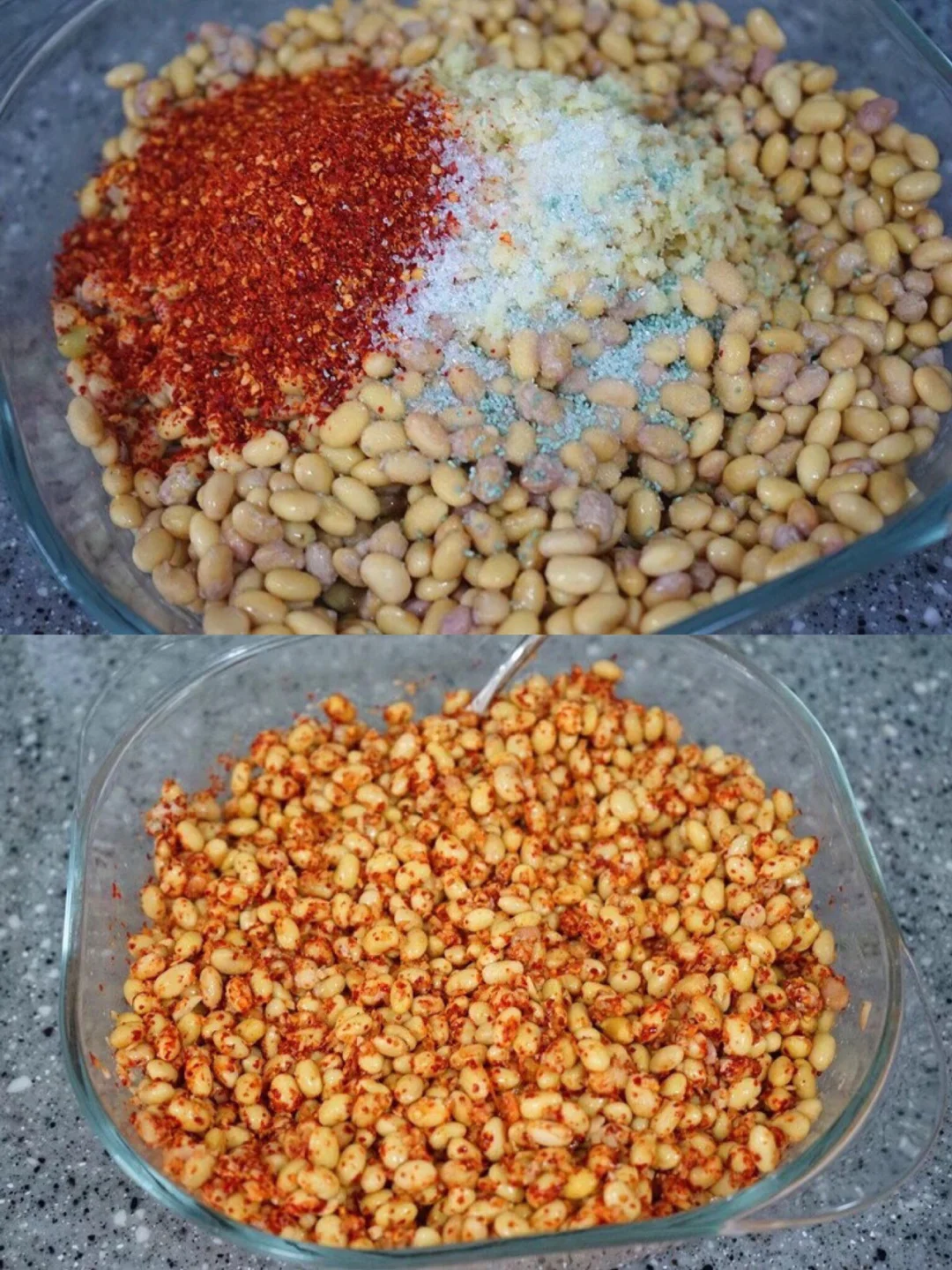 10.我喜欢辣一点的口味 所以自己买的特辣的魔鬼辣椒回来自己打磨成辣椒面11.辣椒面和姜糜倒入到发酵好的黄豆上