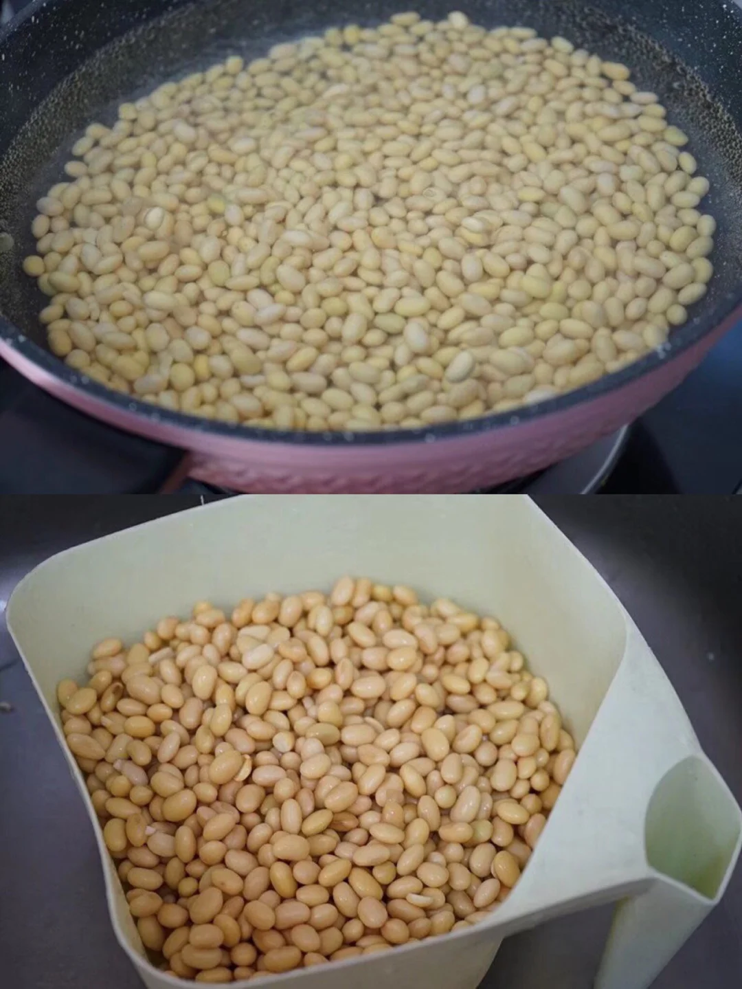 5.锅里放入多一点的水,黄豆倒进去 我是直接普通锅煮了大概二十多分钟【个人觉得硬一点口感好一点,太软不好吃】如果高压锅或者电压力锅十来分钟就可以差不多哈
