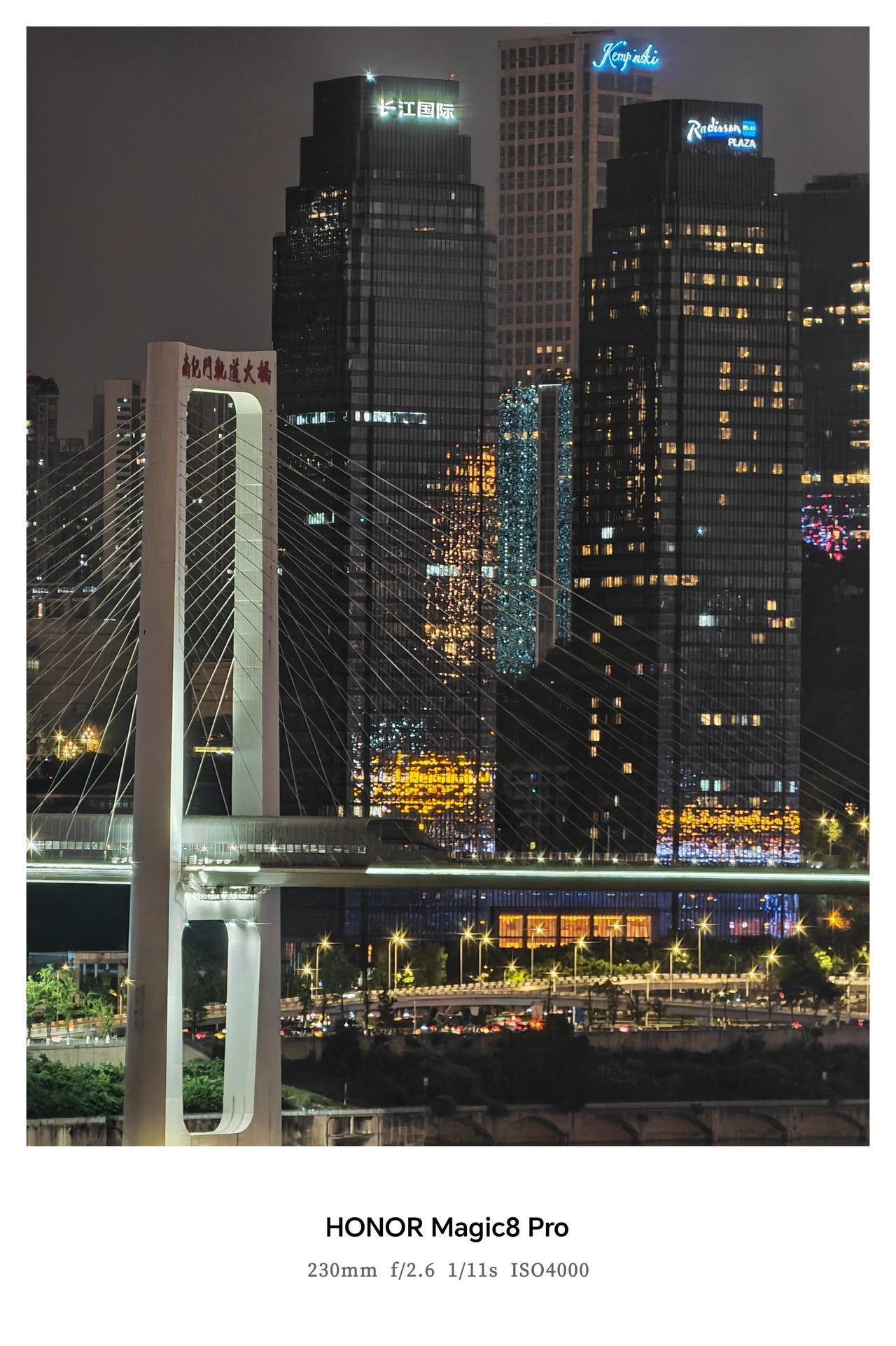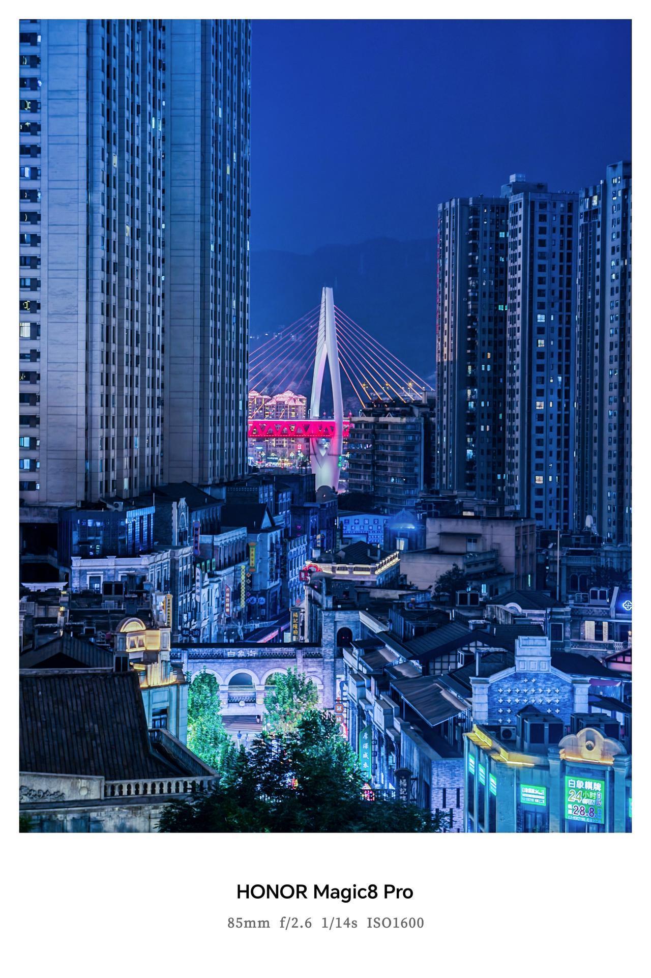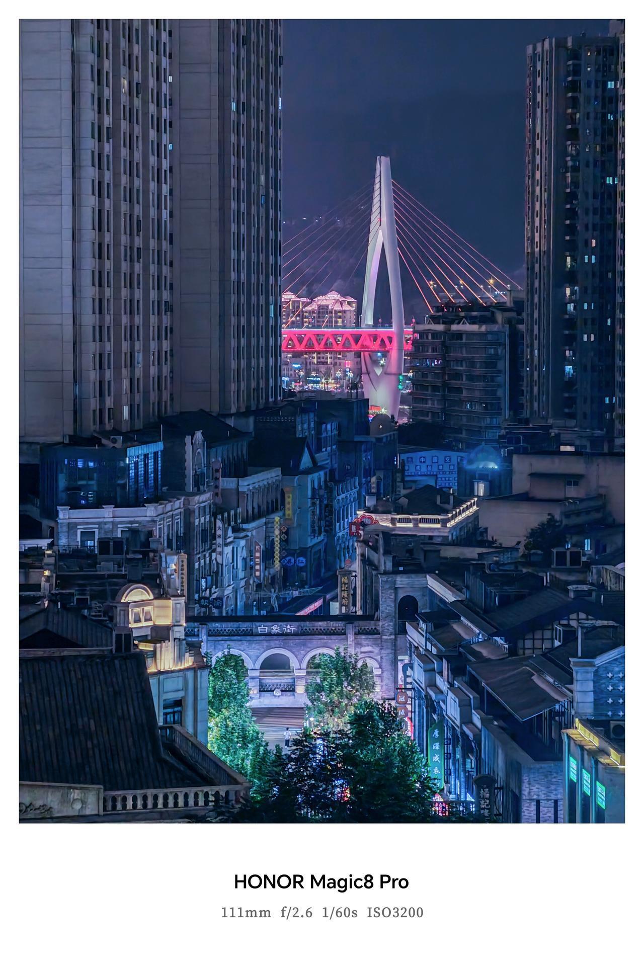 国庆假期结束,正式进入“赛博返工”模式。整理了一下在重庆拍的夜景,不得不感叹现在手机影像的进化速度。 重庆的夜景,挑战的就是设备在复杂光线下的长焦和防抖能力。这次全程主力机是荣耀Magic8,它的荣耀2亿超夜神长焦给了我很大惊喜。在高处手持拍摄,即使拉到高倍变焦,CIPA 5.5级的防抖也压得住画面,成片率极高。 最关键的是画质,远处的建筑细节和光影层次都保留得很好,没有粗暴提亮导致的噪点,整个画面非常通透干净。这种古今建筑横跨时空对话的场景,终于能被手机清晰记录下来了。 假期戒断反应?不存在的,看亿遍照片就行了。