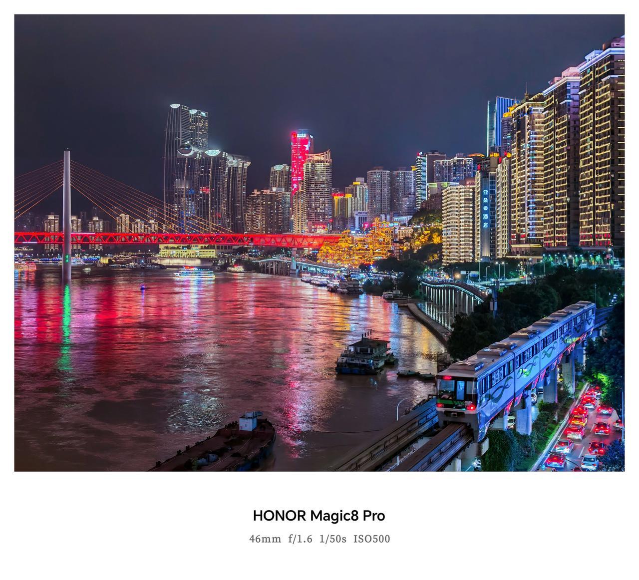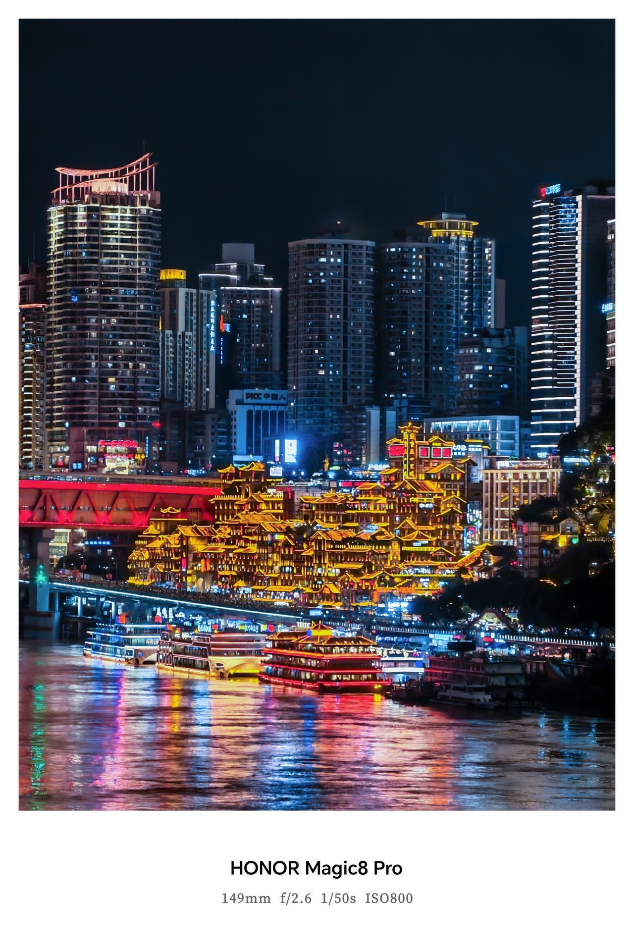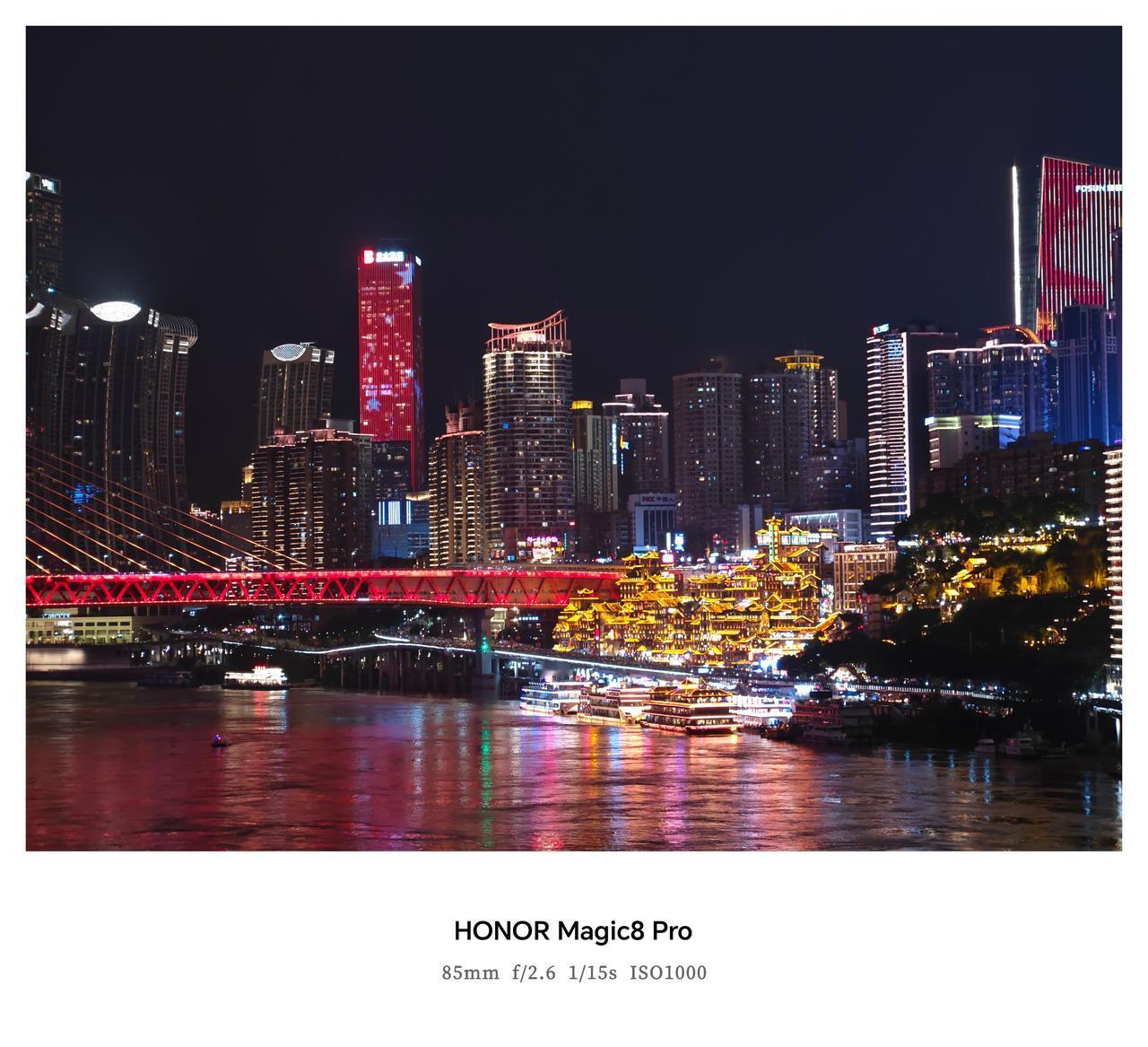 国庆假期结束,正式进入“赛博返工”模式。整理了一下在重庆拍的夜景,不得不感叹现在手机影像的进化速度。 重庆的夜景,挑战的就是设备在复杂光线下的长焦和防抖能力。这次全程主力机是荣耀Magic8,它的荣耀2亿超夜神长焦给了我很大惊喜。在高处手持拍摄,即使拉到高倍变焦,CIPA 5.5级的防抖也压得住画面,成片率极高。 最关键的是画质,远处的建筑细节和光影层次都保留得很好,没有粗暴提亮导致的噪点,整个画面非常通透干净。这种古今建筑横跨时空对话的场景,终于能被手机清晰记录下来了。 假期戒断反应?不存在的,看亿遍照片就行了。