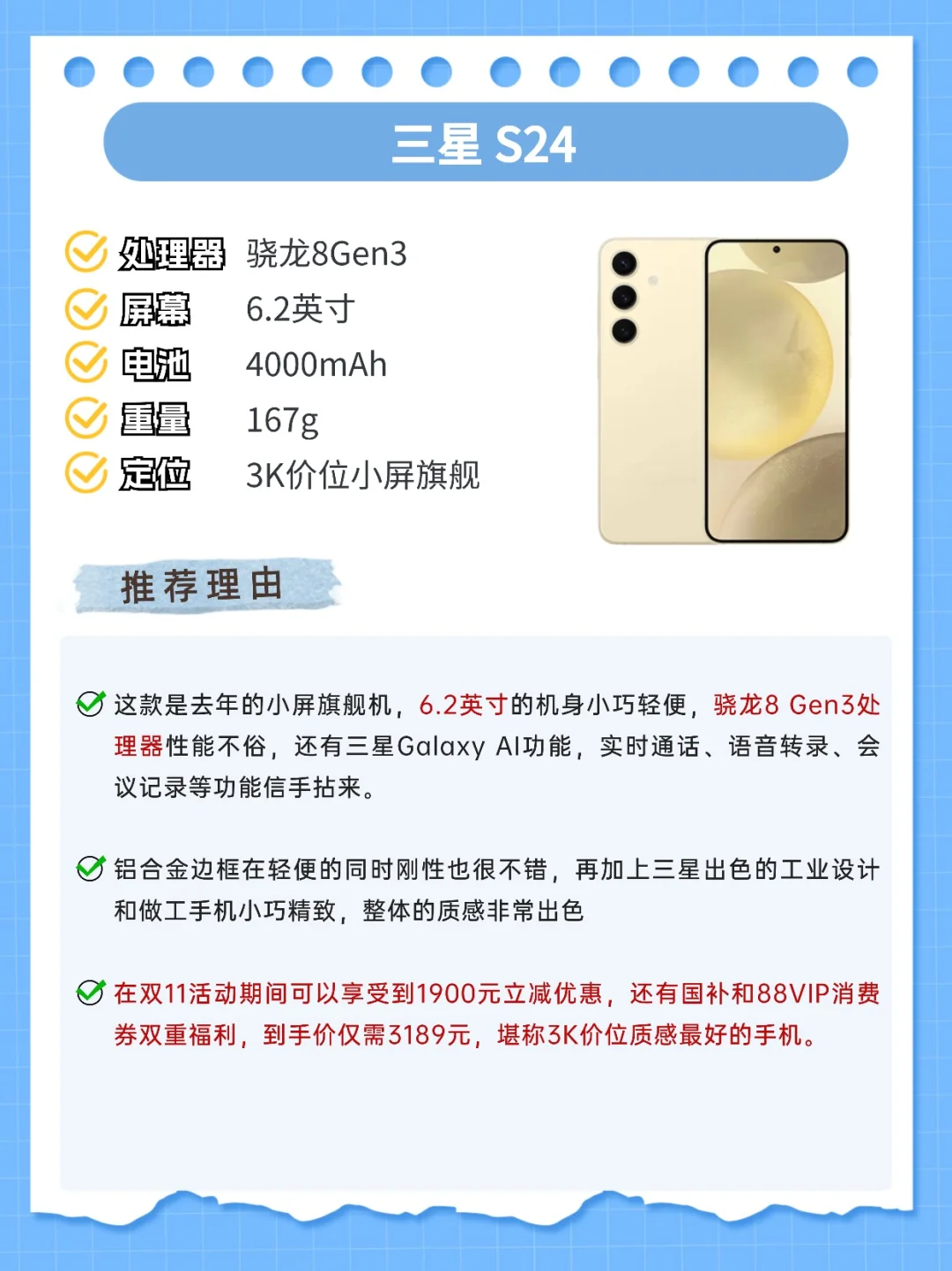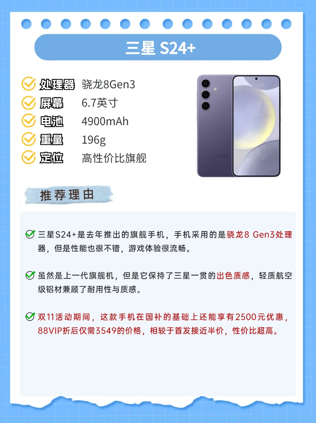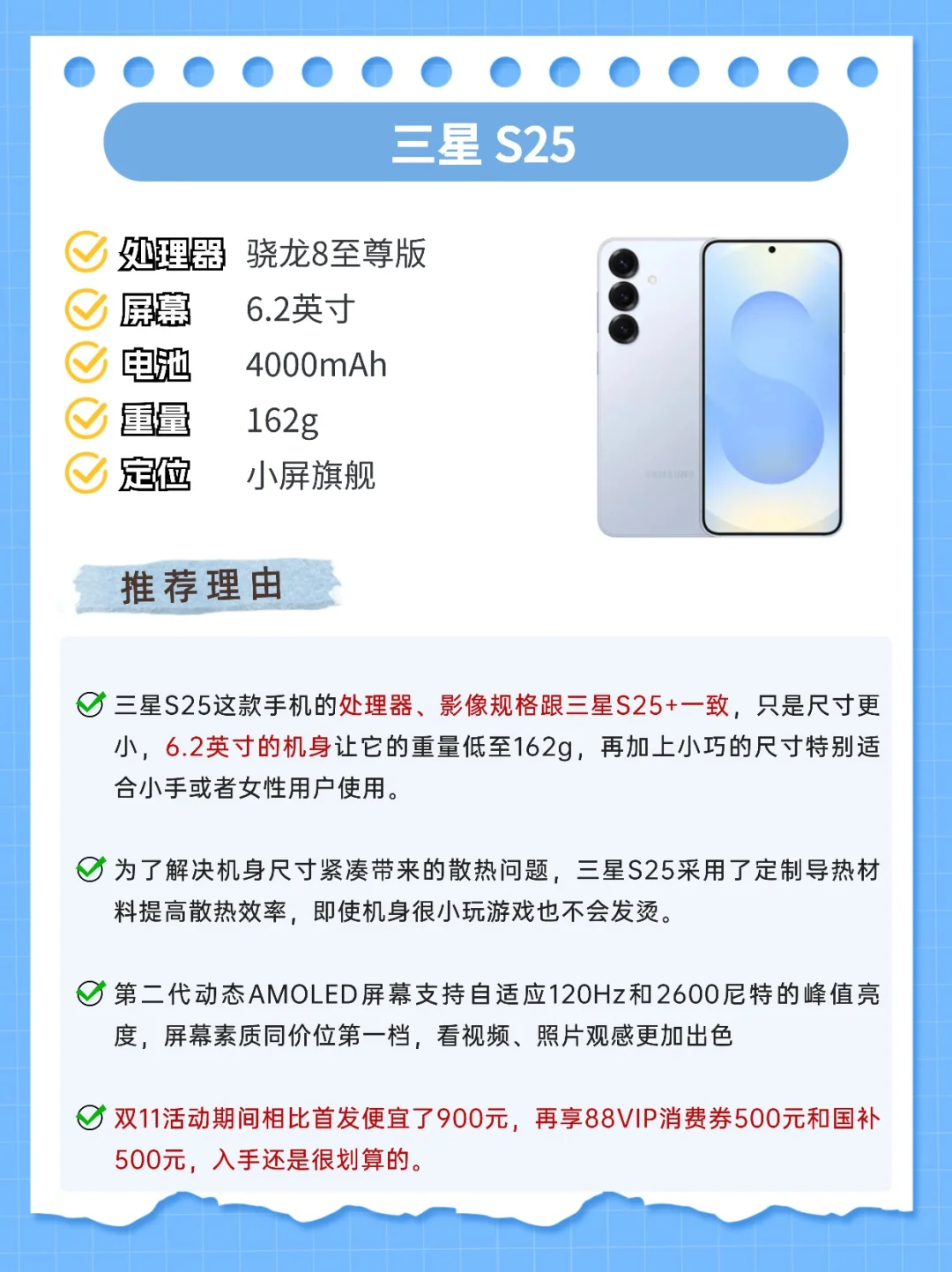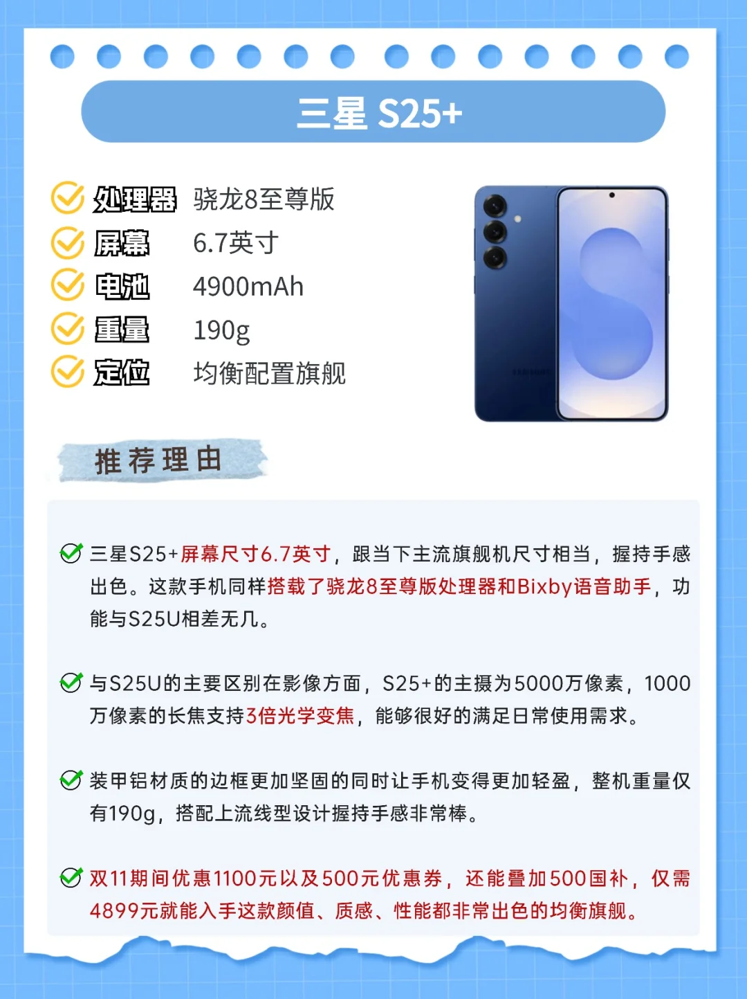 临近年末,各大平台的双11活动都超级火热,数码产品的优惠力度格外大,好多宝子都准备近期换一台新手机。📱 三星手机独特的家族式外观、优秀的工业设计、开放的系统、强大的拍照功能一直在全球是第一梯队的存在,吸引了很多生活中喜欢精致追求质感的人,🥰这里就给大家盘点一下今年双十一天mao官旗的三星手机有哪些优惠,以及大家该如何选择吧! 👉三星S25Ultra——顶配旗舰,超强影像功能 双11期间可以享受1600元的优惠还能叠加500元88VIP消费券,优惠力度非常大 👉三星S25+——均衡配置旗舰 双11期间优惠1100元以及500元88vip优惠券,还能叠加500国补,仅需4899元就能入手这款颜值、质感、性能都非常出色的均衡旗舰。 👉三星S25——小屏旗舰 双11活动期间相比首发便宜了900元,再享88VIP消费券500元和国补500元,入手还是很划算的。 👉三星S24+——高性价比旗舰 双11活动期间,这款手机在国补的基础上还能享有2500元优惠,88VIP折后仅需3549的价格,相较于首发接近半价,性价比超高。 👉三星S24——3K价位小屏旗舰 在双11活动期间可以享受到1900元立减优惠,还有国补和88VIP消费券双重福利,到手价仅需3189元,堪称3K价位质感最好的手机。 👍今年双十一天猫的三星手机优惠力度真心不错,😎不差钱就入手S25U,配置拉满的同时手机质感和颜值没话说。 👍S25+属于比较均衡的旗舰机,适合对影像要求不高的用户 👍S25作为小屏旗舰,对于女性用户和小手党非常友好。 👍如果是三千左右💰的预算,可以考虑S24+和S24两款手机,虽然是上代旗舰但是性能依然不错,并且拥有三星的出色质感和外观设计,开启移动AI新时代,性价比超高。 💡总之,双11买三星上天猫就对了❗️