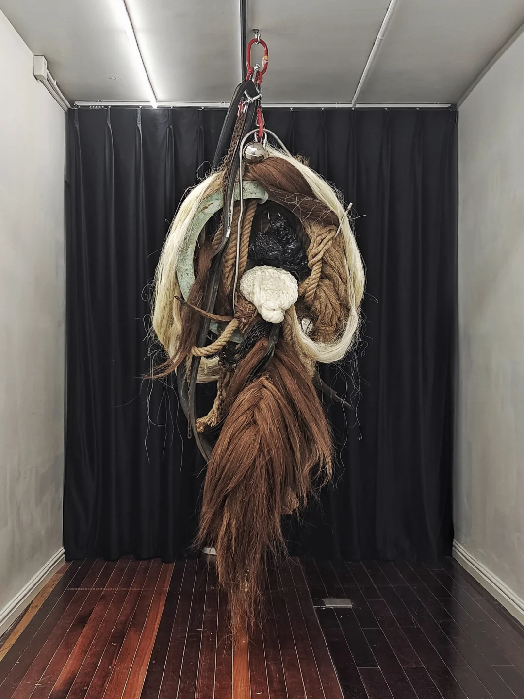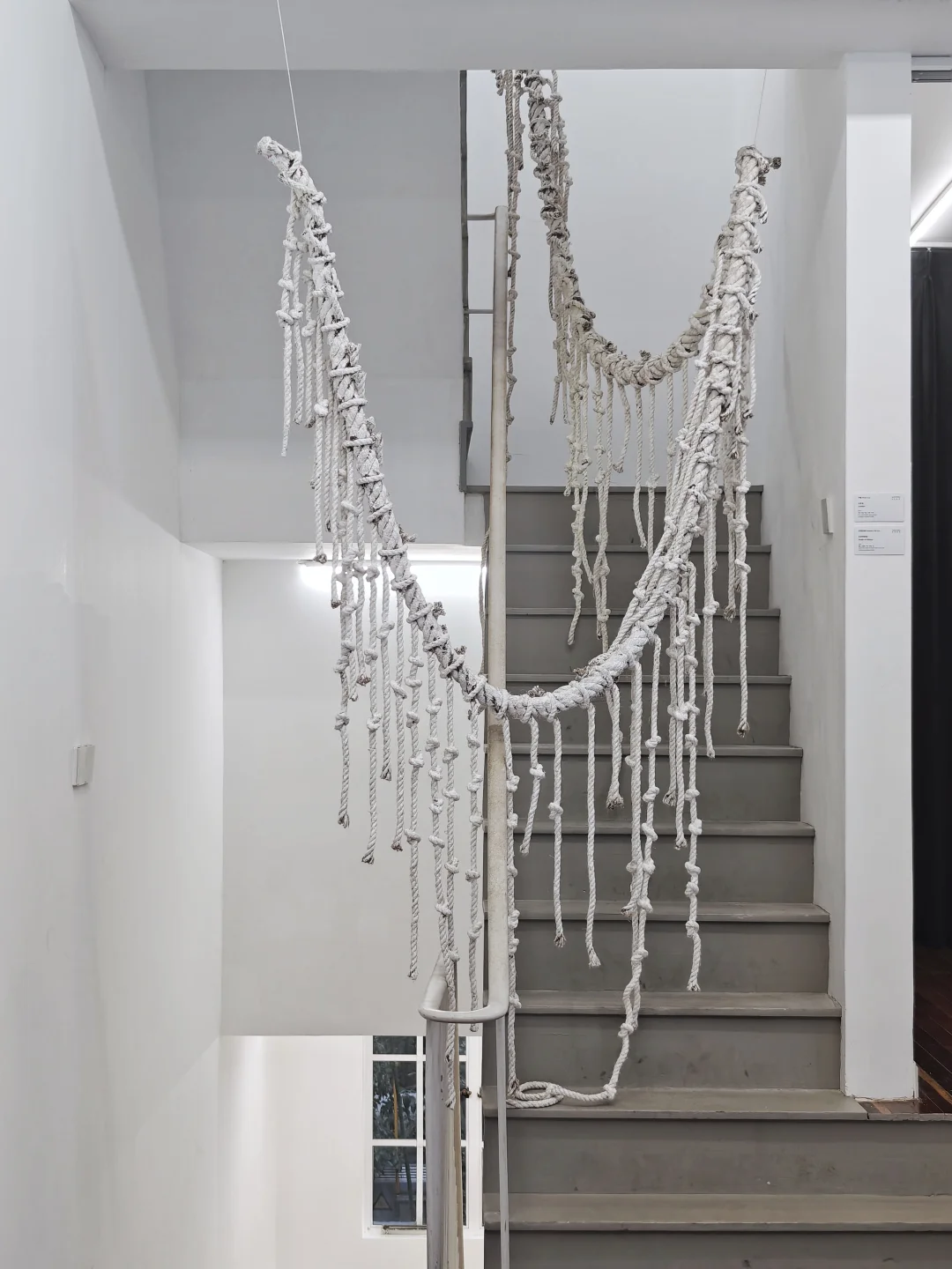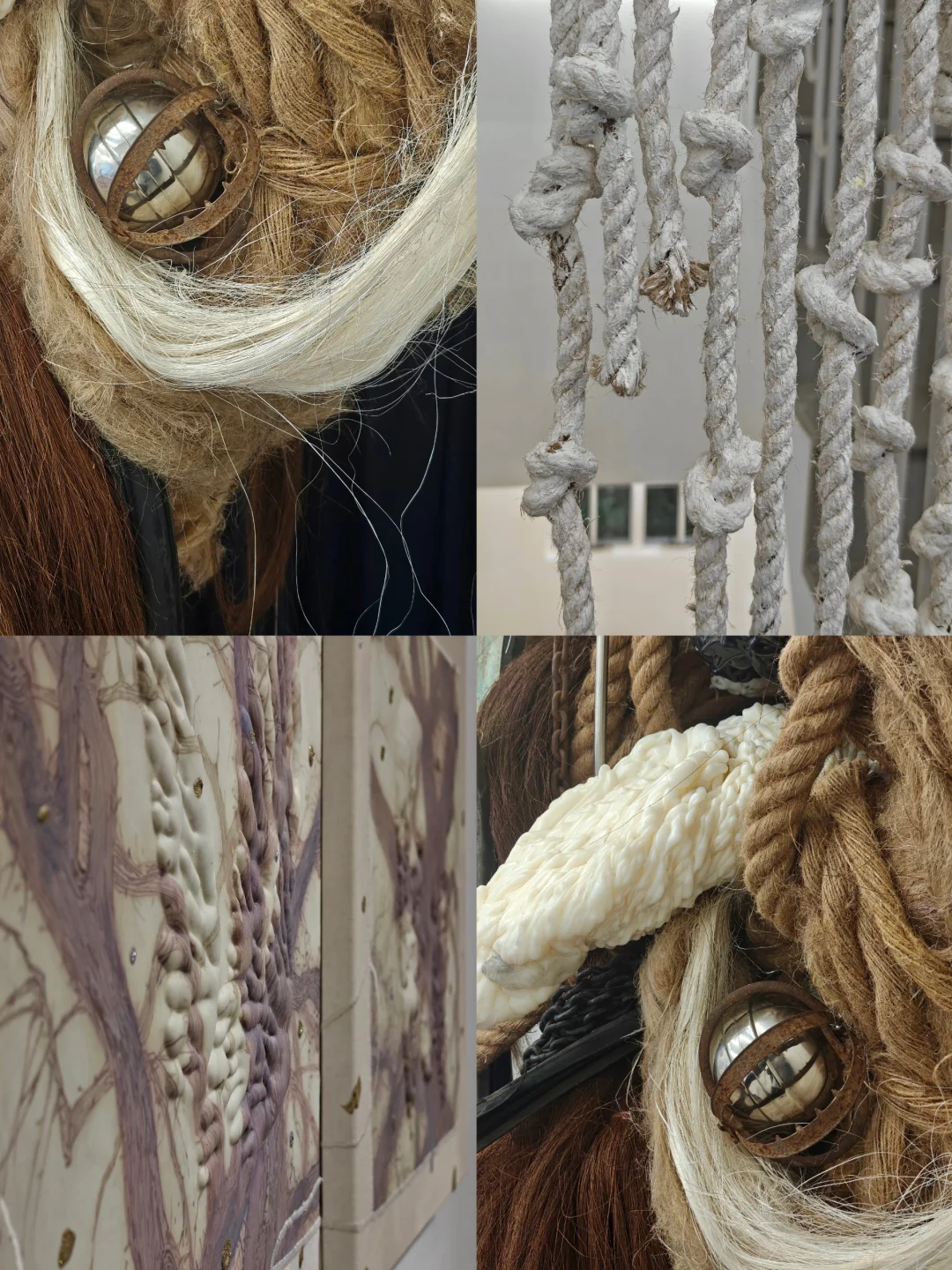 装置《Untitled》以麻丝、木头、树脂为原料,通过野性质感拒绝浪漫化自然叙事,呼应“线的生态学”,重构生态共生可能。