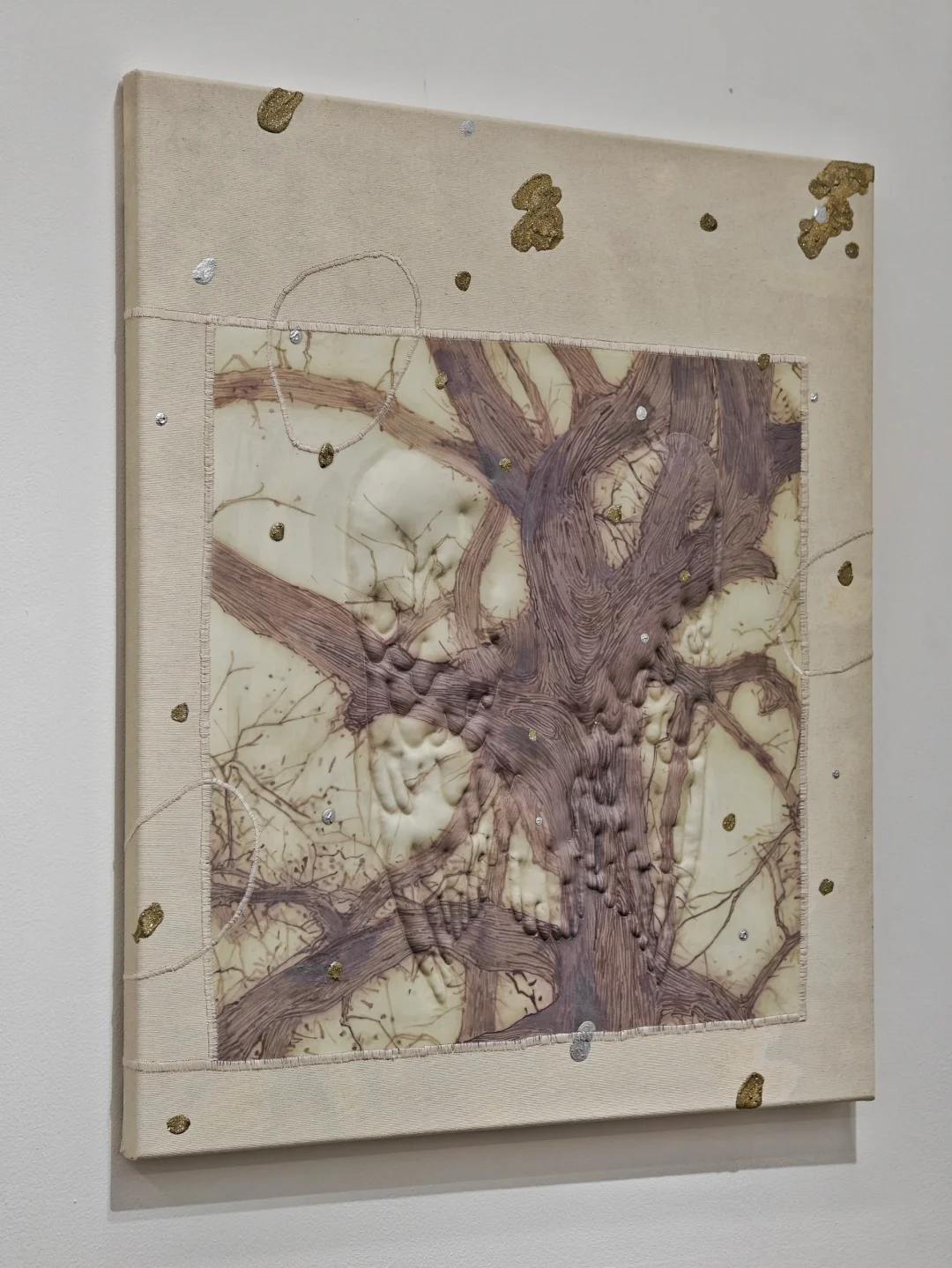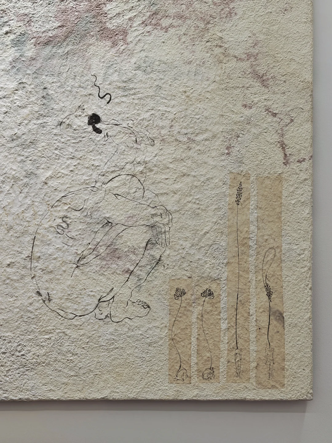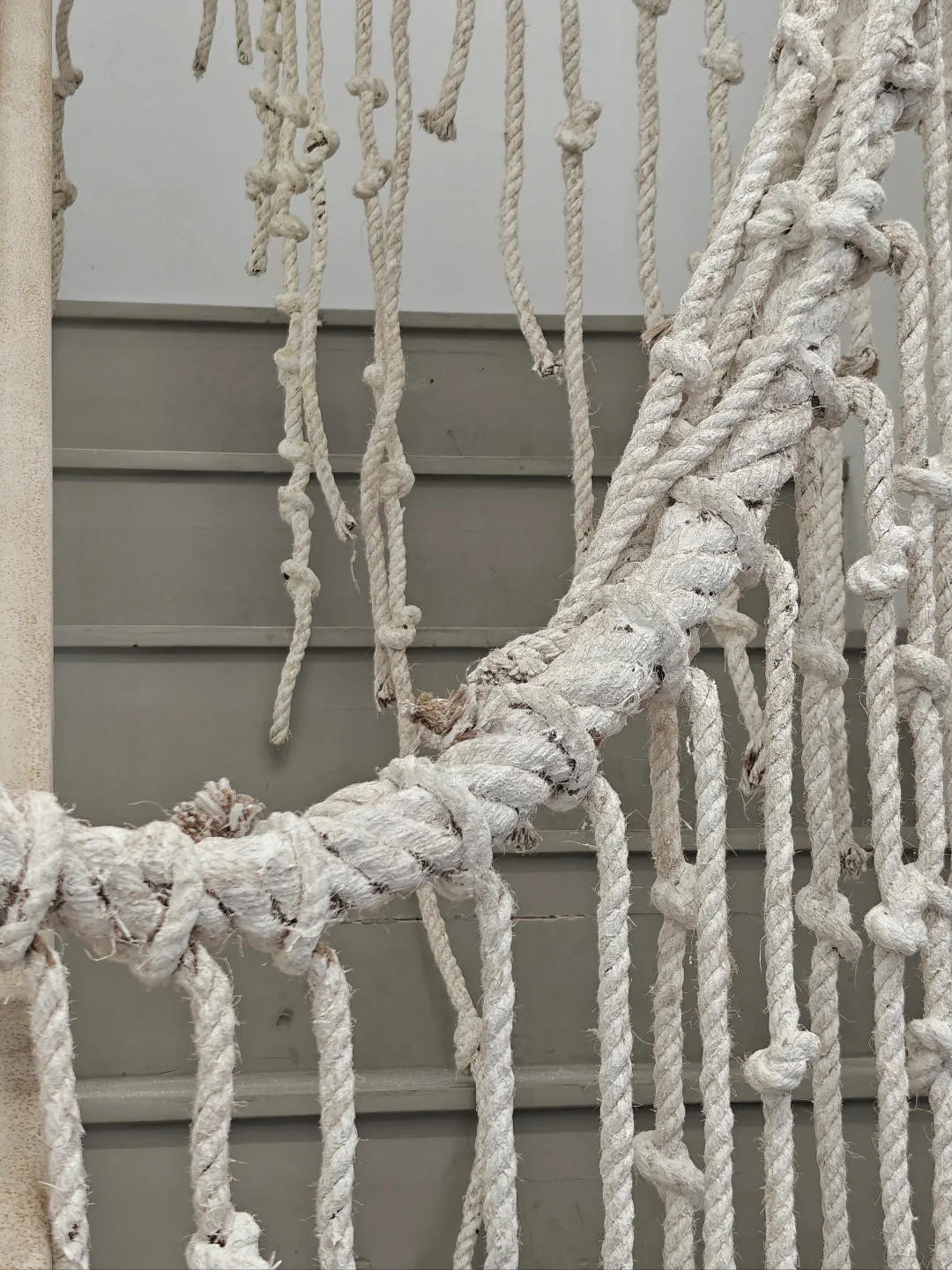 装置《Untitled》以麻丝、木头、树脂为原料,通过野性质感拒绝浪漫化自然叙事,呼应“线的生态学”,重构生态共生可能。