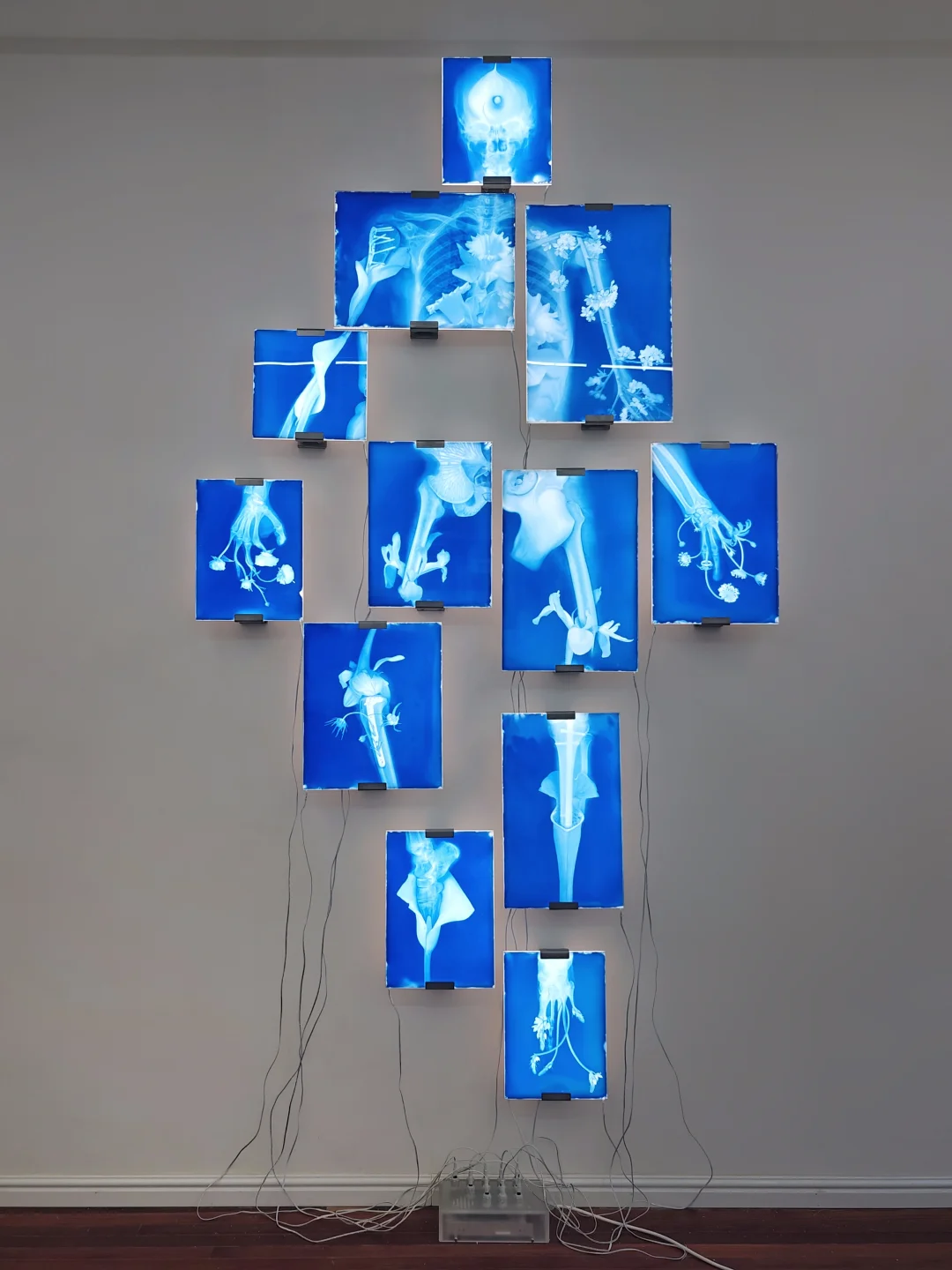 灯箱装置《梦中身No.4》,结合人体X光与药用植物,提出跨物种生命观。