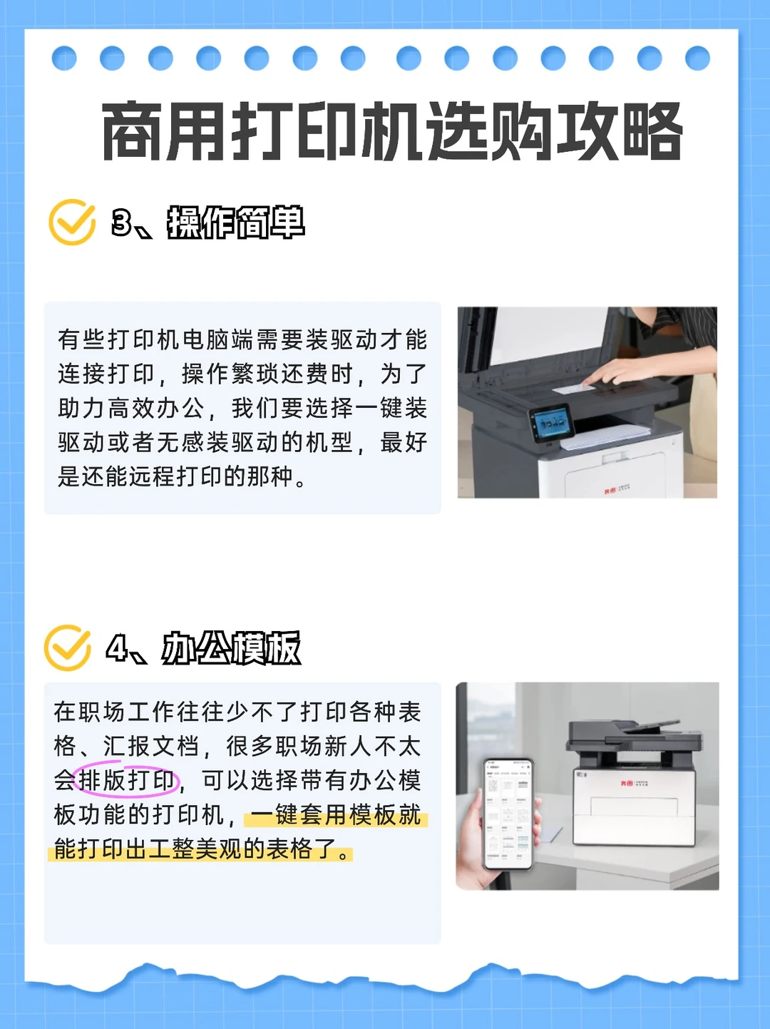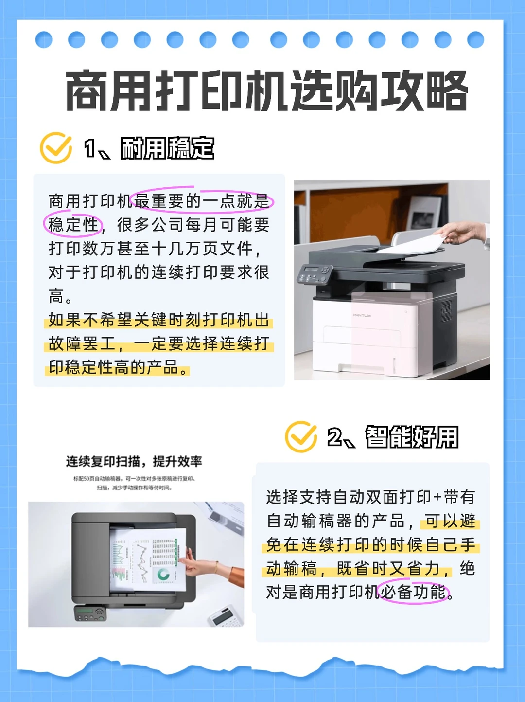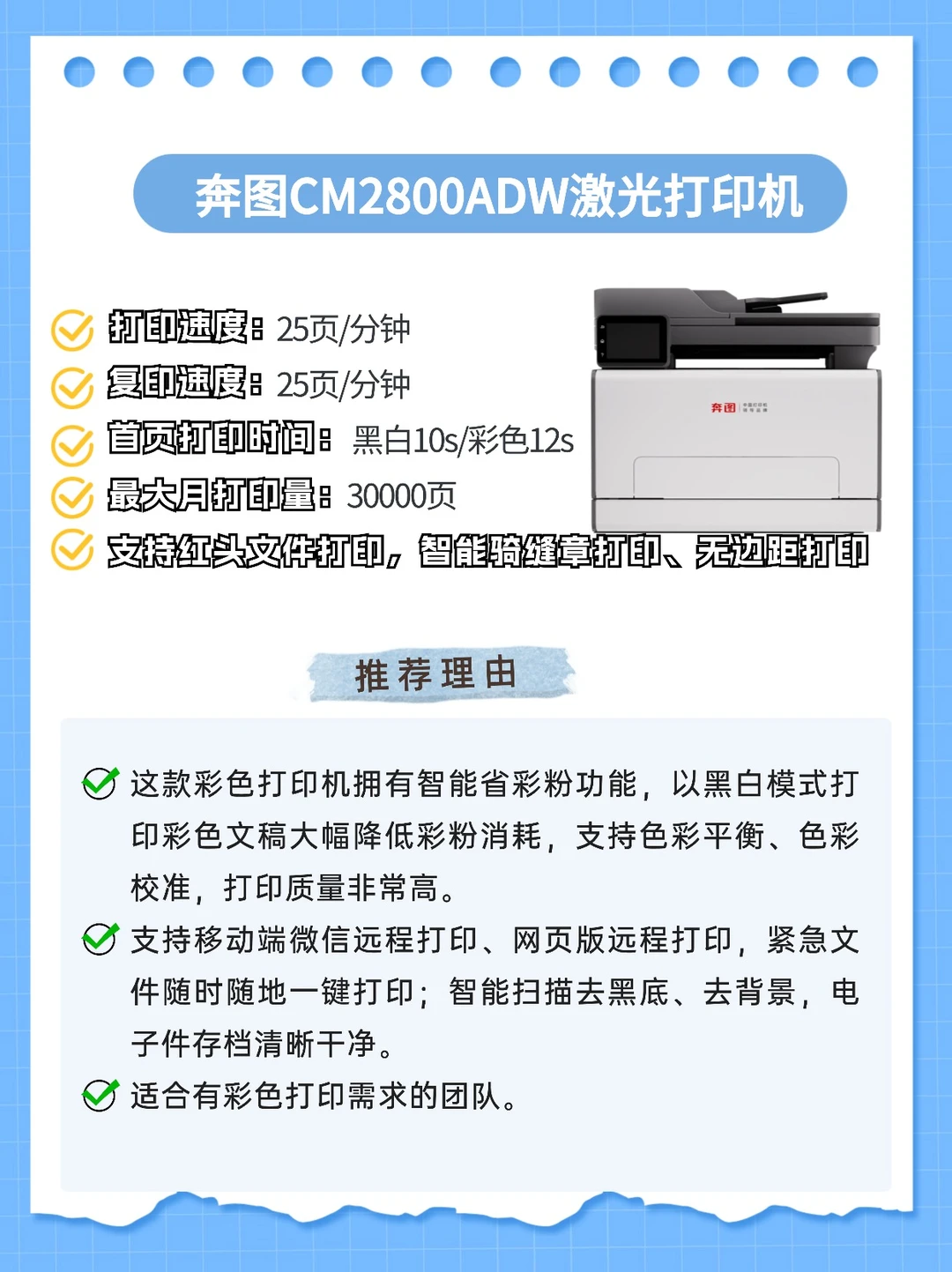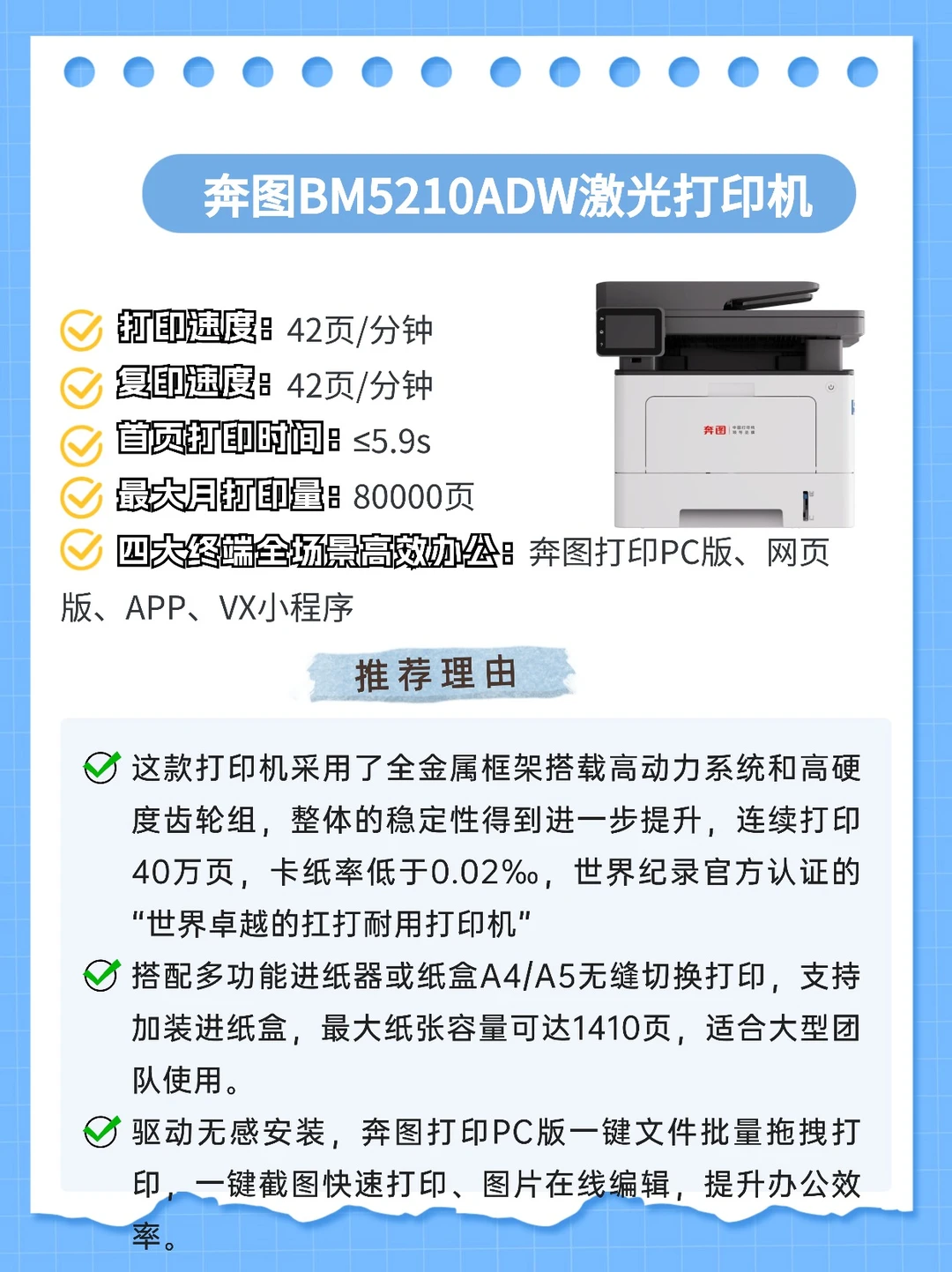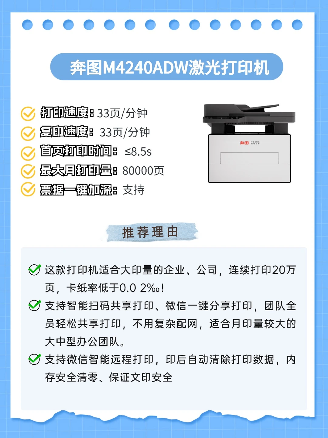 对于职场人士来说,打印机可以说是必不可少的重要工具,尤其是在大量复印/打印的时候,打印机因为高负载工作出故障就麻烦了!所以对于办公来说,选到一台智能好用、稳定耐打的打印机,能让办公效率直接拉满! 选办公打印机,重点关注这4个功能,看完选购不踩坑! 1️⃣耐用稳定 2️⃣智能好用 3️⃣操作简单 4️⃣办公模板 👉根据上面的条件一番搜索,我给大家挖到了奔图扛打家族产品,奔图这个“实力派”——国内唯一掌握激光打印机核心技术的品牌,中国打印机产业的领军者,产品畅销全球110个国家和地区,技术实力和外资大牌相比也毫不逊色。 👍而扛打家族产品是奔图家专为企业办公研发的,更扛打耐用、更智能便捷、使用成本更低,能够很好的承担企业大印量、高频率的需求,下面给大家介绍扛打家族的四位选手,按需入座不纠结~ - 🖨️奔图M7112DN激光打印机 扛打家族经典爆款,双面机销量☝️打扫复三合一,智能定影清洁+智能卡纸强排,相较于普通打印机卡纸率大幅降低,适合:初创团队/个人工作室 - 🖨️奔图BM4240ADW激光打印机 连续打印20万页,卡纸率<0.02‰!还支持USB/有线网络/WiFi/蓝牙多连接,智能扫码共享打印、微信一键分享打印,PC版支持驱动无感安装、批量文件拖拽打,适合中小型企业/部门级高频使用。 - 🖨️奔图BM5210ADW激光打印机 更🐮!连续打印40万页,卡纸率低于0.02‰!采用全金属框架搭载高动力系统+高硬度齿轮组,更稳,怎么用都不掉速~四端远程打印,还能定制操作界面,搭配多功能进纸器可以实现A4/A5无缝切换打,加装进纸盒后,最大纸张容量可达1410页,适合市场/设计等需大型部门。 - 🖨️奔图CM2800ADW彩色激光打印机 智能省彩粉模式,以黑白模式打印彩色文稿,立省30%碳粉消耗。支持色彩平衡、色彩校准,打印质量高,连红头文件、智能骑缝章打印都有专用功能,适合有彩色打印需求的中小企业/市场部/设计部/品牌方 - 选打印机就像选队友,找到靠谱的“扛打型选手”,工作真的能轻松一半!