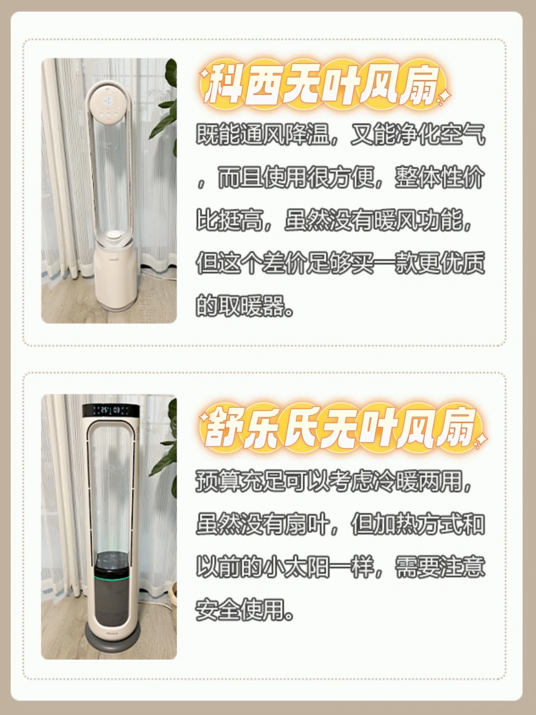 无叶风扇是没有扇叶的空气循环扇,现在市面上主要有2种无叶风扇,一种是只出冷风,另一种是冷暖两用,但实际用起来还是有很大的区别,所以今天就来和大家实测对比一下~有疑问的地方欢迎评论区问我呀~ ✅只出冷风的无叶风扇 确实是术业有专攻,风力够大,噪音也小,而且净化功能还很给力~ 如果需要取暖的话,感觉它和冷暖两用风扇之间的差价已经足够我们去买一台更加优质的取暖器了,所以不用过于纠结~ ✅冷暖两用的无叶风扇 虽然没有扇叶,但加热方式类似于以前的小太阳,用起来还是要注意安全防护~ 如果确实家里空间很小,预算也充足的话,那选这种也是ok的~