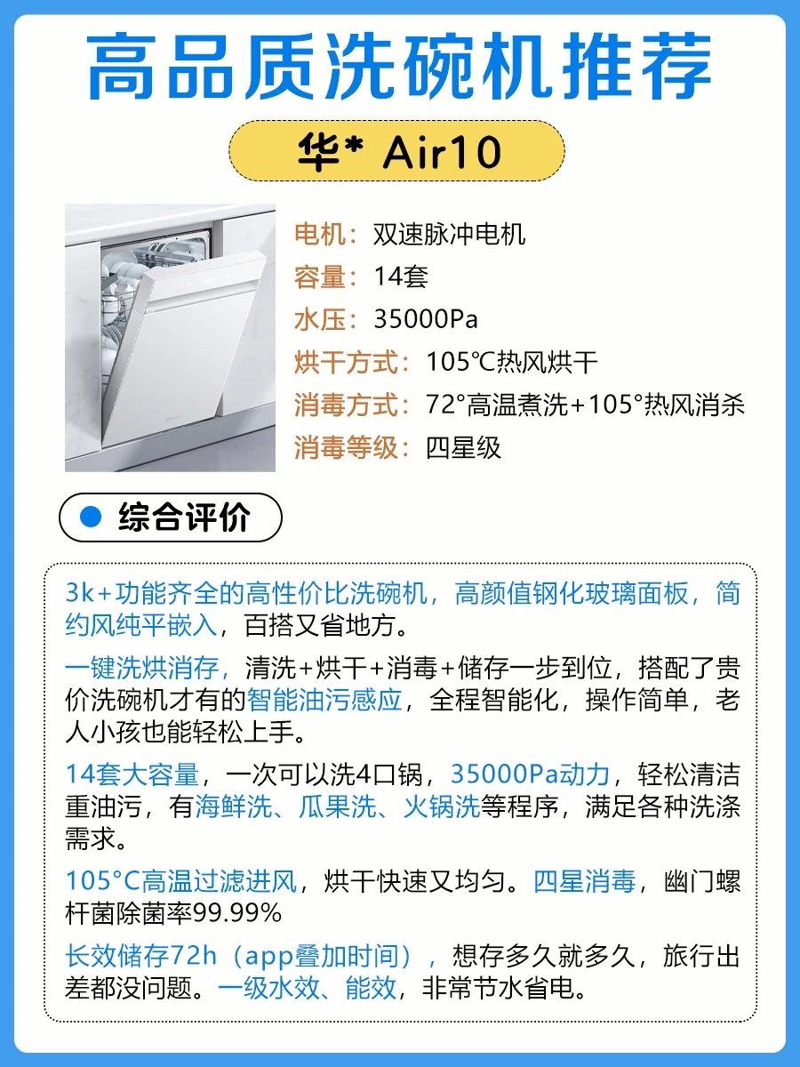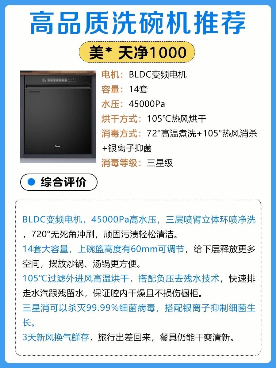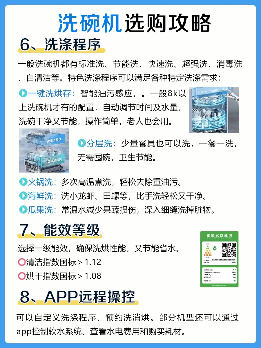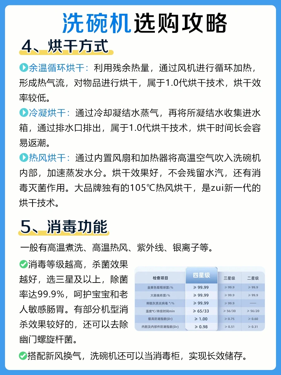 市面上洗碗机型号那么多,让人挑花眼!618快到了,怎么选到容量合适,清洁力强,烘干、消毒都表现出色,操作简单,还省水省电的洗碗机呢? 📝今天给大家整理了7点选购技巧,快来抄作业吧! 1️⃣容量 🔸8套以下:1-2口人小家庭,碗筷和锅具需要分次洗涤 🔸8-13套:3-4口人家庭,除普通餐具,可容纳小型锅具 🔸14套以上:5口以上多口之家,支持放入大型锅具 ✅建议套数越大越好,预算范围内买大不买小 2️⃣水压 水压越大,洗碗机里水流的冲刷力度越大,能有效清洁餐具上的污渍 ✅建议选水压30000Pa以上的洗碗机 3️⃣烘干方式 🔸余温循环烘:利用残余热量,通过风机进行循环加热,形成热气流,对物品进行烘干,属于1.0代烘干技术,烘干效率较低 🔸冷凝烘干:通过冷却凝结水蒸气,再将所凝结的水收集进水箱,通过排水口排出,属于1.0代烘干技术,烘干时间长会容易返潮 🔸热风烘干:通过内置风扇和加热器将高温空气吹入洗碗机内部,加速蒸发水分。烘干效果好,不会残留水汽,还有消毒灭菌作用。大品牌独有的105℃热风烘干,是zui新一代的烘干技术 4️⃣消毒功能 一般有高温煮洗、高温热风、紫外线、银离子等 ✅消毒等级越高,杀菌效果越好,选三星及以上,除菌率达99.9%,呵护宝宝和老人敏感肠胃。有部分机型消杀效果较好的,还可以去除幽门螺旋杆菌 👉🏻搭配新风换气,洗碗机还可以当消毒柜,实现长效储存 5️⃣洗涤程序 火锅洗、海鲜洗、瓜果洗等特色洗涤程序,可以满足日常不同的场景需求 🔸一键洗烘存:智能油污感应,一般8k以上洗碗机才有的配置,自动调节时间及水量,洗碗干净又节能,操作简单,老人也会用 🔸分层洗:少量餐具也可以洗,一餐一洗,无需囤碗,卫生节能 6️⃣能效等级 ✅选一级能效,确保洗烘性能,又节能省水 清洁指数国标>1.12 烘干指数国标>1.08 7️⃣APP远程操控 可以自定义洗涤程序、预约洗消烘。部分机型还可以通过app控制软水系统、查看水电费用和购买耗材 ✨给大家推荐2款618值得入手的洗碗机,具体看图4、5,高品质性价比之选哦~