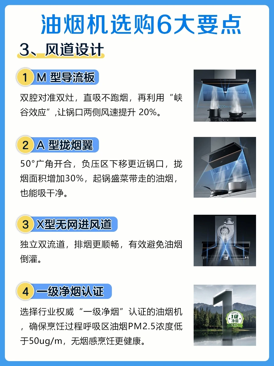 🔸一级净烟认证:选择行业权威“一级净烟”认证的油烟机,确保烹饪过程呼吸区油烟PM2.5浓度低于50ug/m,无烟感烹饪更健康。