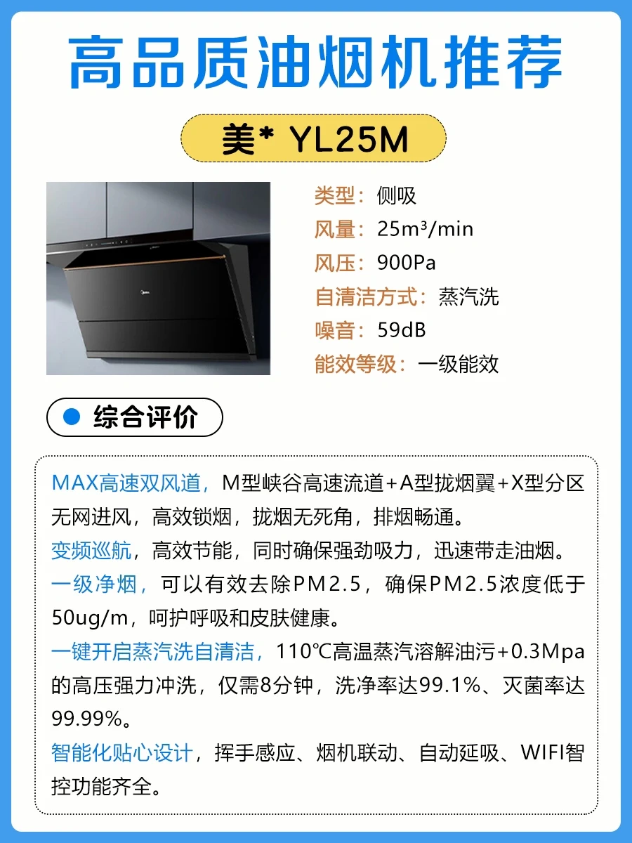 🔸烟机自清洁功能一般分为:免拆洗、热熔洗、高压洗、蒸汽洗。建议选择蒸汽洗,110度高温蒸汽+0.3Mpa高压冲洗,有洗净率报告和灭菌率报告,洗净率99.1%,灭菌率99.99%。