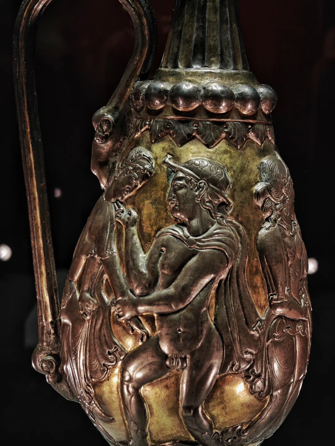 🔸瓶身中部的三组半浮雕,每组2人,题材是古希腊神话,分别是“帕里斯(Paris)裁决黄金苹果归属”“特洛伊王子引诱海伦(Helen of Troy)私奔”,以及“墨涅拉奥斯(Menelaus)迎回妻子”三个场景,涵盖了特洛伊之战的远因、发端与尾声