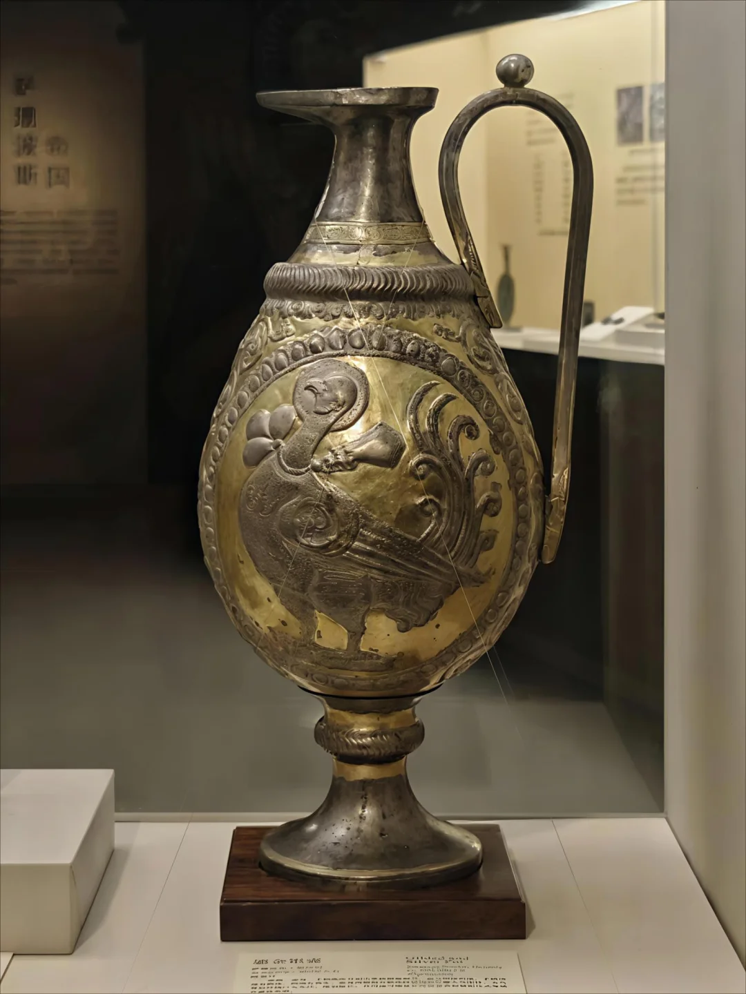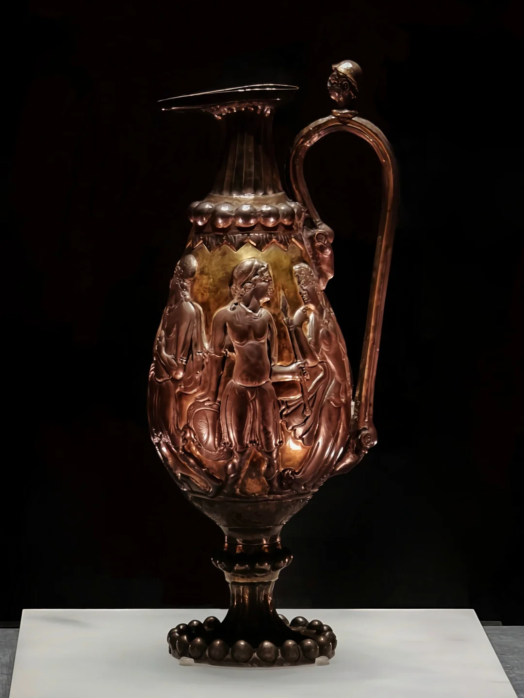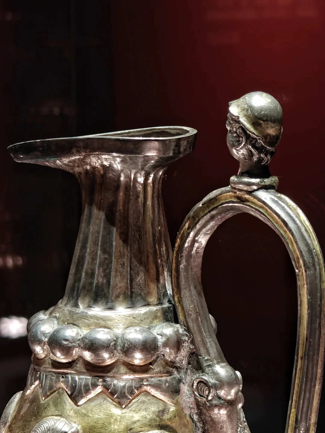 🔸壶颈部的凹槽像是希腊柱式的变形,联珠纹是萨珊特色;壶把上铸成一深目高鼻带盔形帽的人头像;壶腹下部用细线雕一周水波纹, 水波中有两只怪兽相向追逐一条鱼, 鱼尾甩出水面