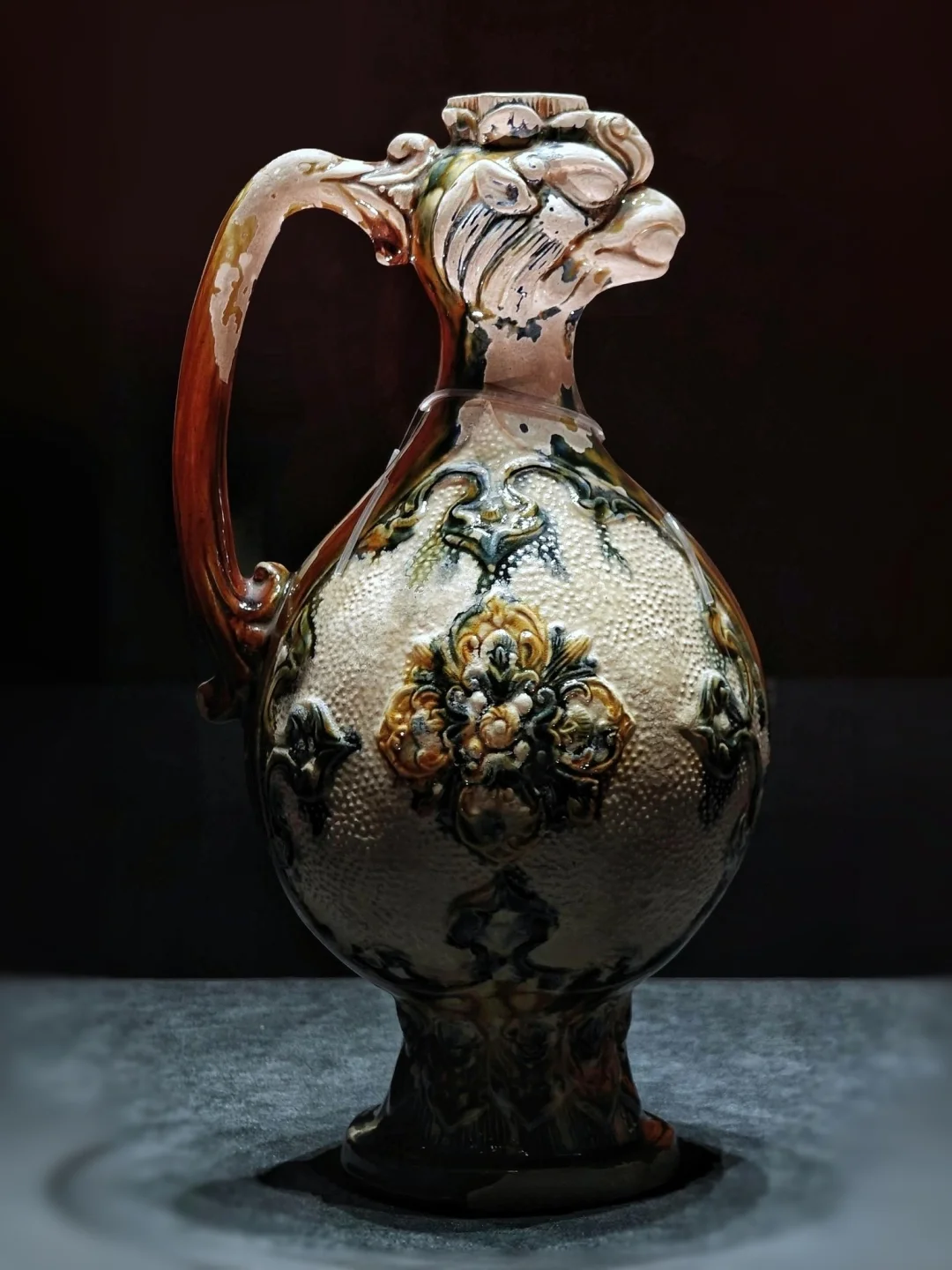 🏺金银制作的胡瓶价值不菲,最初只能供帝王与上层贵族使用。唐代工匠以陶瓷仿制,结合本土审美,将胡瓶口沿、流、盖设计为凤首,柄部装饰龙首等纹样,胡瓶渐渐走入寻常百姓家。本次展览中的一件唐代三彩凤首壶(图9),色彩绚丽、风格奔放,融合外来元素与传统工艺,极具浪漫主义色彩