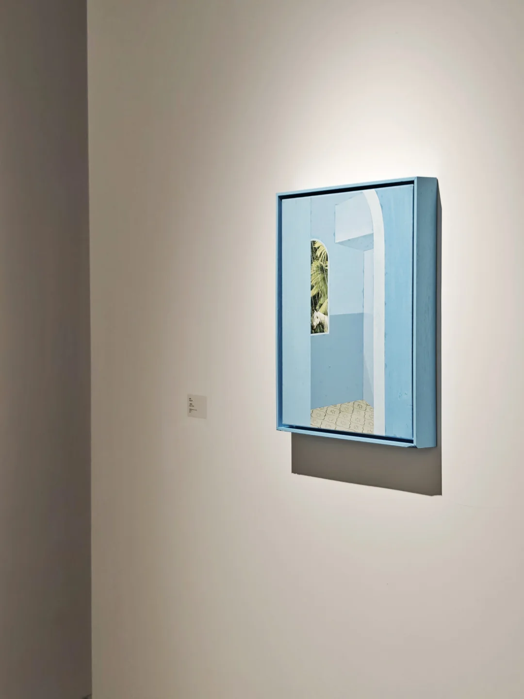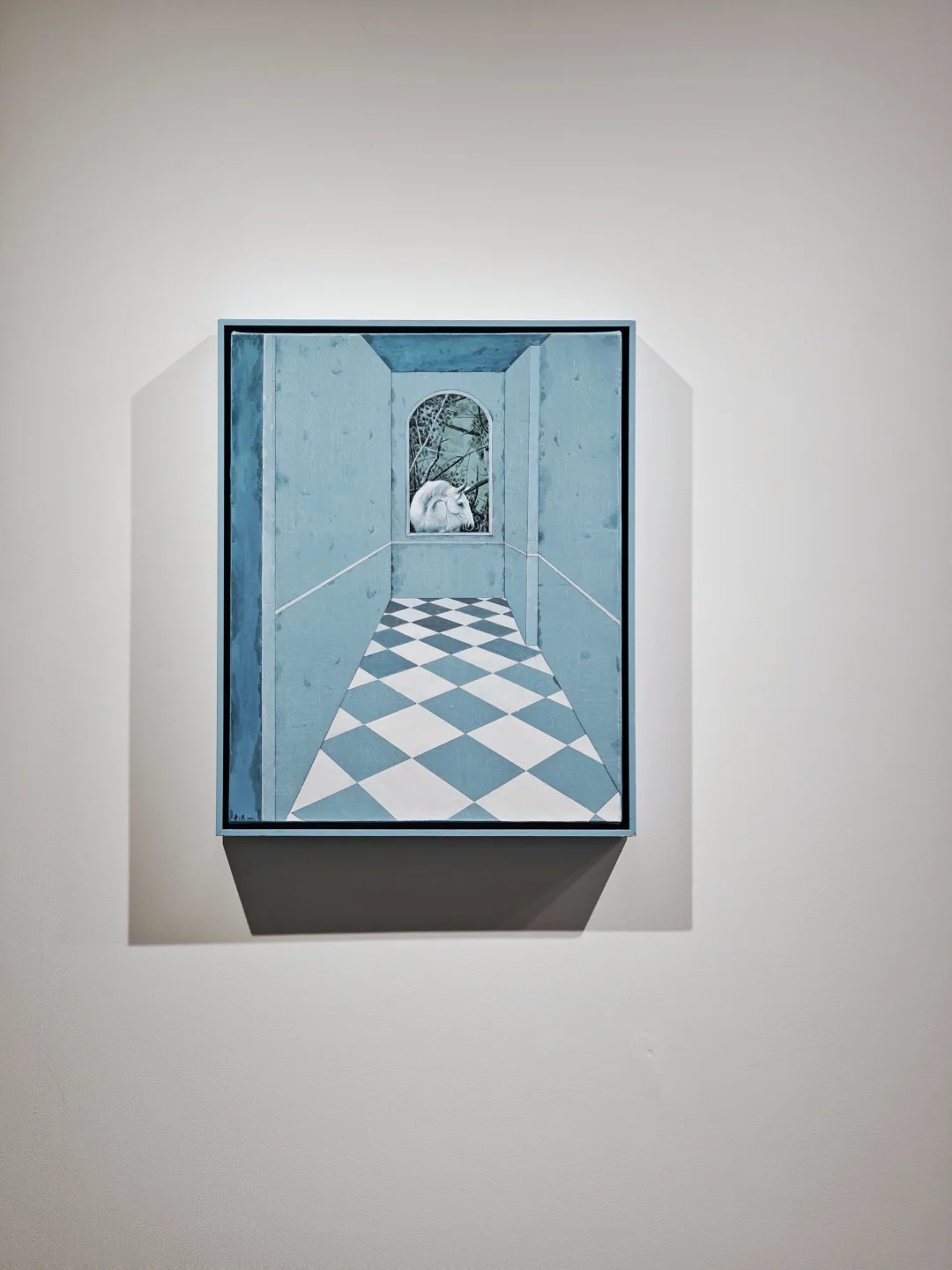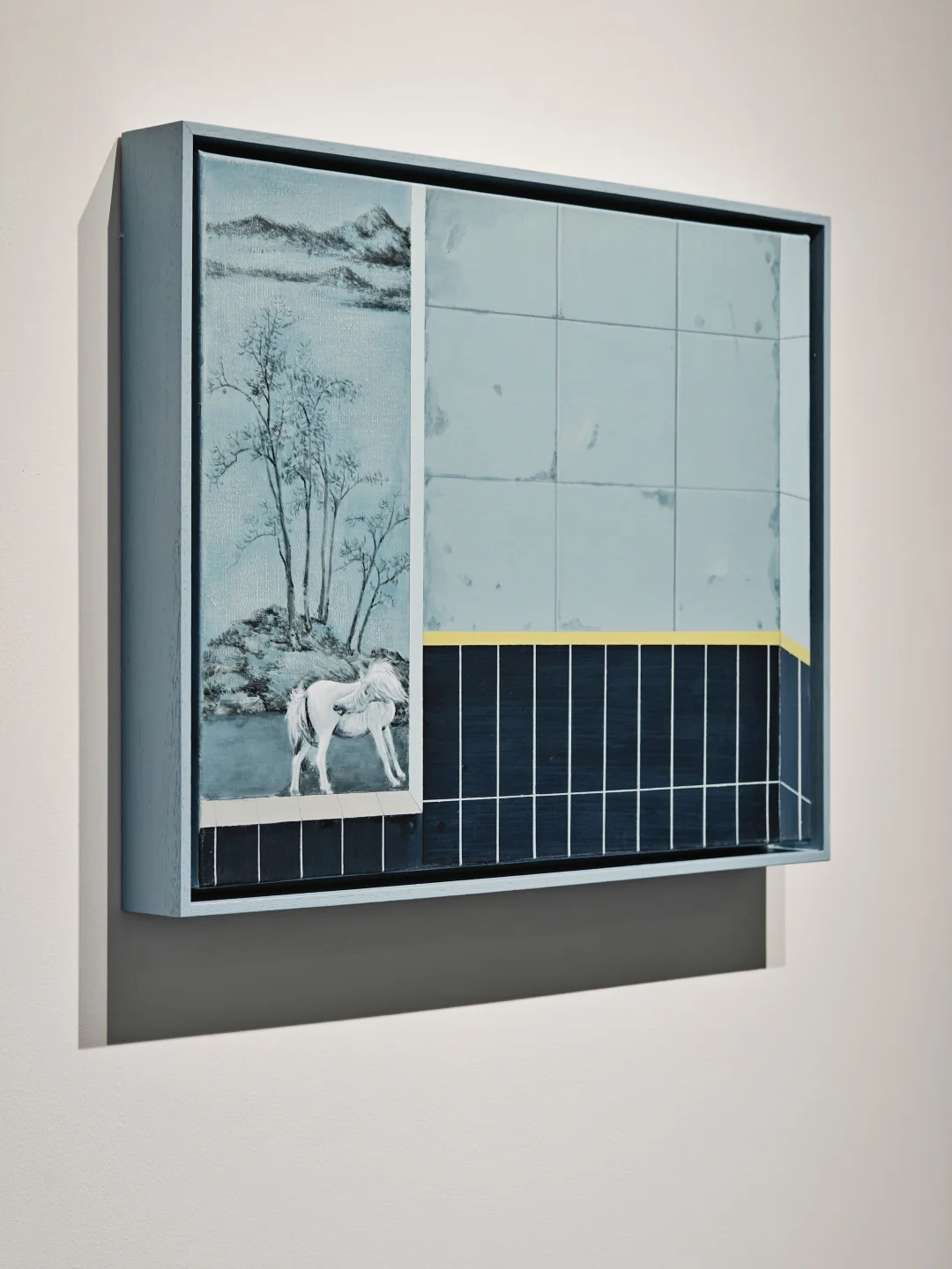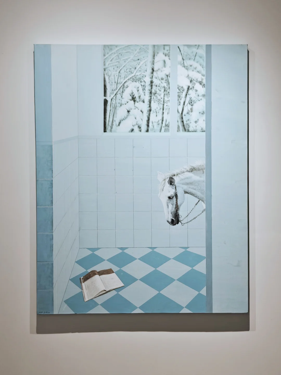 布面丙烯作品融合东方自然精神与西方空间构成,营造静谧荒诞的超现实氛围,展现符号解构与意境重构。画中总是出现徘徊、凝视并找寻着的白马似乎是艺术家本人的化身。