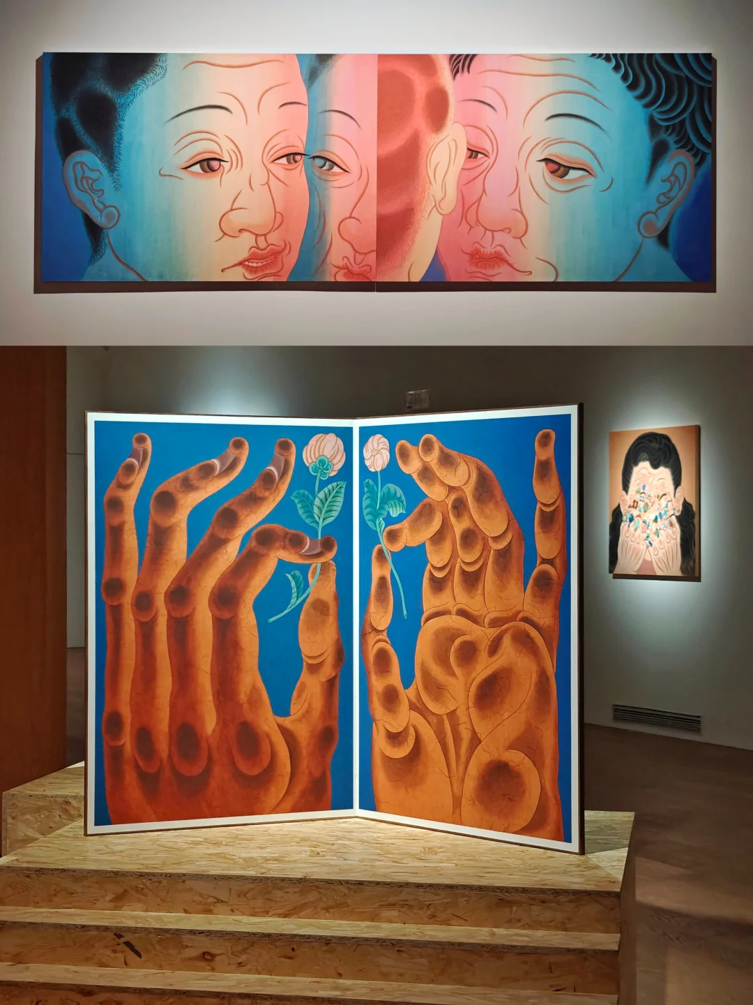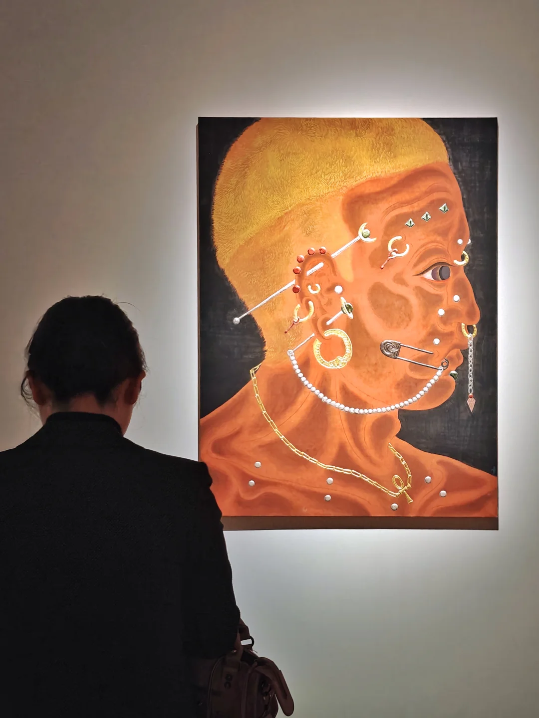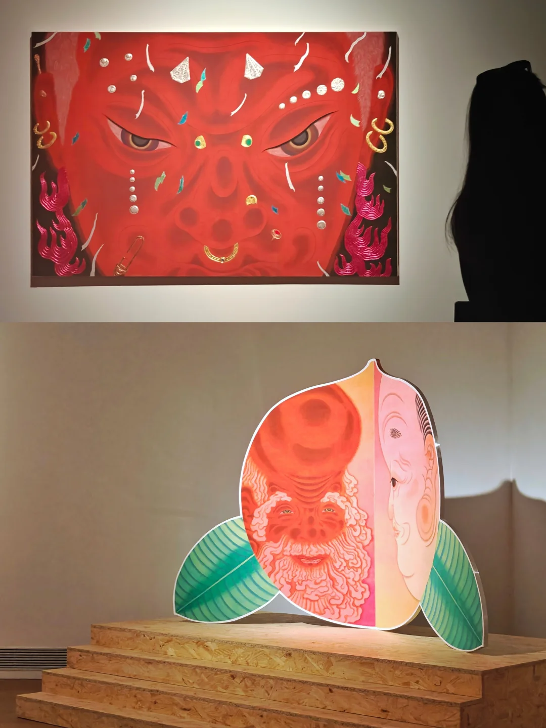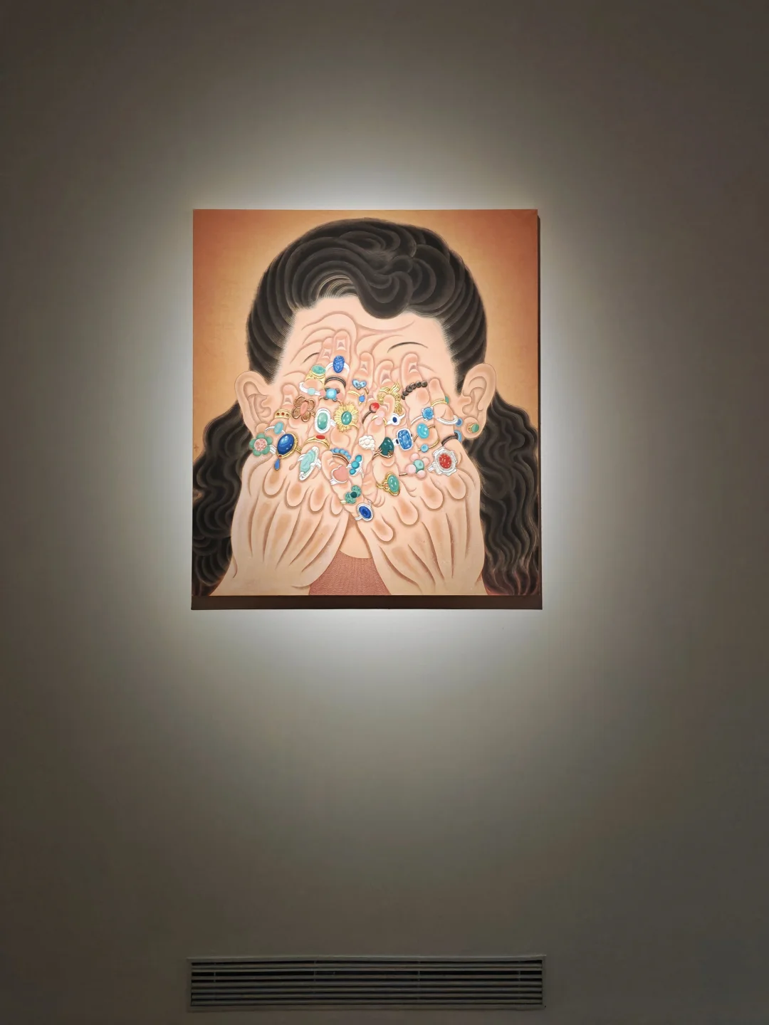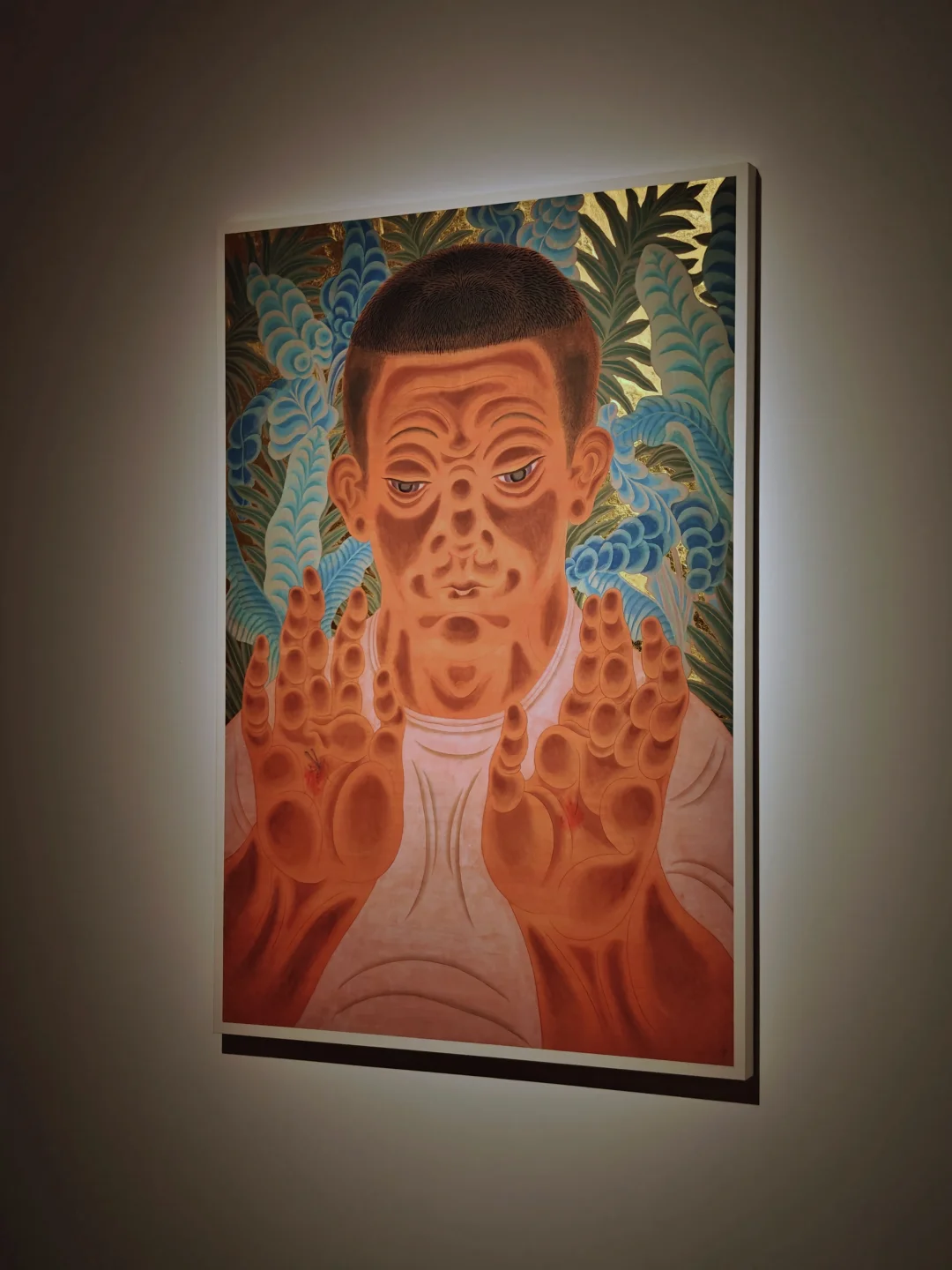 🖼️乍一看画面,很难想象这些作品是用传统的工笔重彩技法创作的。艺术家用孔雀石等天然矿物和金属箔,赋予色彩张力。他对材料物性的痴迷,源于对宗教和古建文化的深入考察,延续晚清外销画脉络,借高饱和色彩和特写展现深层等级秩序与拜物本质。