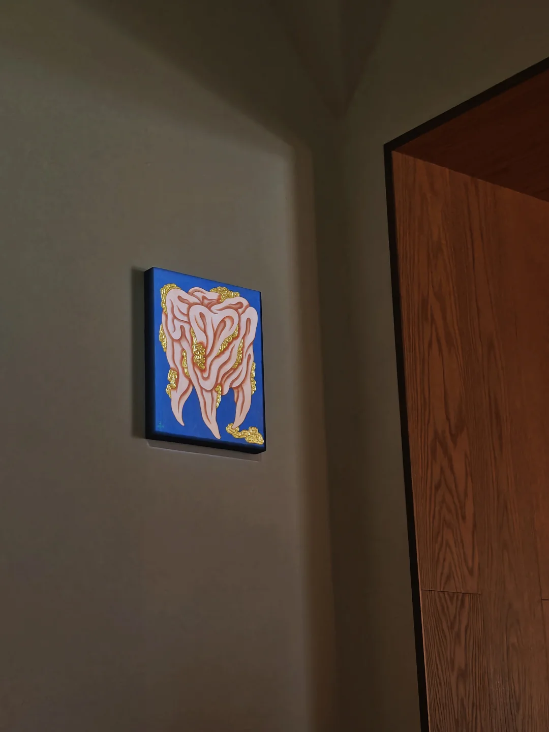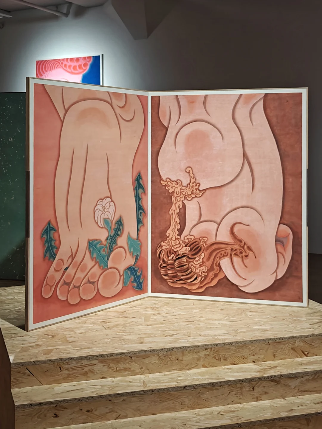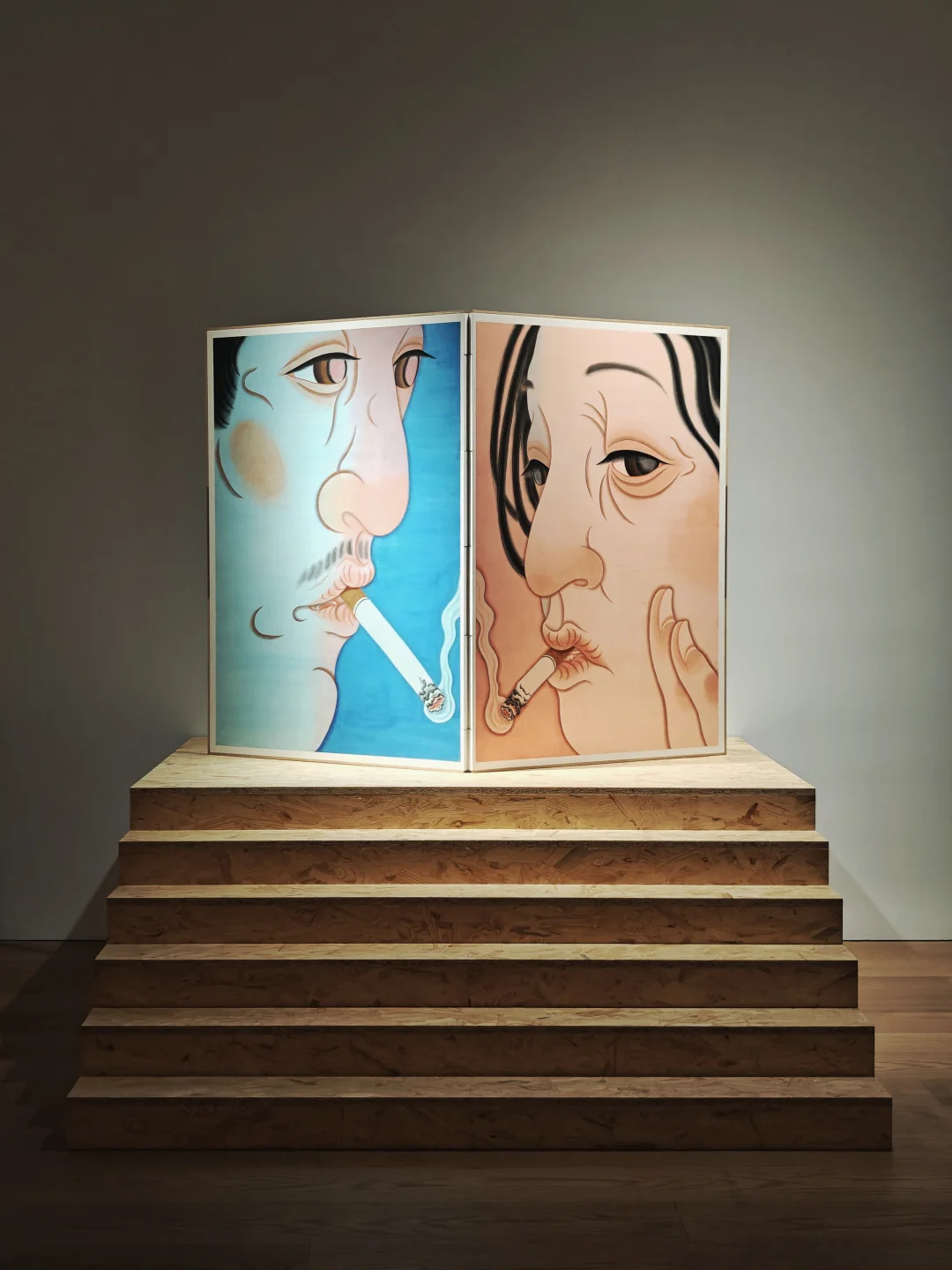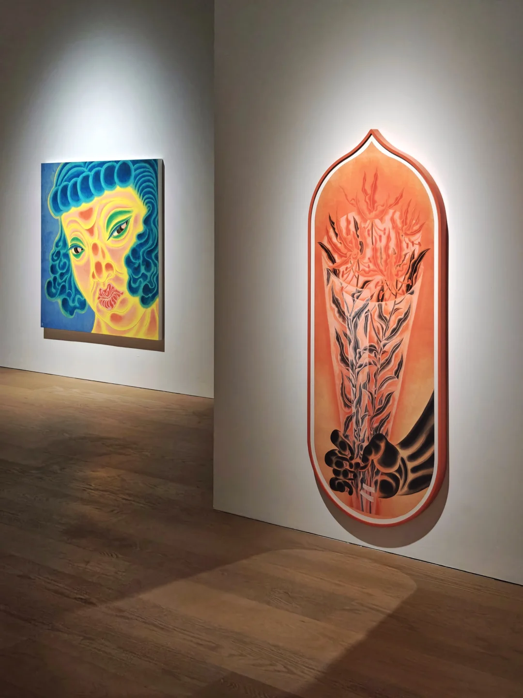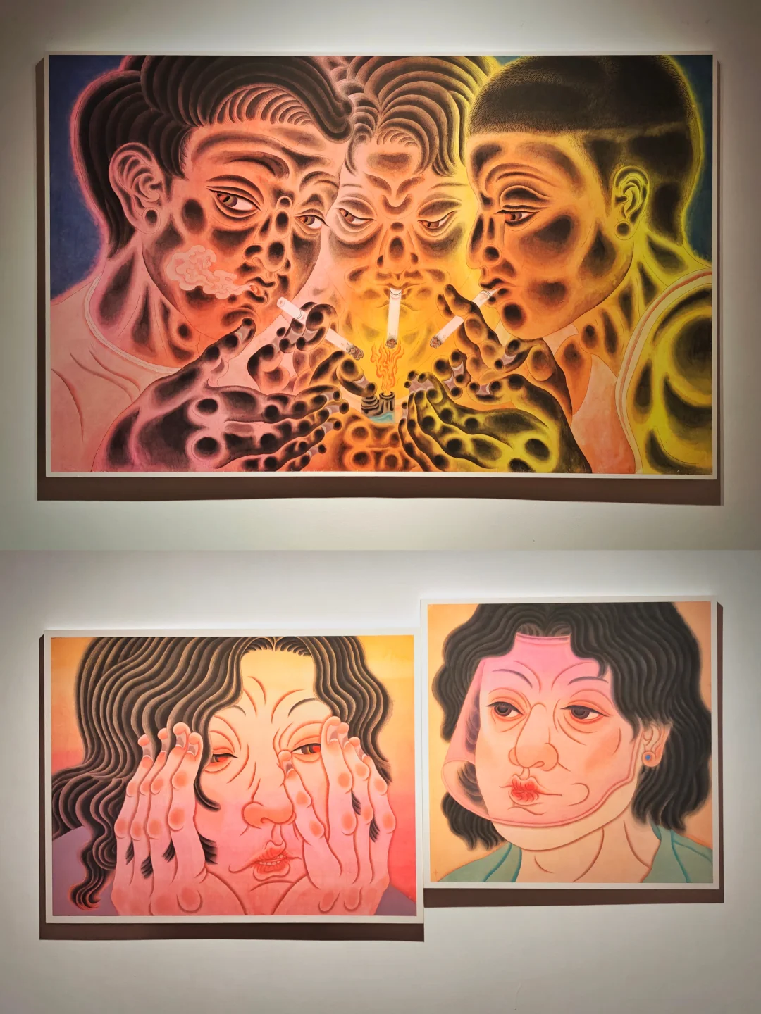 🖼️乍一看画面,很难想象这些作品是用传统的工笔重彩技法创作的。艺术家用孔雀石等天然矿物和金属箔,赋予色彩张力。他对材料物性的痴迷,源于对宗教和古建文化的深入考察,延续晚清外销画脉络,借高饱和色彩和特写展现深层等级秩序与拜物本质。