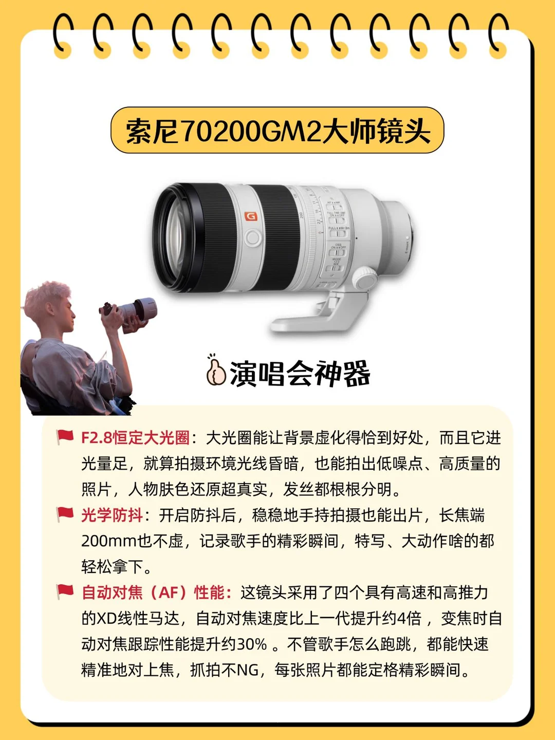 🌌除此之外,还有最近罗云熙演唱会用的同款70200GM2镜头,200mm长焦一拉,隔着十万八千里也能把舞台上的爱豆怼到脸上拍!放大N倍细节都超清晰,发丝根根分明,连爱豆眨眼的睫毛都看得一清二楚!👀👀
