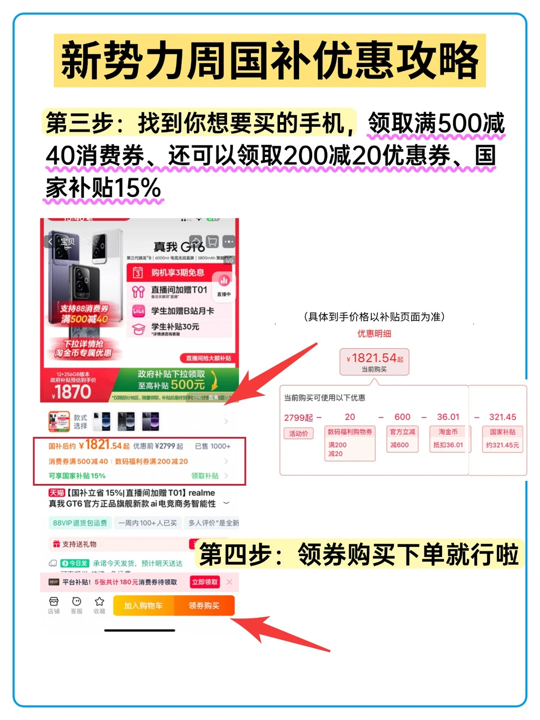第三步:找到你想要买的手机,领取满500减40消费券、惊喜券200减20、国家补贴15%