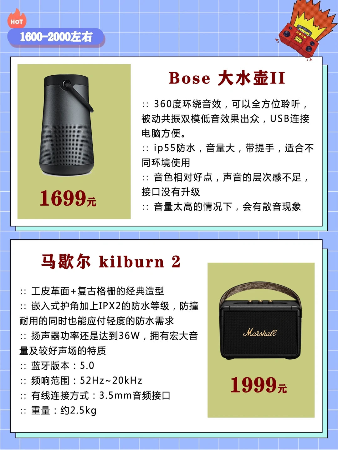 💰1600-2000左右:Bose 大水壶II、马歇尔 kilburn 2