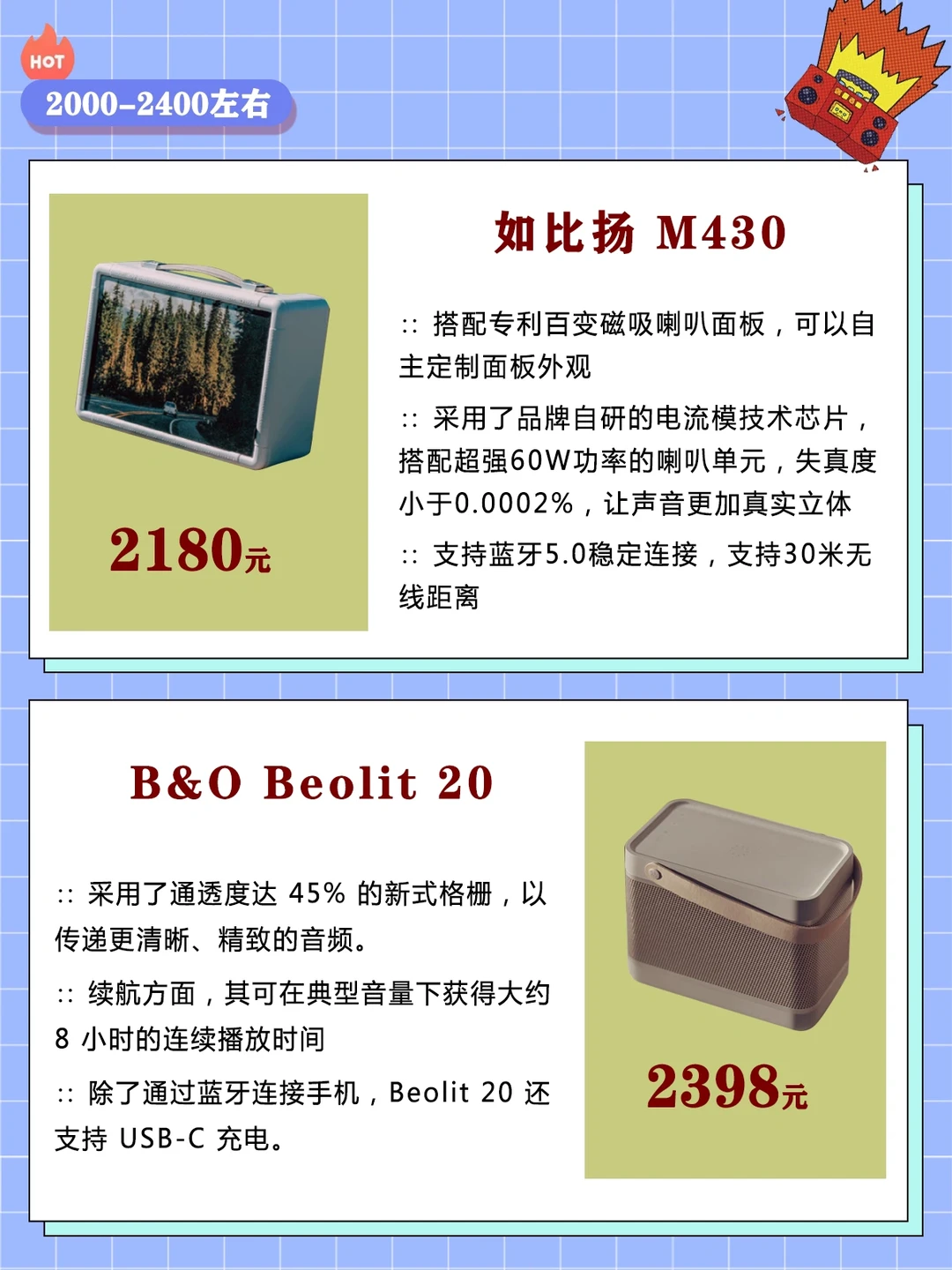💰2000-2400左右:如比扬 M430、B&O Beolit 20
