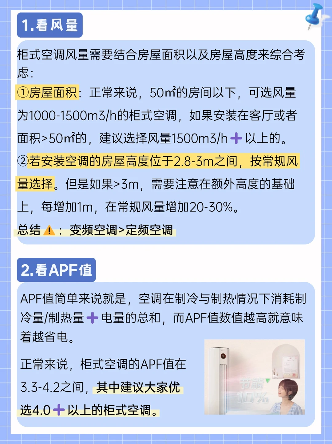 正常来说,柜式空调的APF值在3.3-4.2之间,其中建议大家优选4.0➕以上的柜式空调。