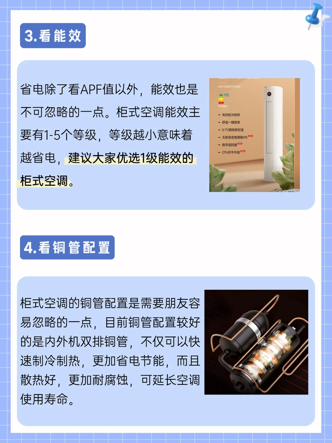 省电除了看APF值以外,能效也是不可忽略的一点。柜式空调能效主要有1-5个等级,等级越小意味着越省电,建议大家优选1级能效的柜式空调。