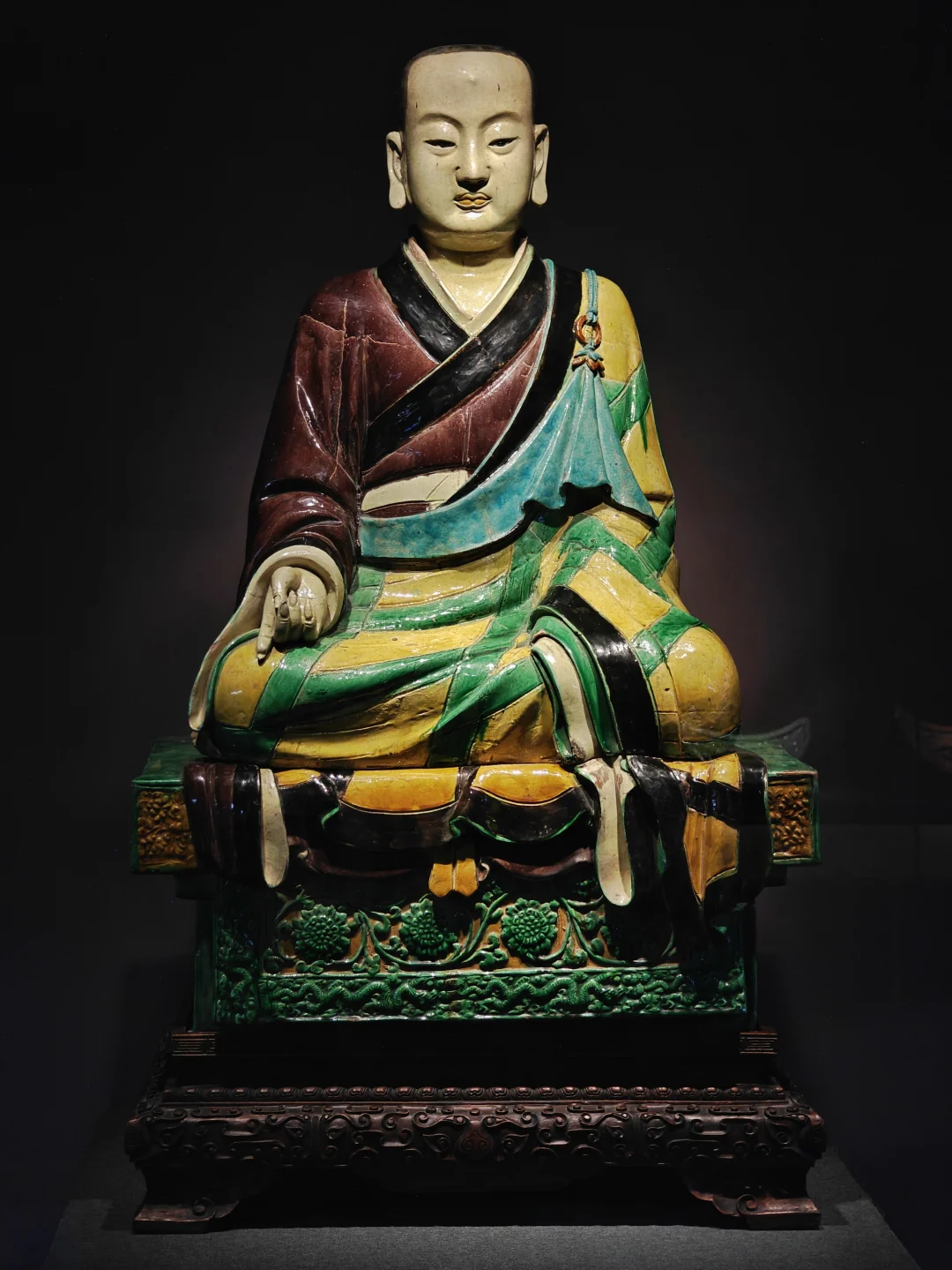 明初首次被指定为皇家建筑专属材料,黄釉琉璃为皇帝独有,其影响由建筑领域扩展至日用瓷器。三彩琉璃罗汉坐像,可能为十八罗汉中的沉思罗汉。类似风格的大型琉璃造像在多藏于国外大型博物馆