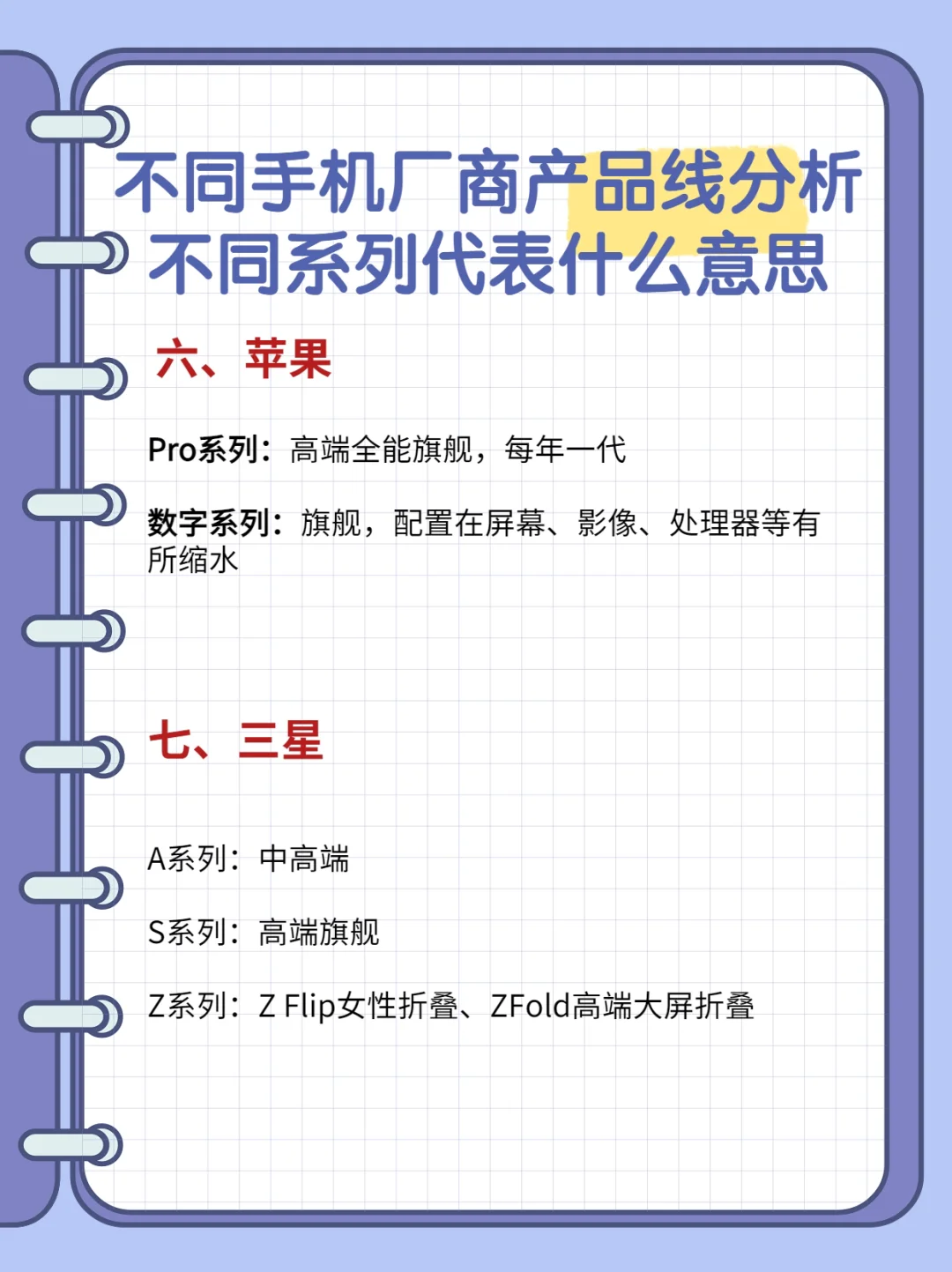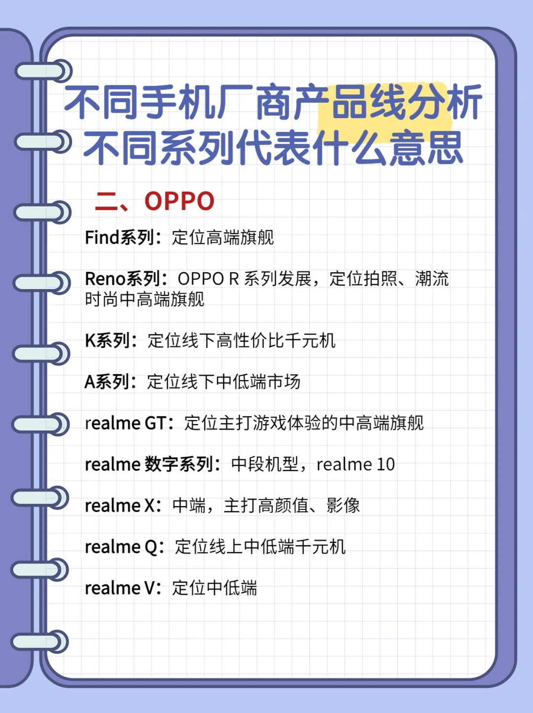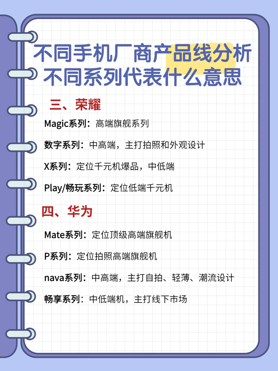 ✨最近又小伙伴问我,不同手机系列的定位如何区别,我总结了OPPO、vivo、苹果、华为、荣耀、小米、三星(排名不分先后)七大厂商的机型系列,给大家分享。 1️⃣旗舰机 价格5000+,定位高端全能均衡旗舰 2️⃣中高端手机 价格3000-5000,在某一个方面影像、潮流外观、游戏等有很强的优势 3️⃣中端手机 价格200-3000 ,主打性价比,但是配置会有刀法 4️⃣低端手机 价格1000-2000,也称千元机,主打超级性价比,只能满足日常使用需求,比如老人小孩使用