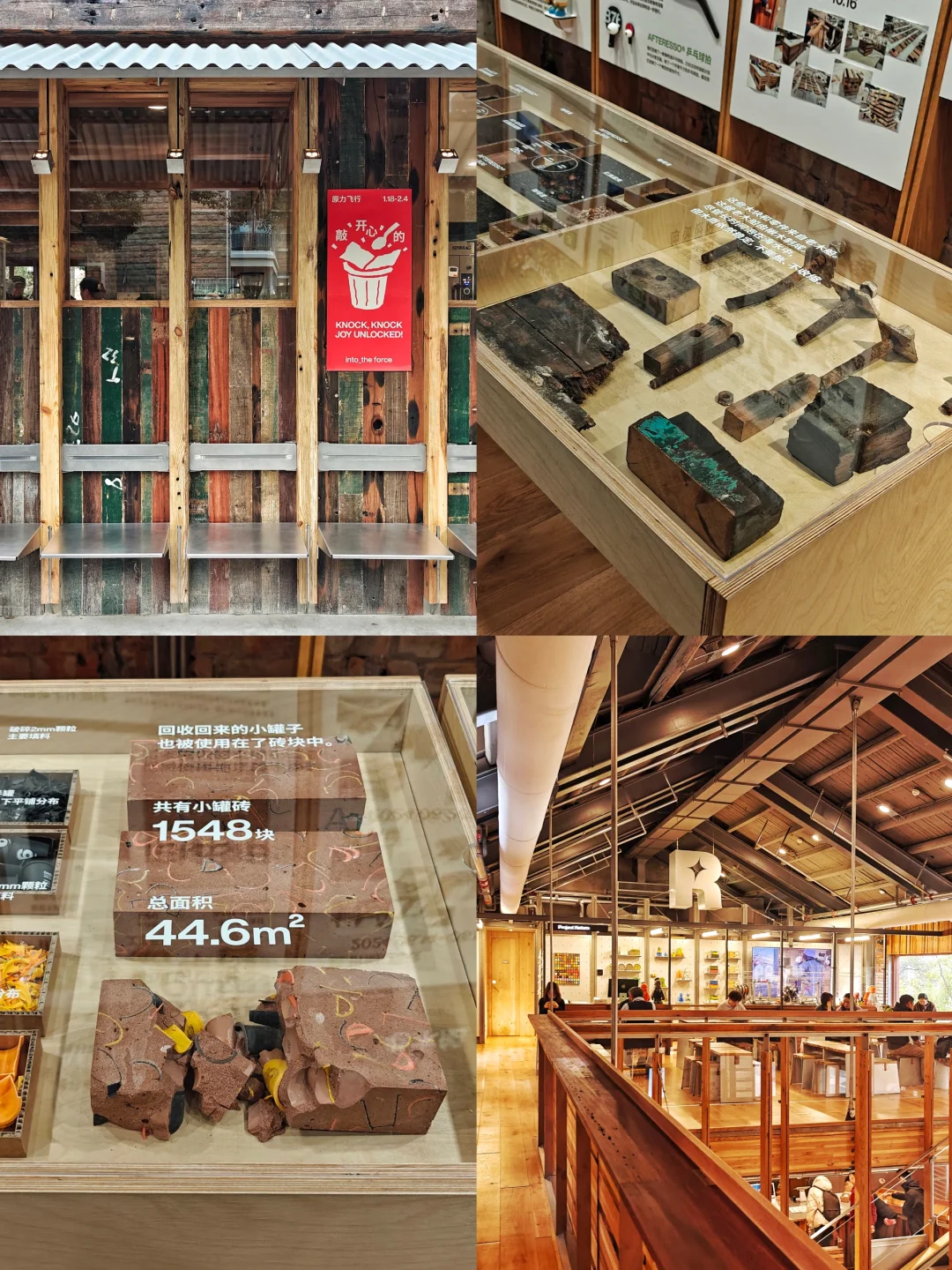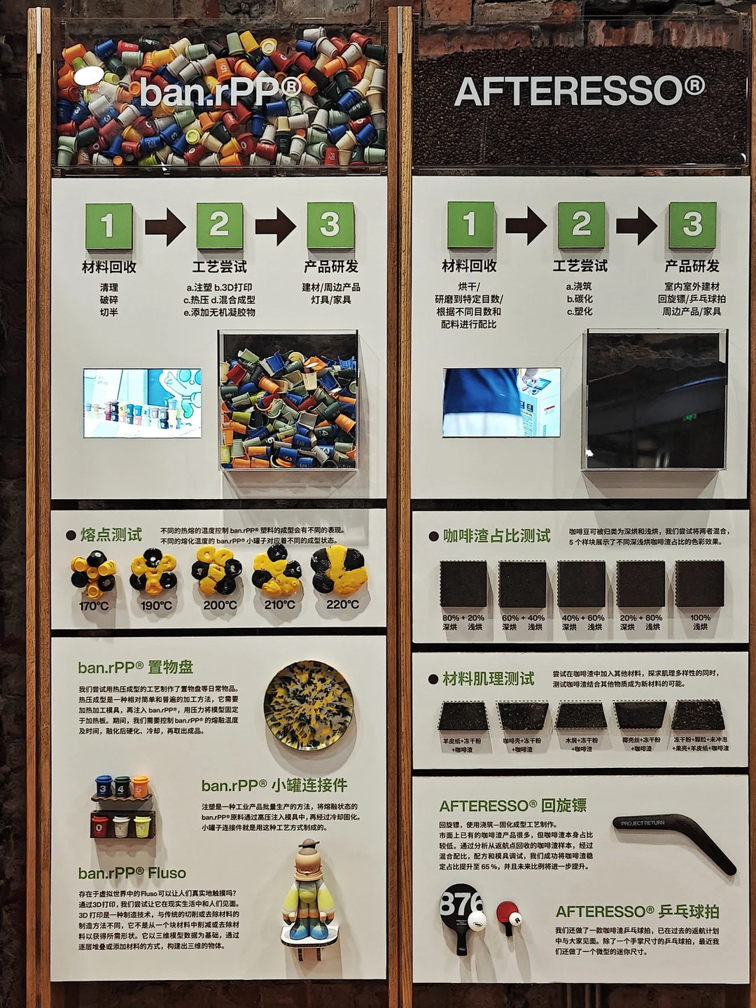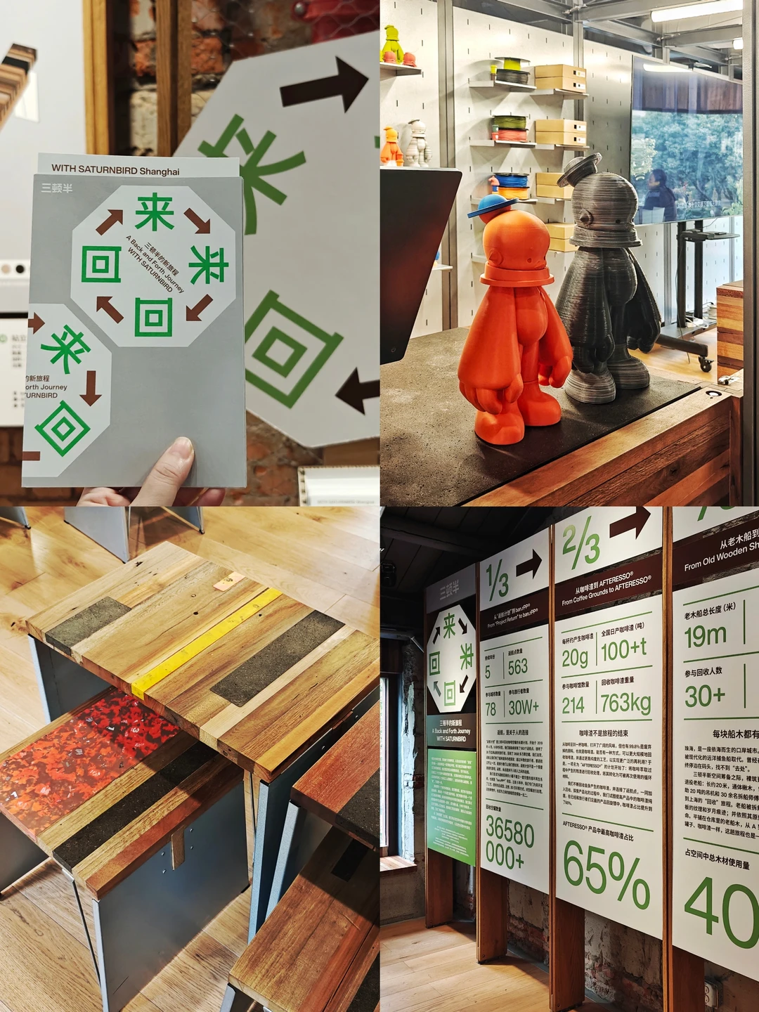 ♻️二层一侧的“来来回回”主题展览记录了“三顿半”对循环材料的探索。另一侧的“返航计划”区域则能看到用回收的包装材料3D打印制作潮玩的工坊。