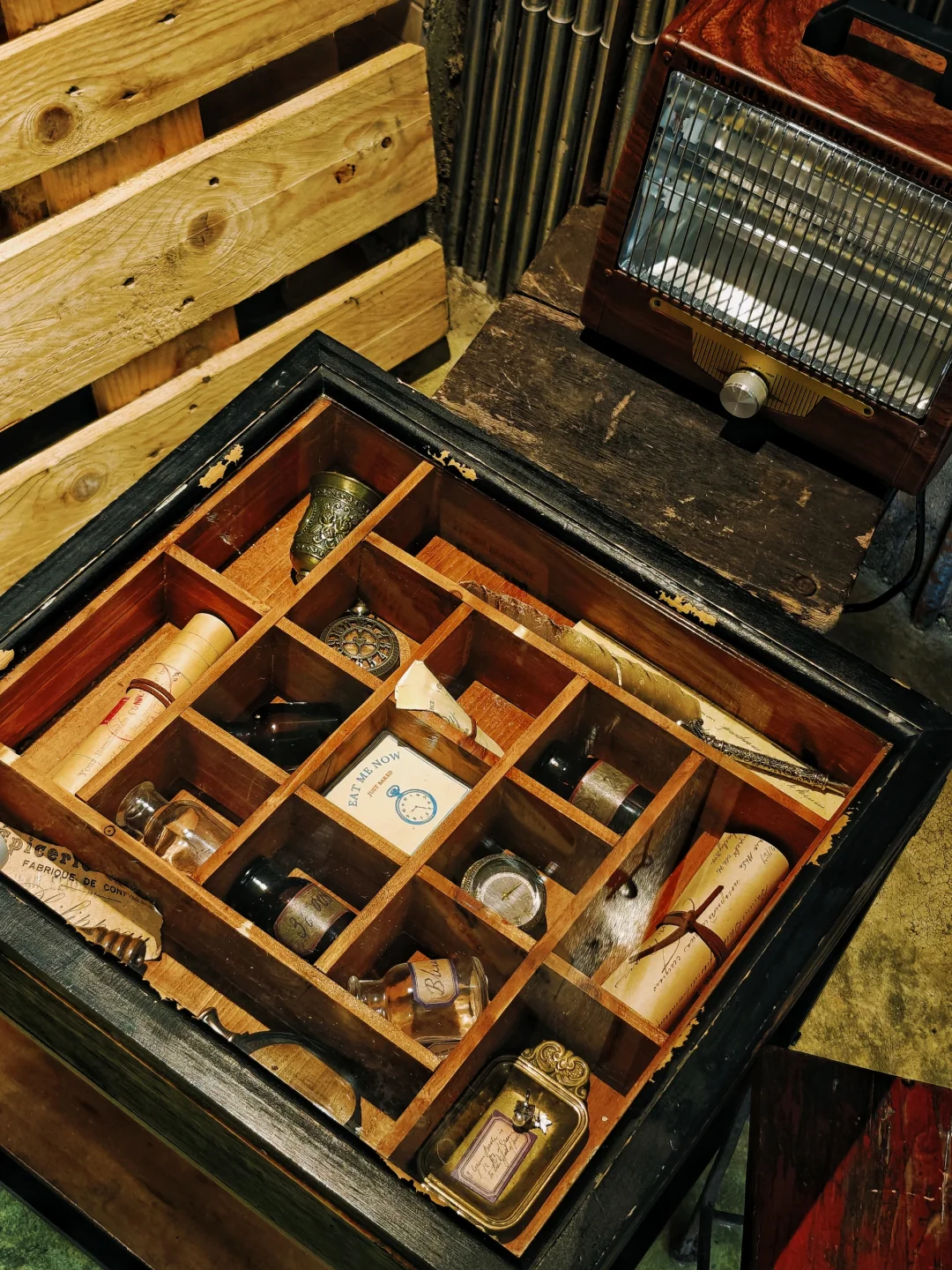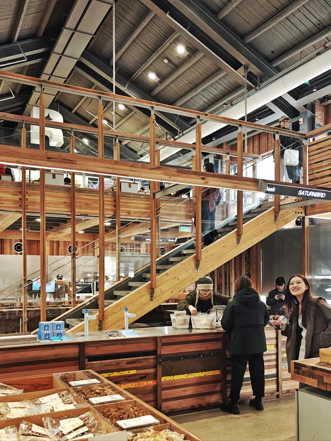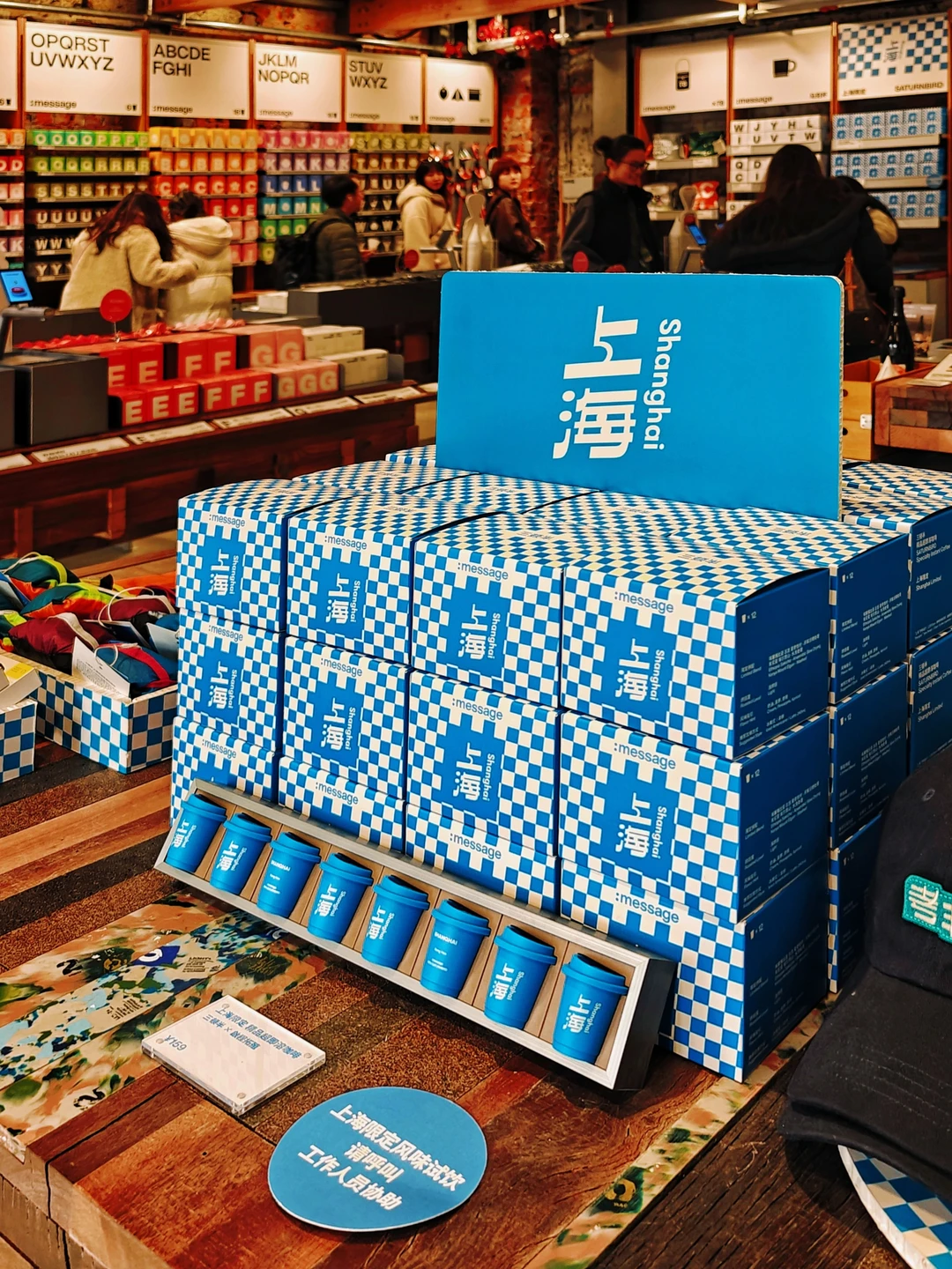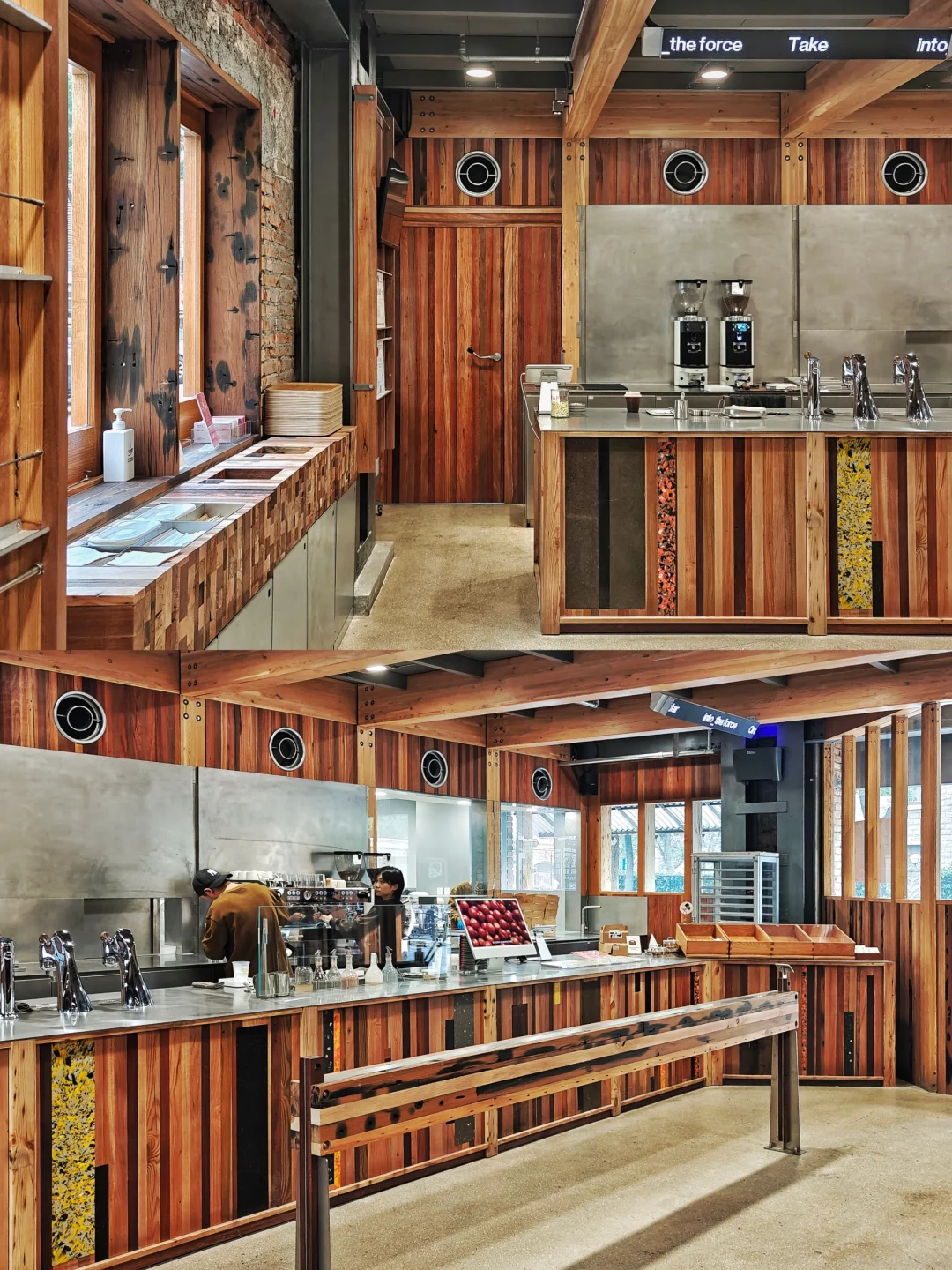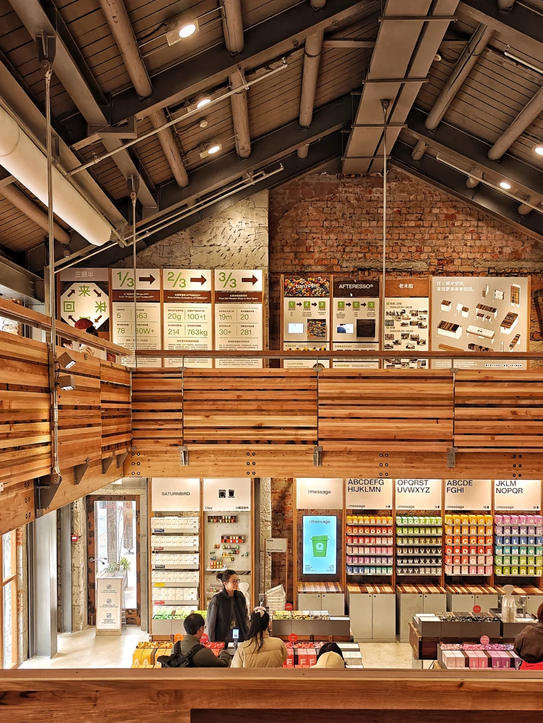 🧱独特的砖墙、房梁和家具桌椅,材料选用品牌回收的咖啡小罐子和咖啡渣,以及一艘退役捕鱼船上的老船木。占据C位的是上海限定联名咖啡系列,包含咖啡产品以及生活方式类周边产品。