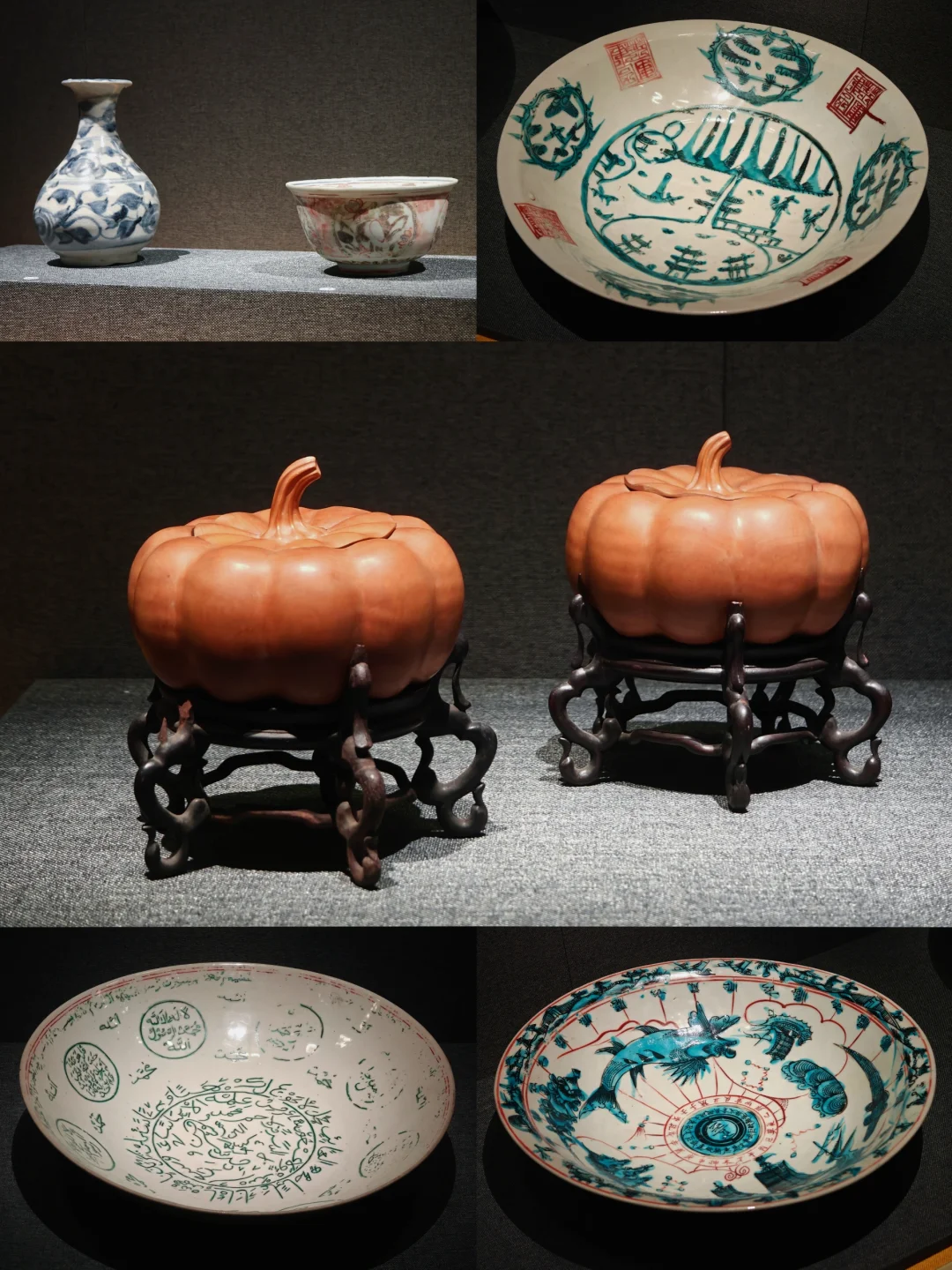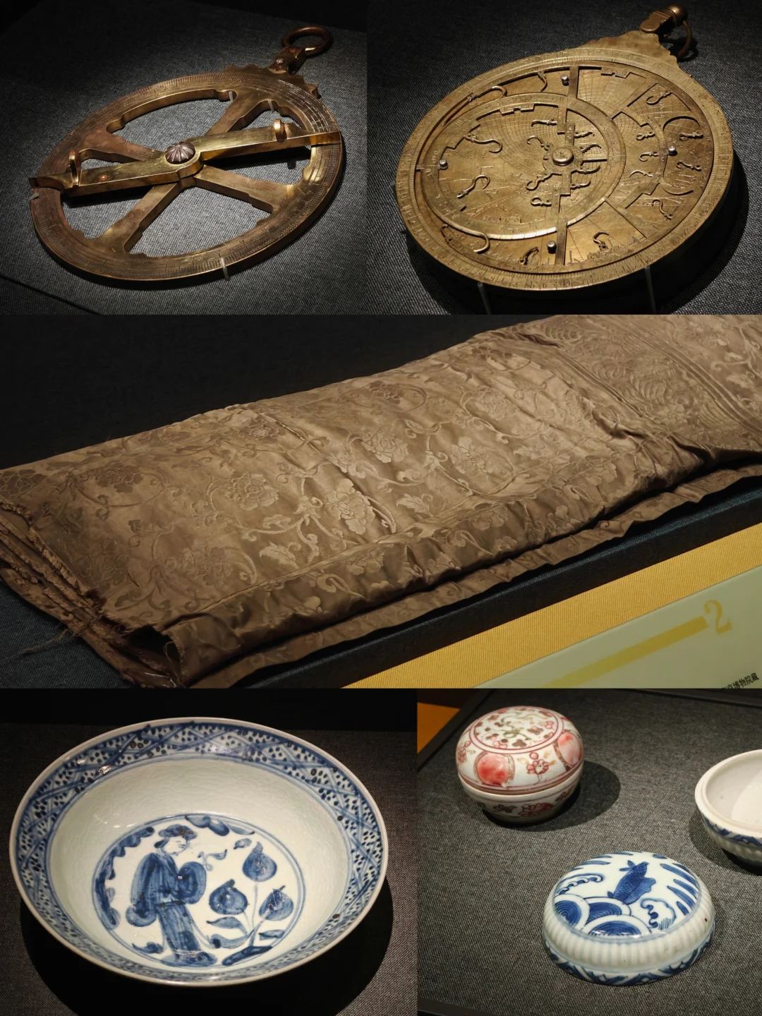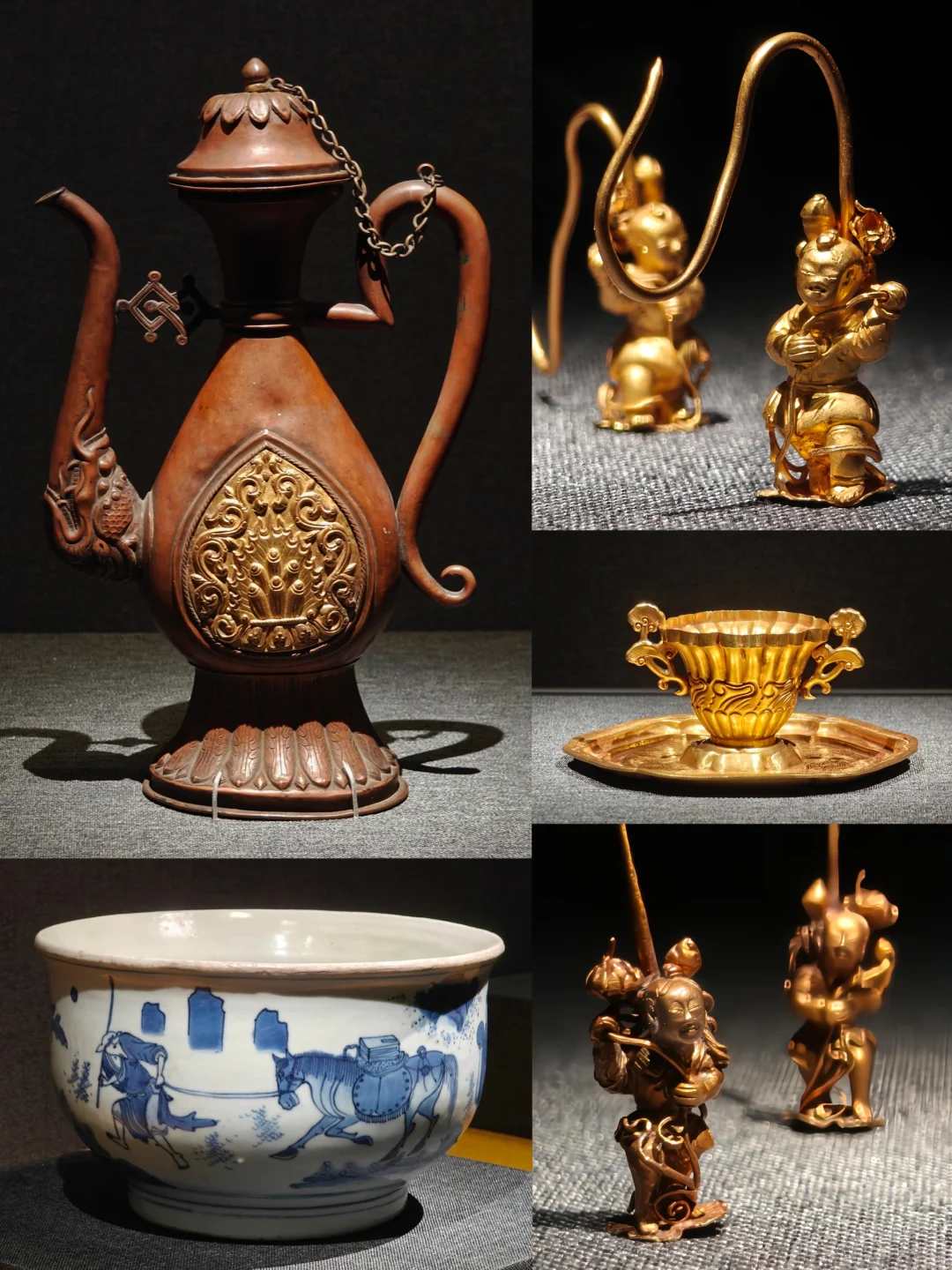 镇馆之宝——釉里红岁寒三友图梅瓶,应为永乐帝赏赐安成公主之物。明初的釉里红发色较灰暗,器型硕大,烧造工艺要求高。有盖之同类器物仅此一件且保存完整,殊为珍贵。