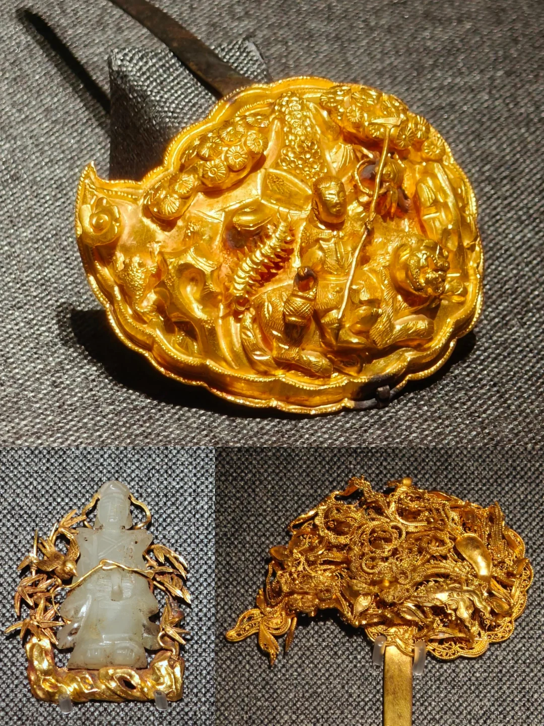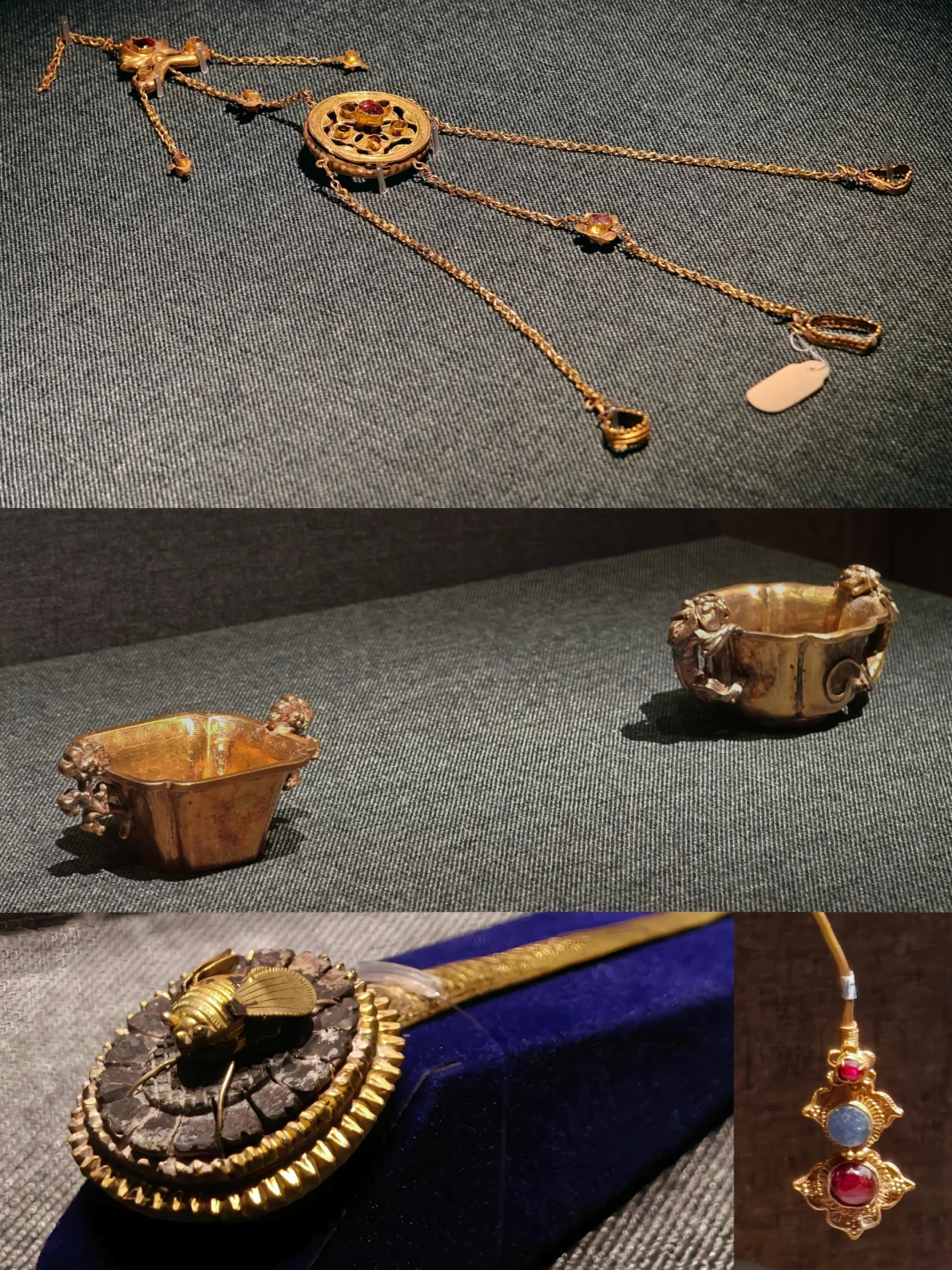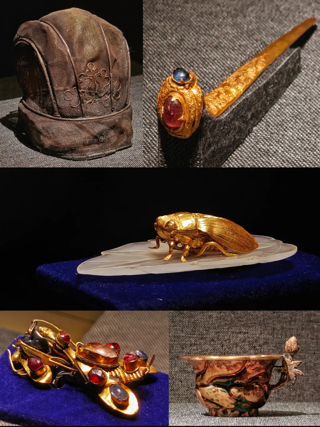 蝉是“朽木化成” 可“破茧重生”,它不沾染尘世间的污浊又有吉祥长寿之意。镇馆之宝金蝉玉叶,应是一支发簪,形神毕肖、金光闪耀的蝉栖憩在玉叶上,制作技术十分复杂。玉叶为新疆和田羊脂白玉,厚度仅2毫米,叶脉分明,细薄呈凹弧状;金蝉含金量据说达95%,蝉翼厚度仅为0.2毫米。