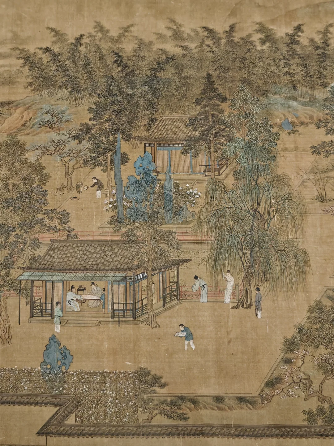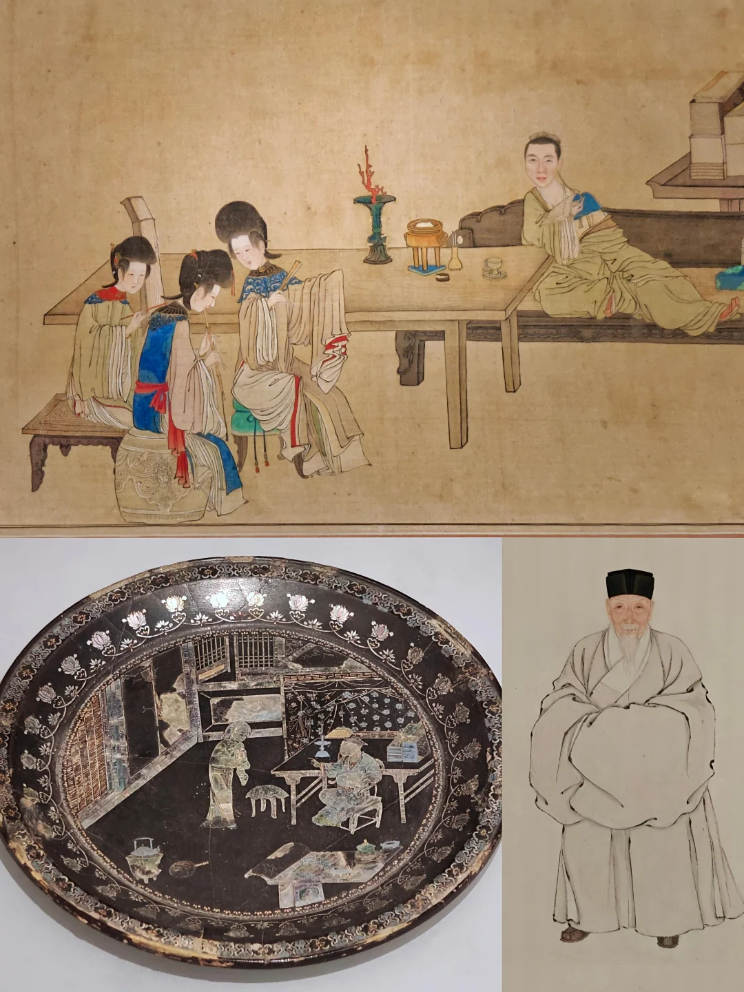 产自西洋等地的珊瑚来到中国,被视为珍宝,成为佛教七宝之一,也成了文人案头流行的用以清供之赏玩物。明清绘画中以珊瑚枝插瓶作为陈设品的图像,常见于充满各类高级陈设器物的文人雅集图和博古图之中,如展中清代的《 禹之鼎乔元之三好图卷》。