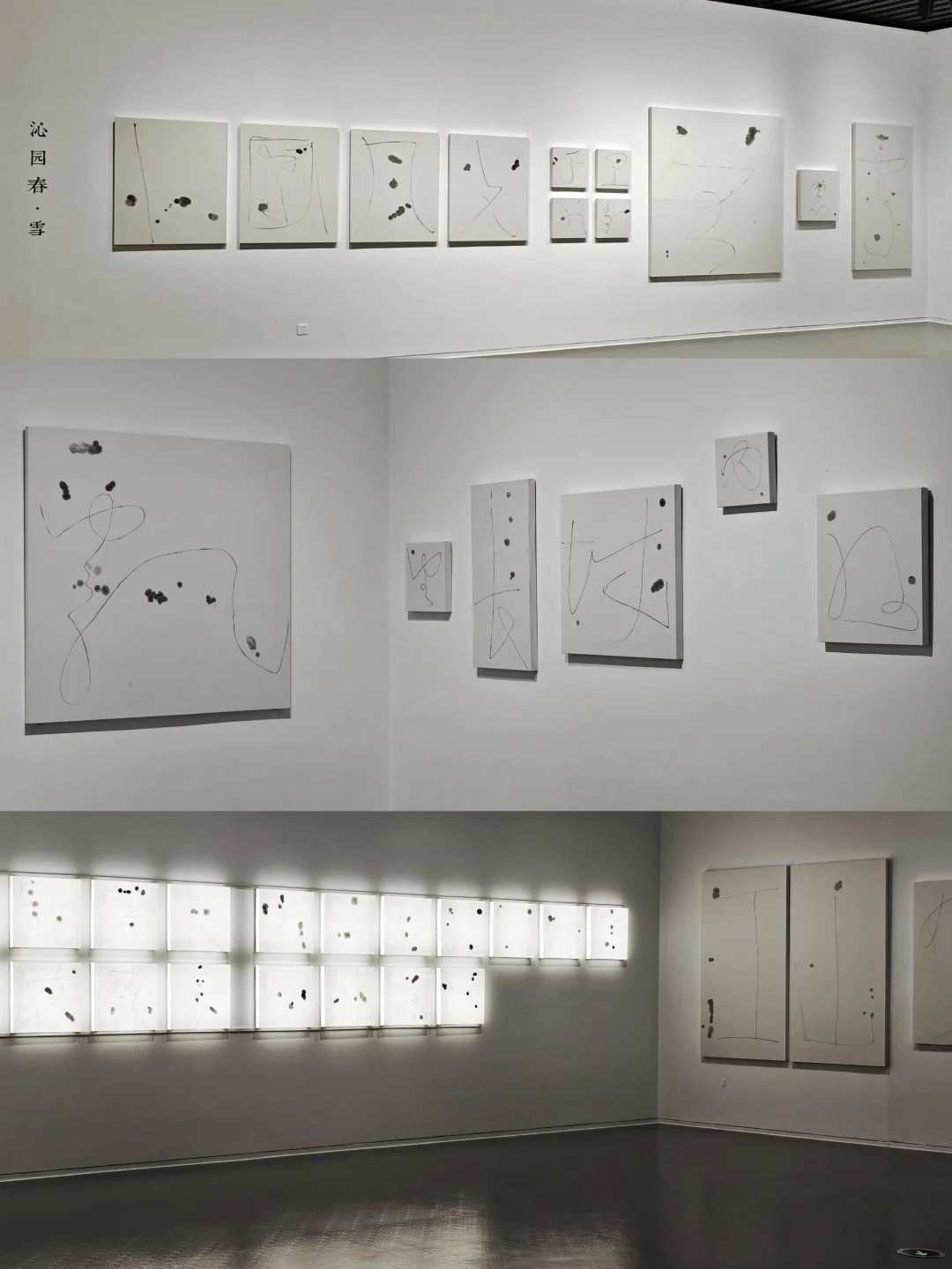 🖌️4展厅:书法装置《沁园春•雪》,即使已经88高龄,艺术家仍旧敢于和善于变革,本次新创作的占据了一整个展厅的一组作品,每一个画框就是一个“字”。灵动多变的书法性线条,不止是一种形式或技法,更是传统文化的思想性和生命力体现。展厅中还有创作过程视频,可窥见陈老一如既往对艺术追求的激情。