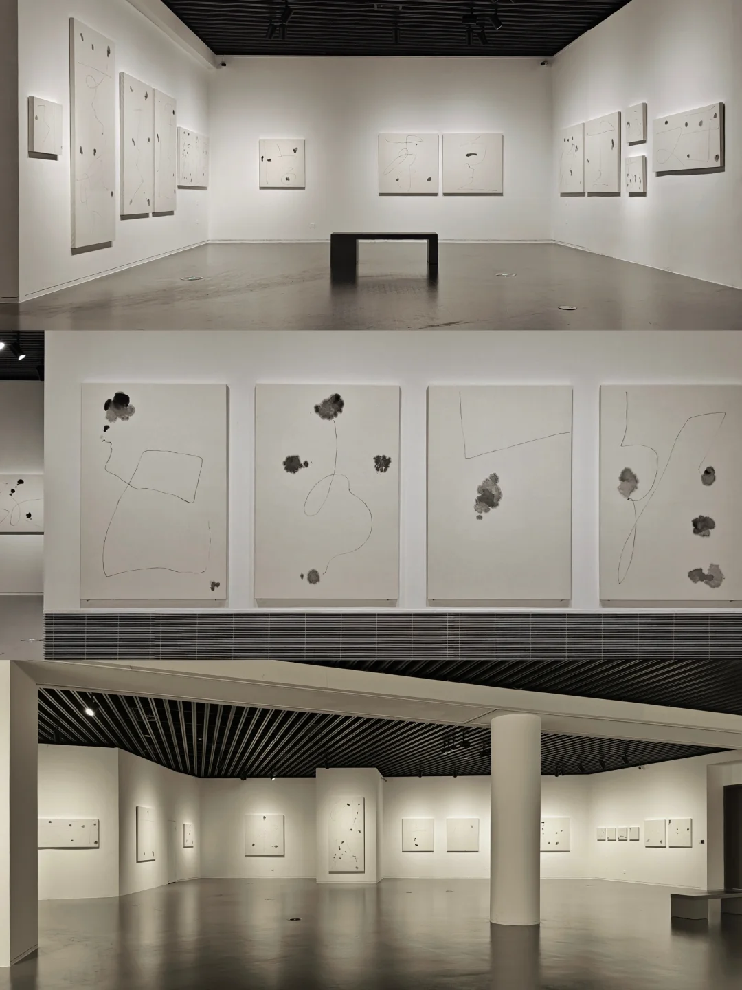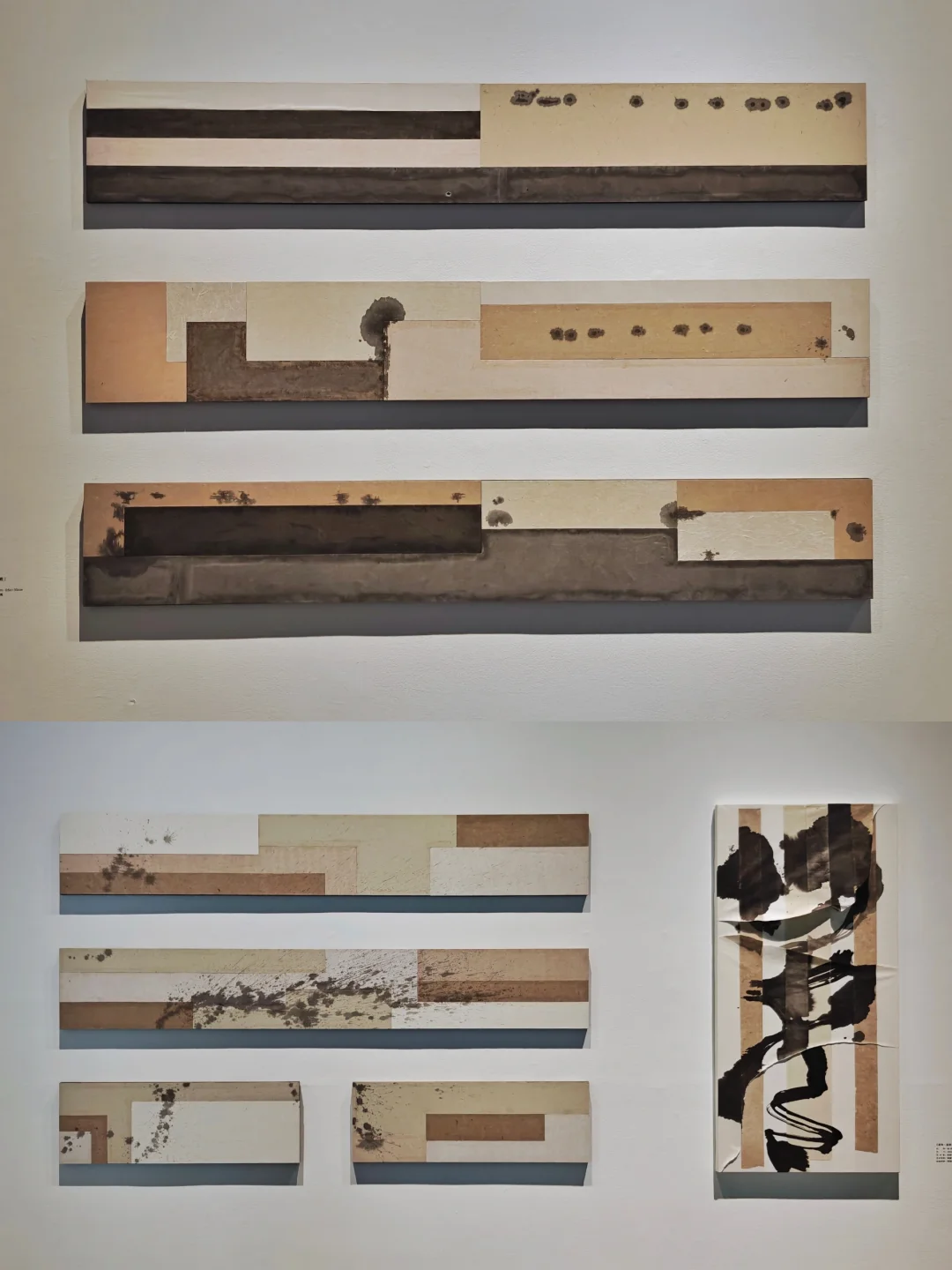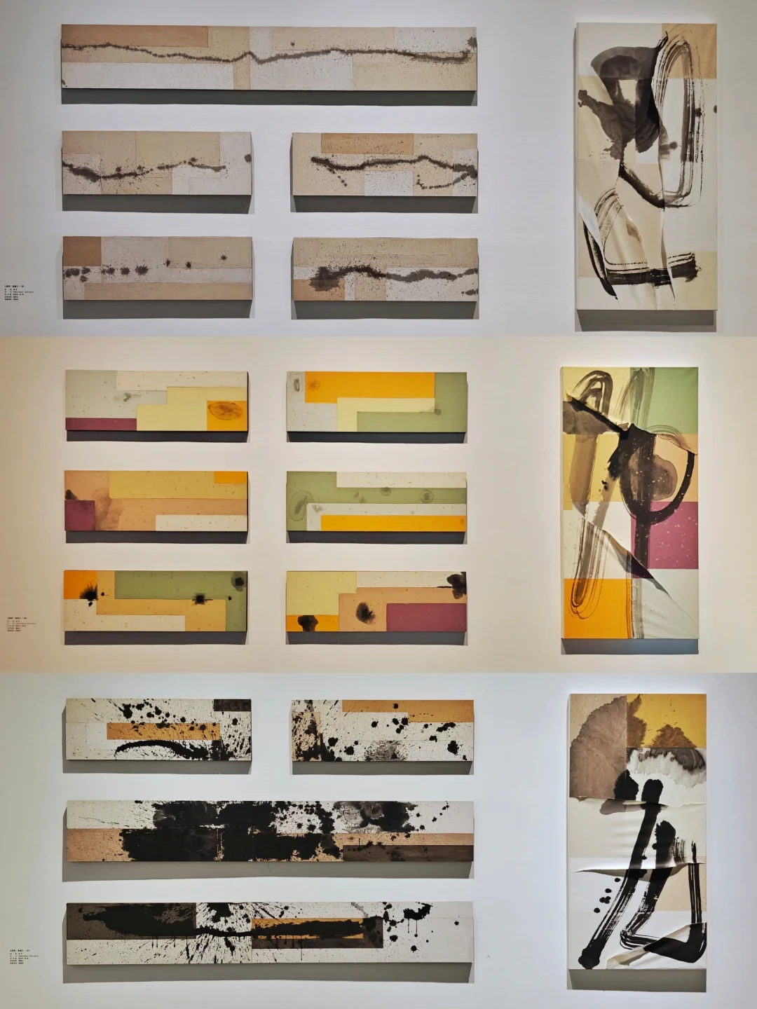 🖌️2展厅:书法装置《自然的痕迹》,“书化”实验作品,看似狂草飞舞,却辨不出是何文字,在此书法提炼为绘画创作的一个元素,类似于康定斯基论抽象画中点线面的元素构成,酣畅表达艺术家内心的律动,但也不拒绝绰约的文字身影带给人们暗示。而作为承载介质的不同宣纸似乎更像是主角,被配以了详细的介绍。