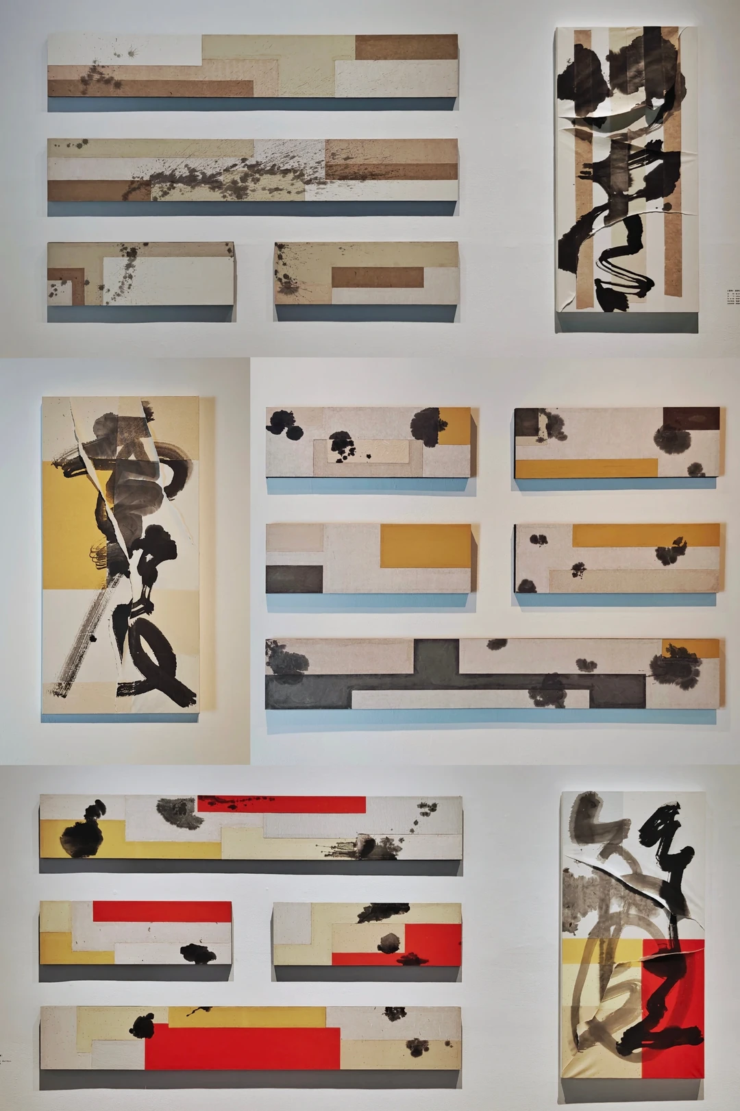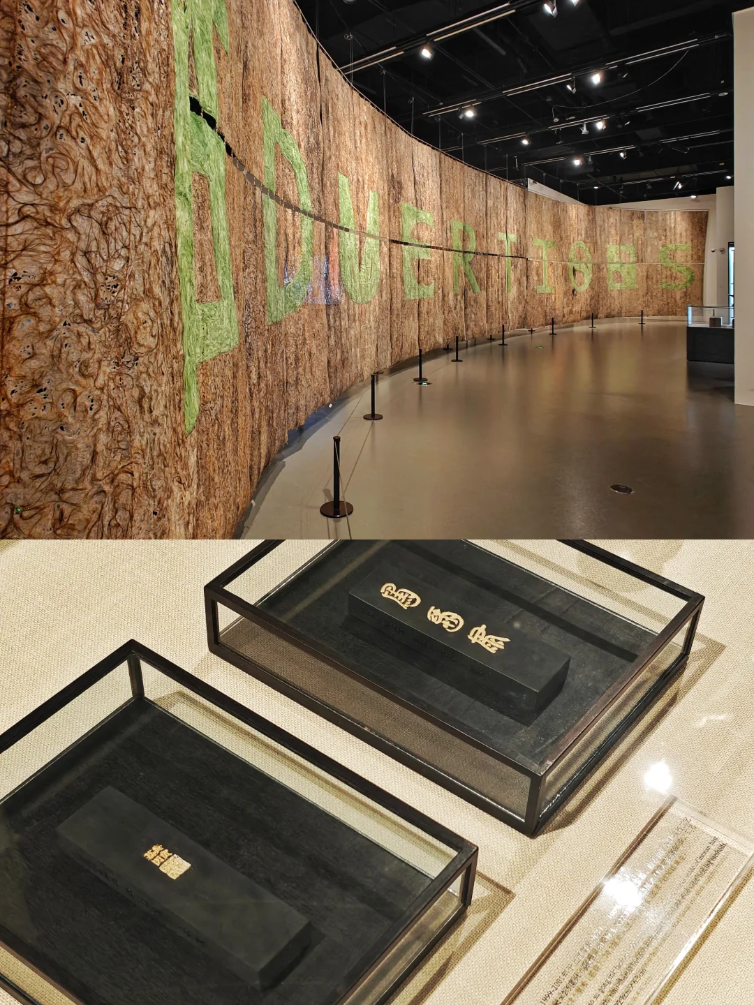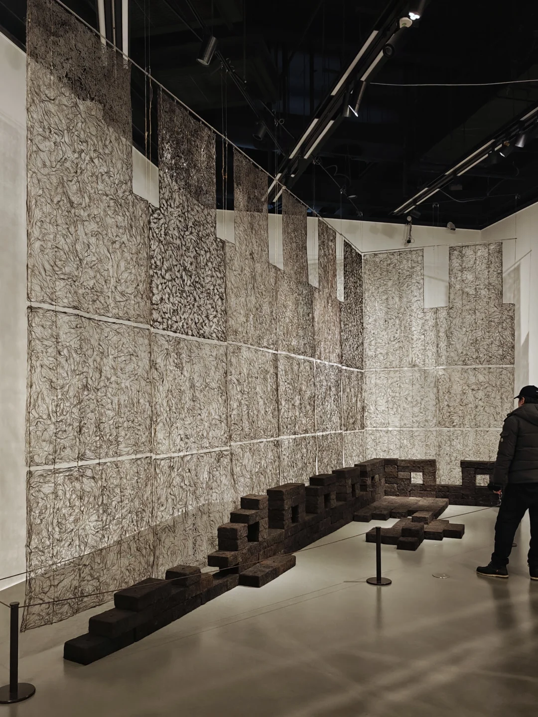 🖌️2展厅:书法装置《自然的痕迹》,“书化”实验作品,看似狂草飞舞,却辨不出是何文字,在此书法提炼为绘画创作的一个元素,类似于康定斯基论抽象画中点线面的元素构成,酣畅表达艺术家内心的律动,但也不拒绝绰约的文字身影带给人们暗示。而作为承载介质的不同宣纸似乎更像是主角,被配以了详细的介绍。