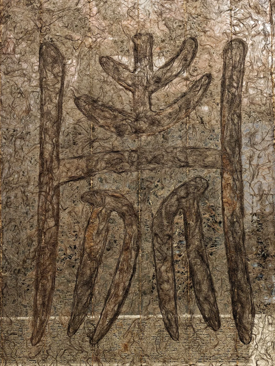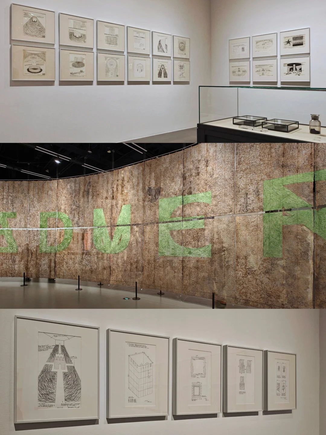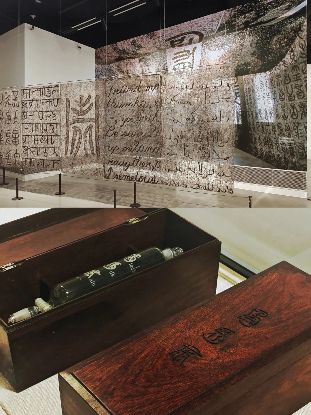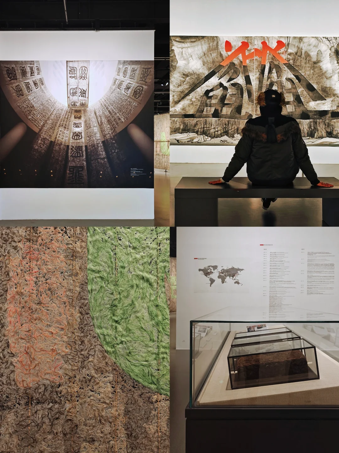 🖌️1展厅:徐冰创造假楷,谷文达则紧随其后造假篆。此次展出其持续30年的著名作品《联合国》中的一件装置,还包括手稿、作品历史回顾照片等资料。利用围绕中国文字所产生的文化理念,艺术家在30多个国家收集的不同民族的人类头发编制文字线性语言。
