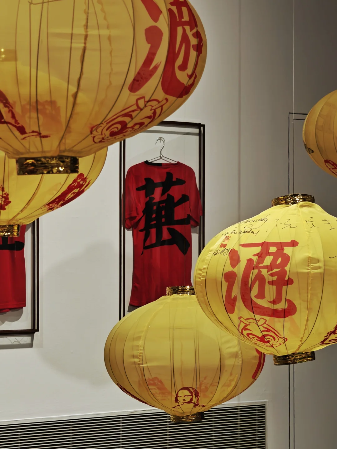 另外展厅一角还有2016年艺术家在民生美术馆个展上的大型艺术装置《天堂红灯|上海站》以及围绕此装置策划的行为艺术《天堂红灯上的签语未来》的图片和实物资料。