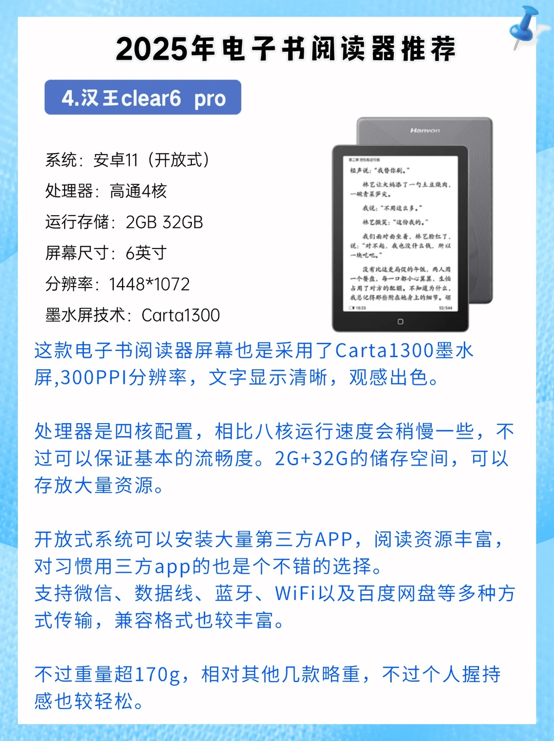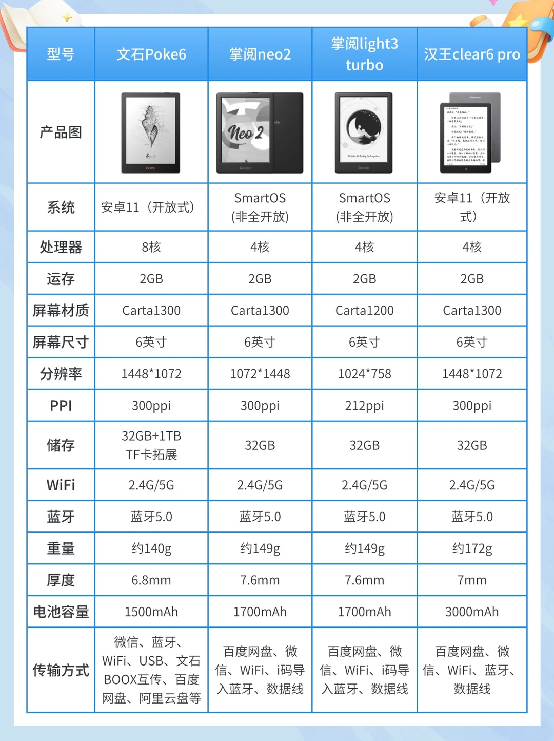 💡文石Poke6、掌阅neo2、掌阅light3 turbo和汉王clear6 pro。