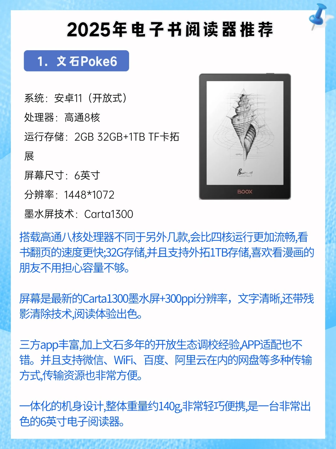 👉文石Poke6阅读流畅度、三方app使用体验表现更好,尤其是搭载了某些品牌大几千旗舰机型8核处理器,非常值得推荐的一款。