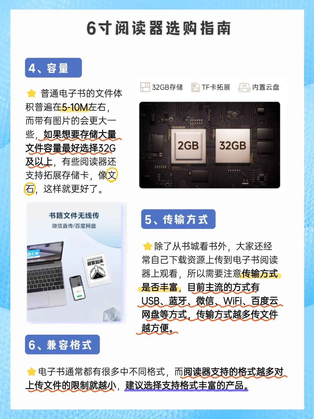 上传电子书通常都有很多中不同格式,而阅读器支持的格式越多对上传文件的限制就越小,建议选择支持格式丰富的产品。