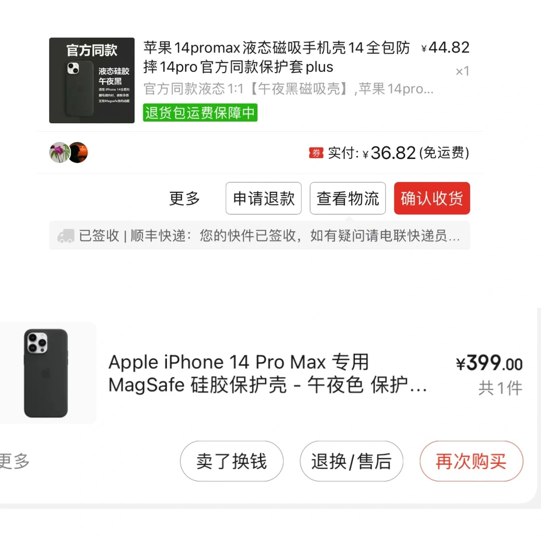 本人自费买了某东399元和某多的39元的苹果14ProMax午夜色手机壳,下面说下对比体验[飞吻R] 1、手机壳外观和内部可以看到官方的壳颜色更浅,然后外壳包裹镜头部分官方壳颜色更深一些,华强北的壳内部绒毛更粗糙,其他部分看不出差别。 2、外包装上看,官方外包装的更厚一些,且外观颜色更浅一些,官方的触感厚实 3、手感上还是官方的壳子比较软一些,和手机更贴合。华强北更厚,有点难装。 总结就是外观其实差别不大,手感和手机贴合度差别比较大。 大家会怎么选择呢?评论区留出的答案